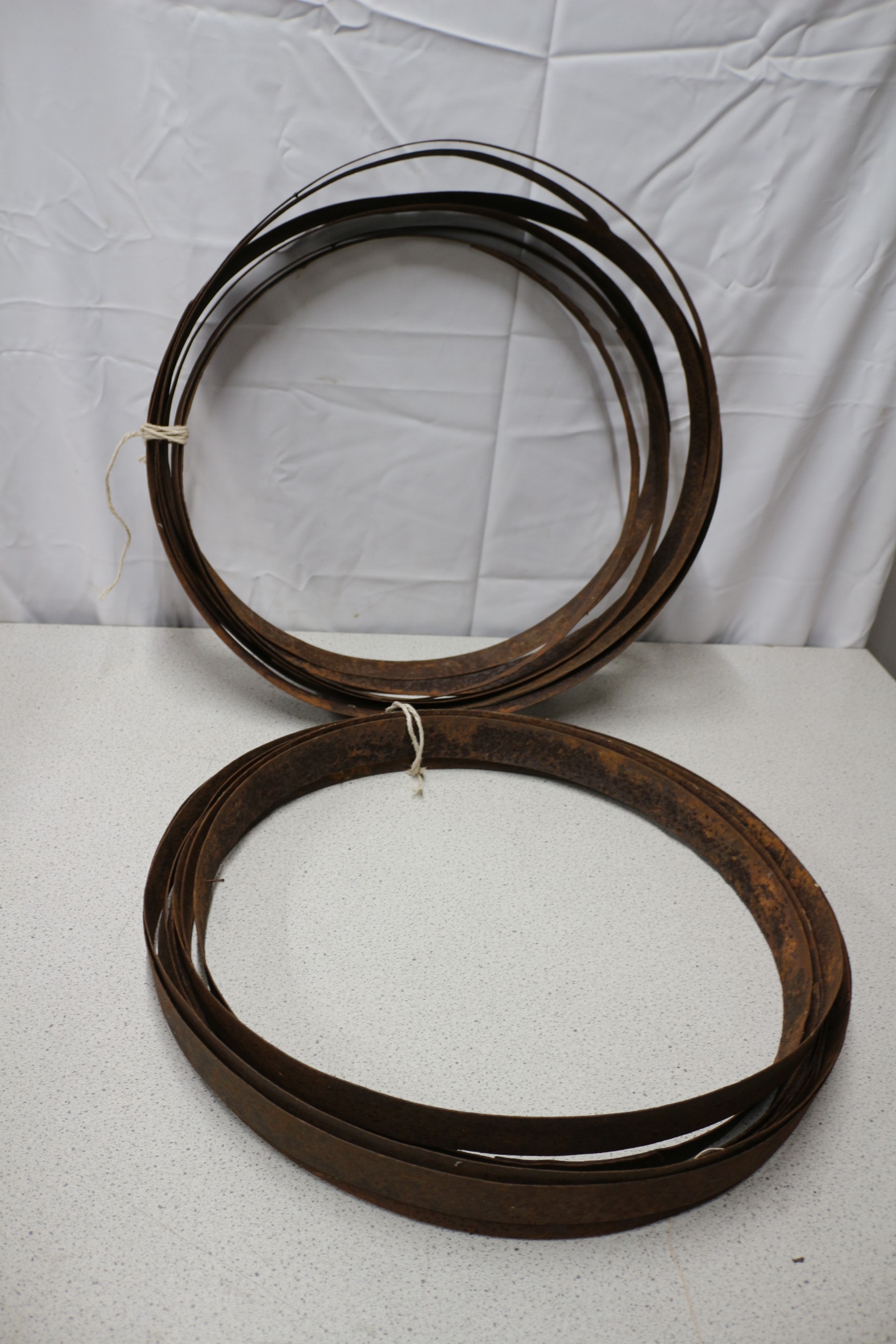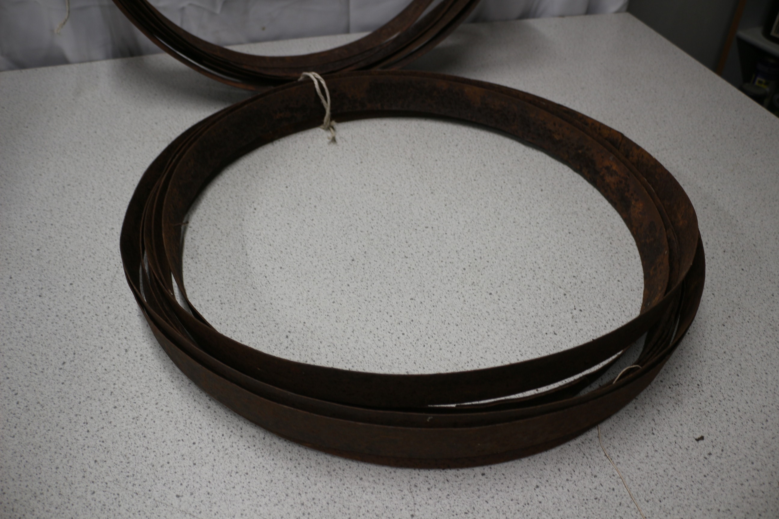 Two bundles of multiple rusty brown, coiled metal bands, each secured with string, are present.