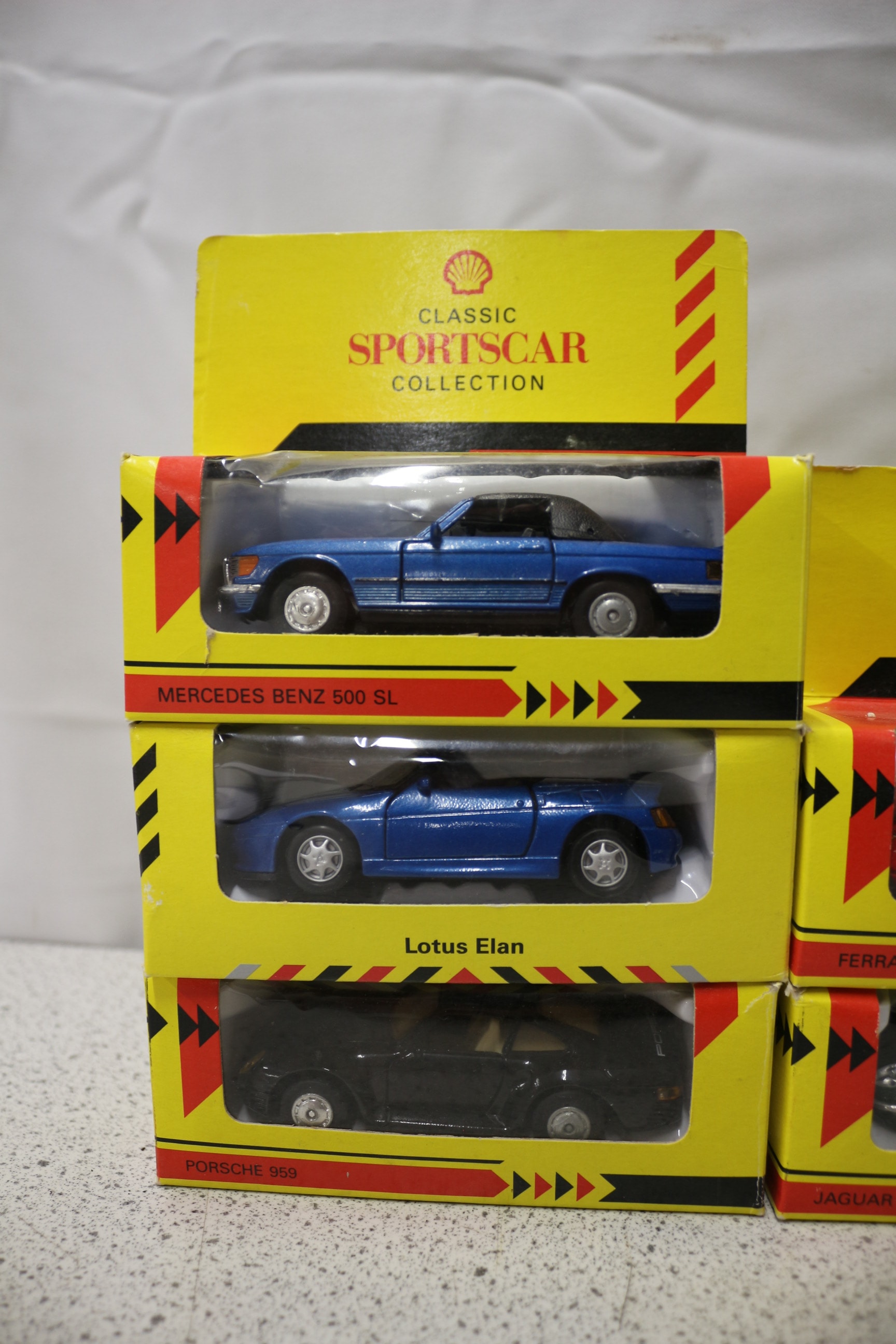 A collection of ten Shell Classic Sportscar Collection 1:43 scale diecast model cars, each in original packaging.