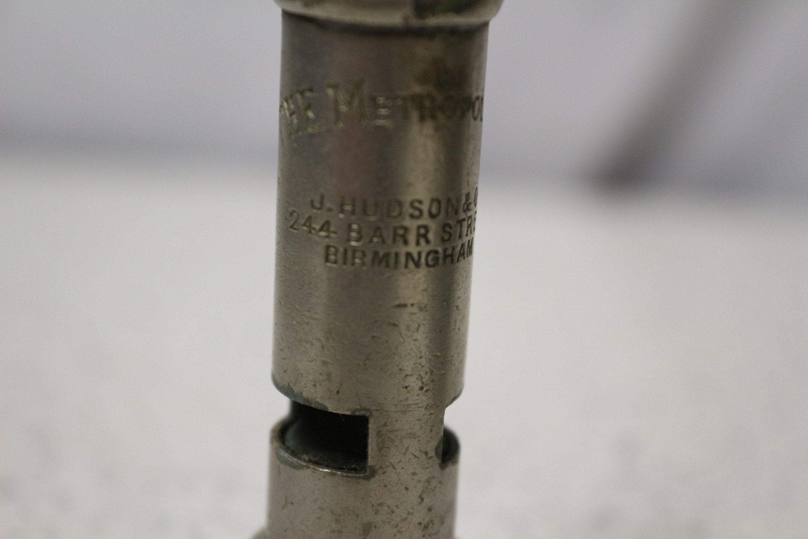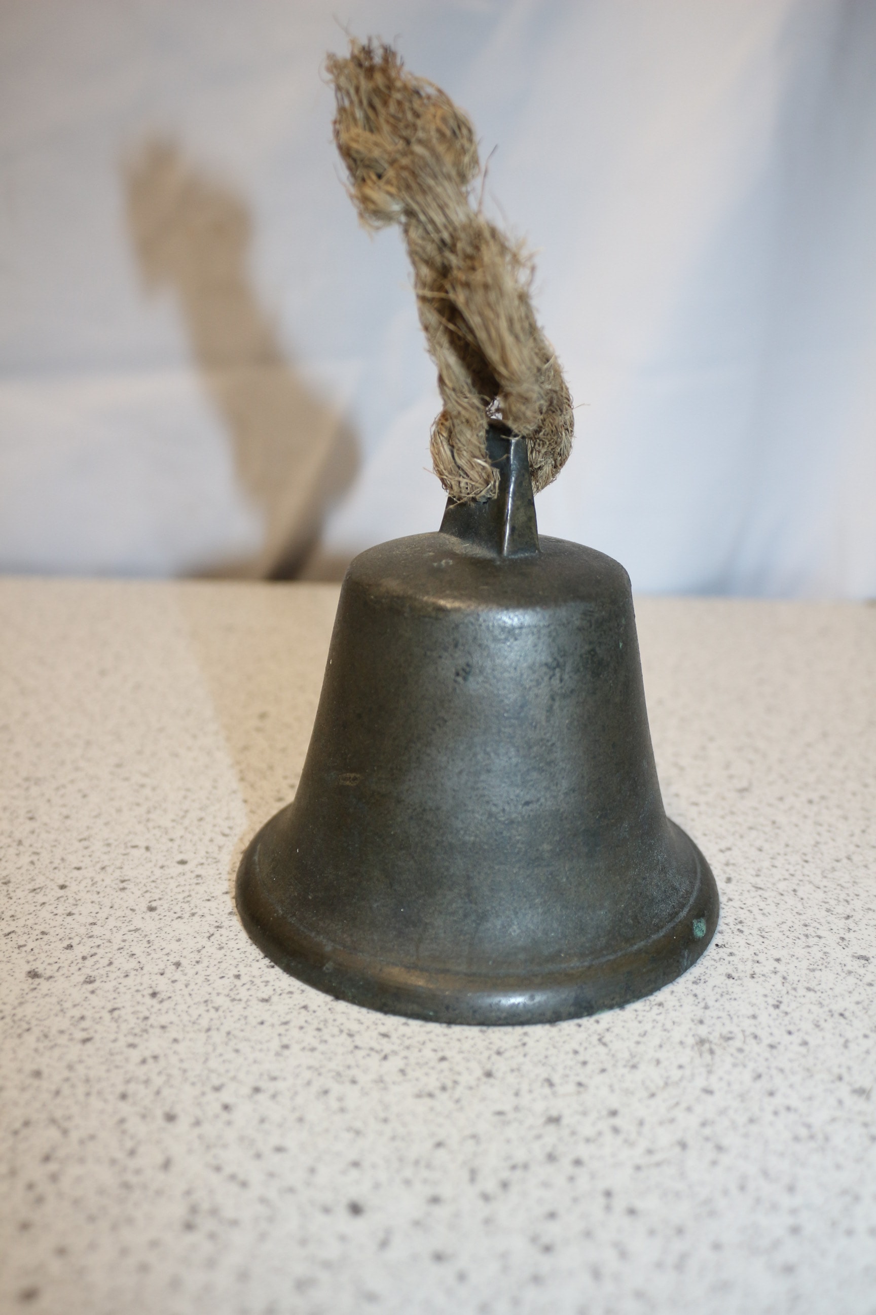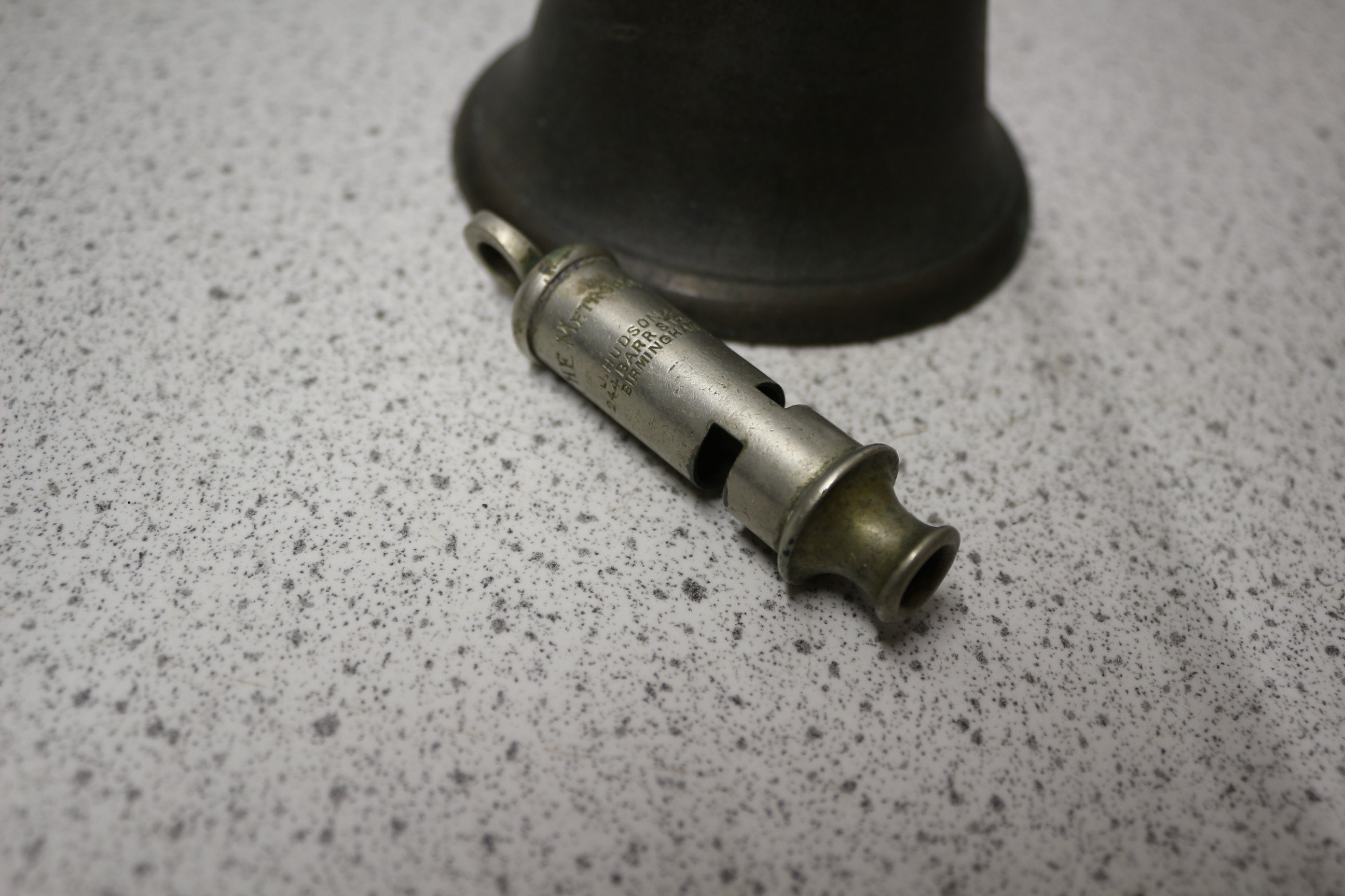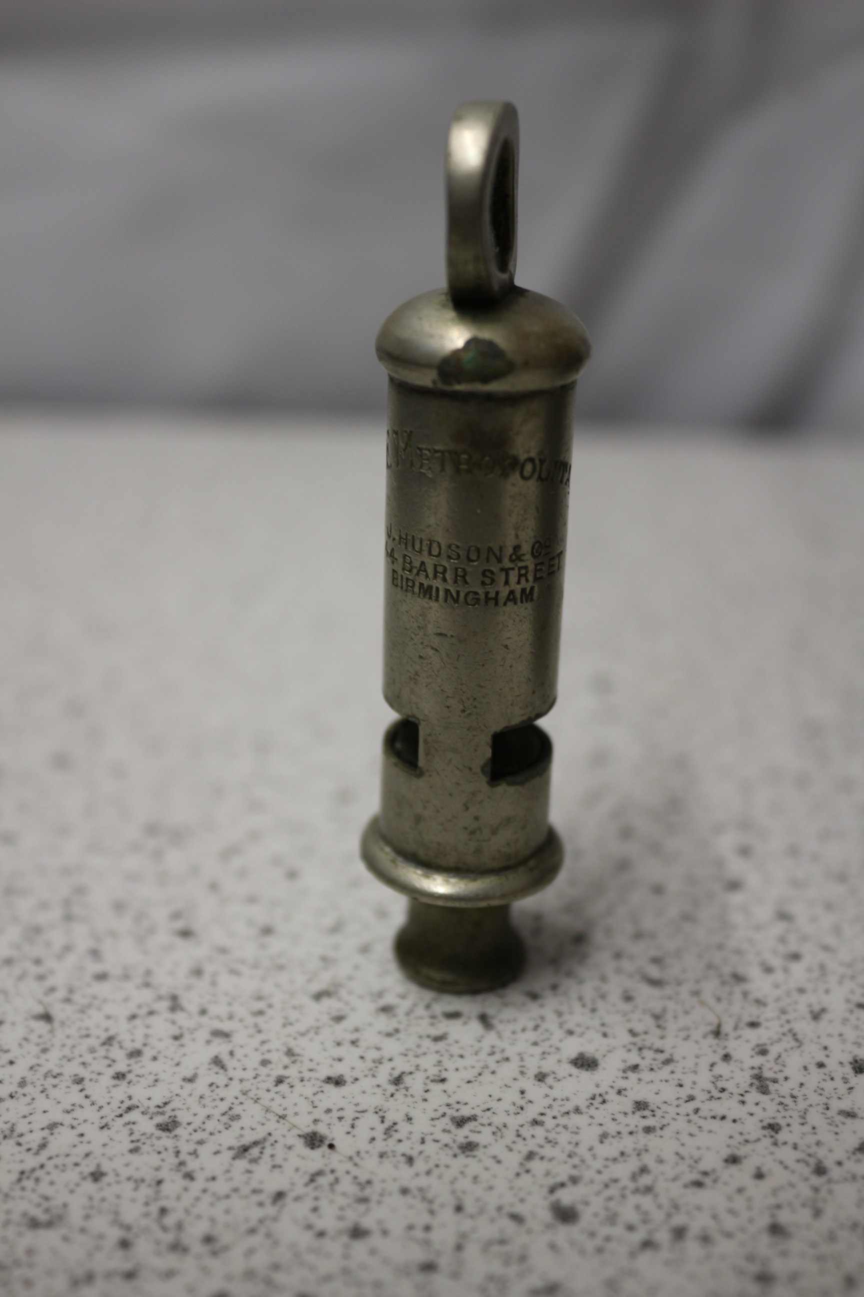 A single cast iron bell with a natural fibre rope handle accompanies a single silver-toned metal whistle with a brass mouthpiece, inscribed “THE METROPOLITAN”, “J. HUDSON & CO.”, and “BIRMINGHAM”. Bell 10cm tall