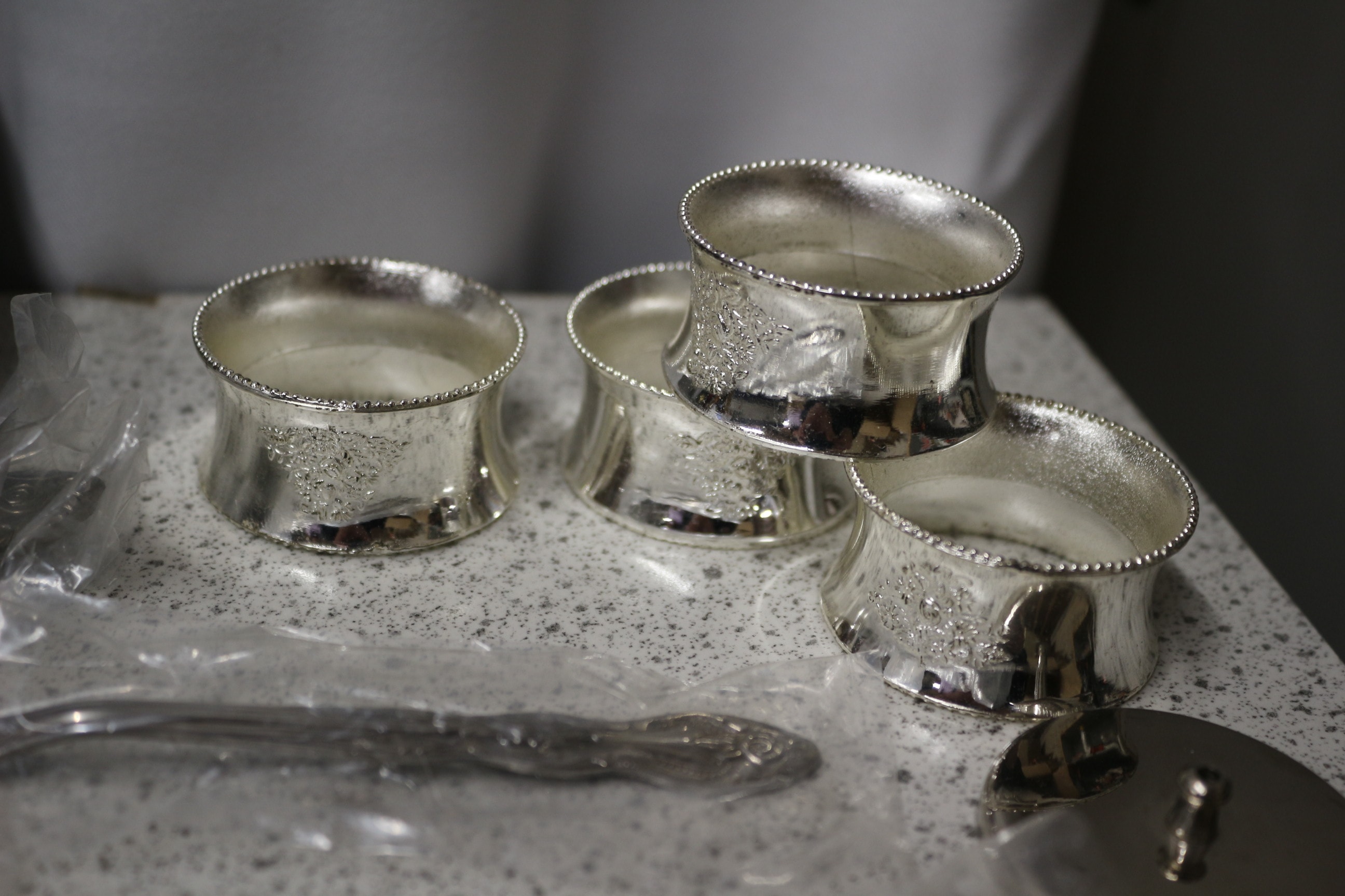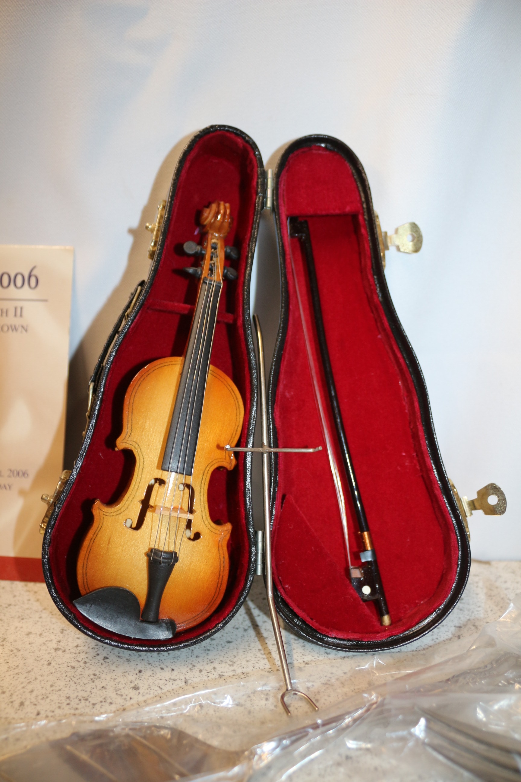 The lot includes a Queen Elizabeth II 80th Birthday Crown coin by THE LONDON MINT OFFICE, a miniature brown violin with bow in case, silver-coloured forks, four silver-coloured embossed napkin rings, a SEKONDA 18 JEWELS pocket watch, a ceramic dish, and a small black-bladed knife.