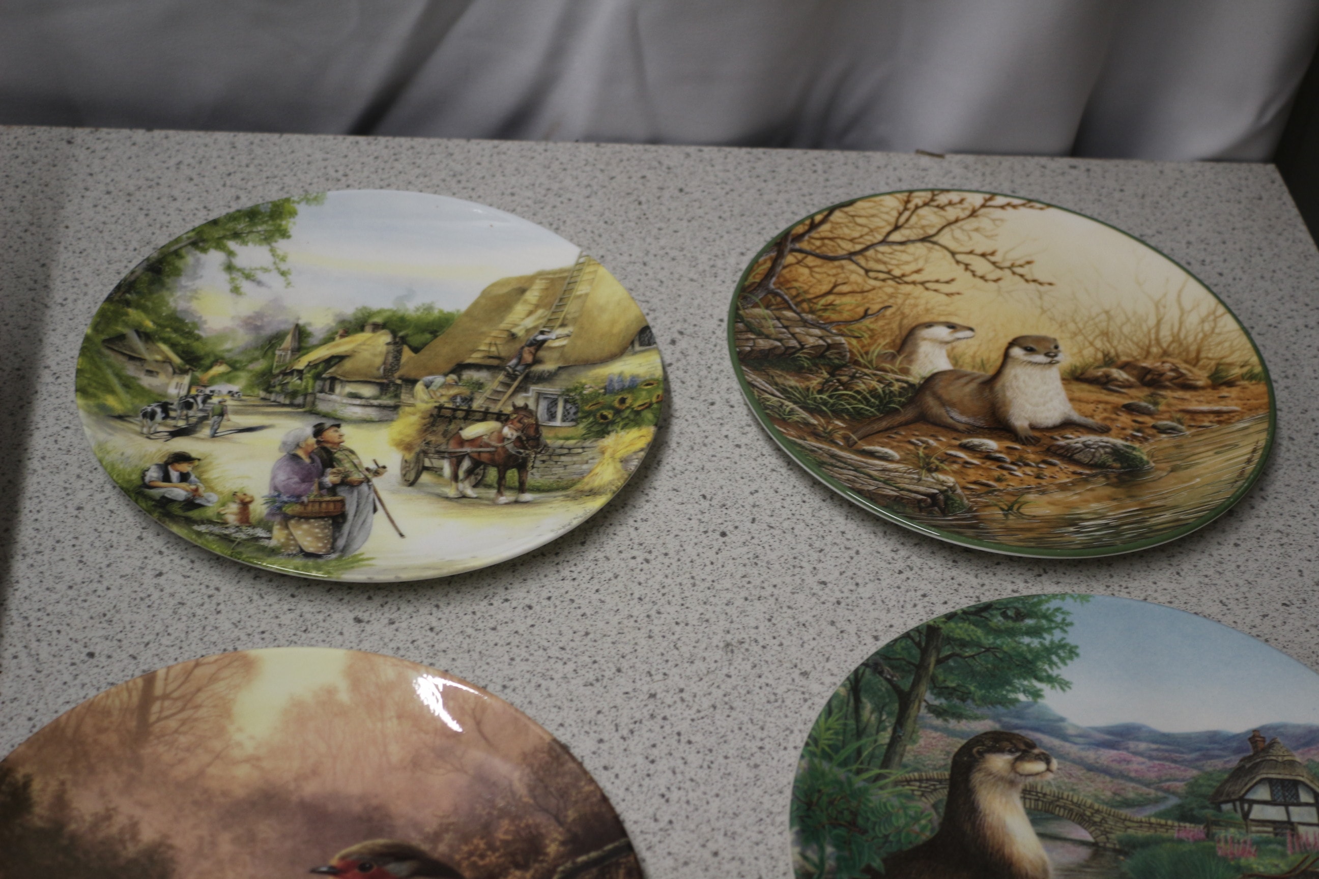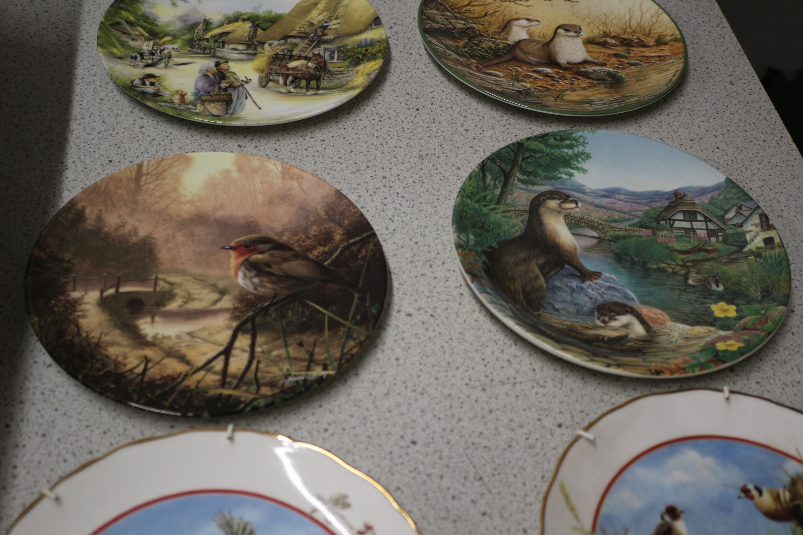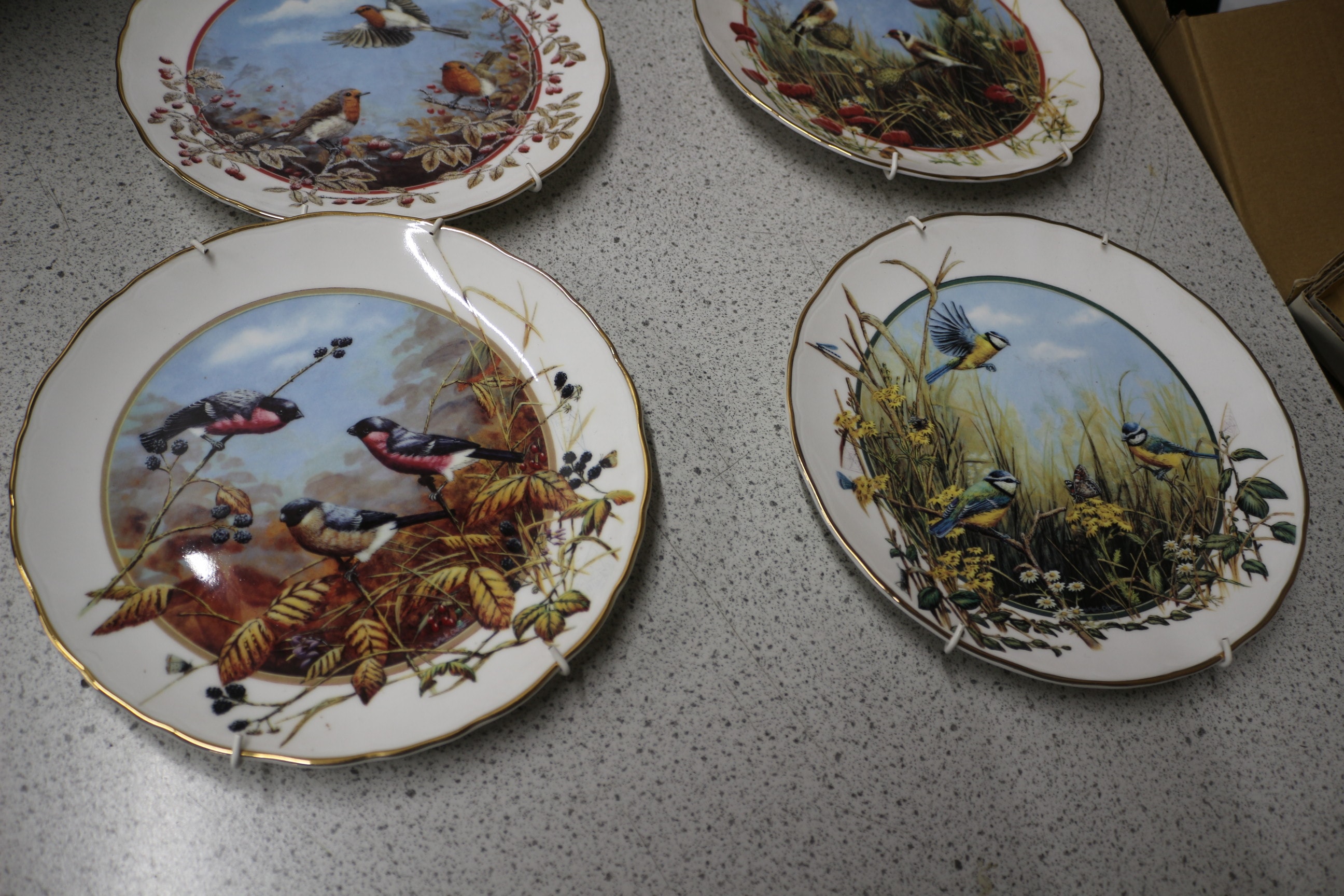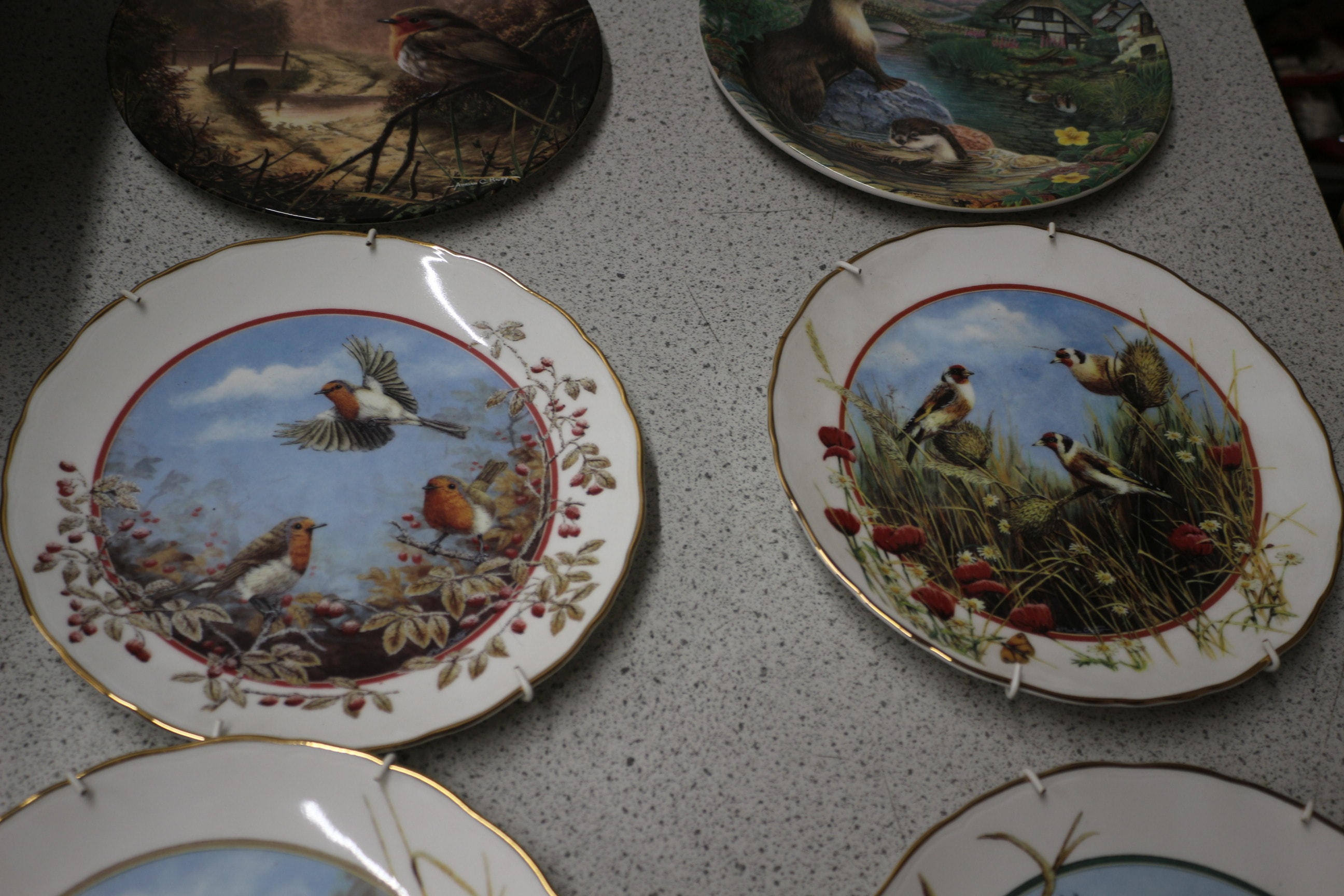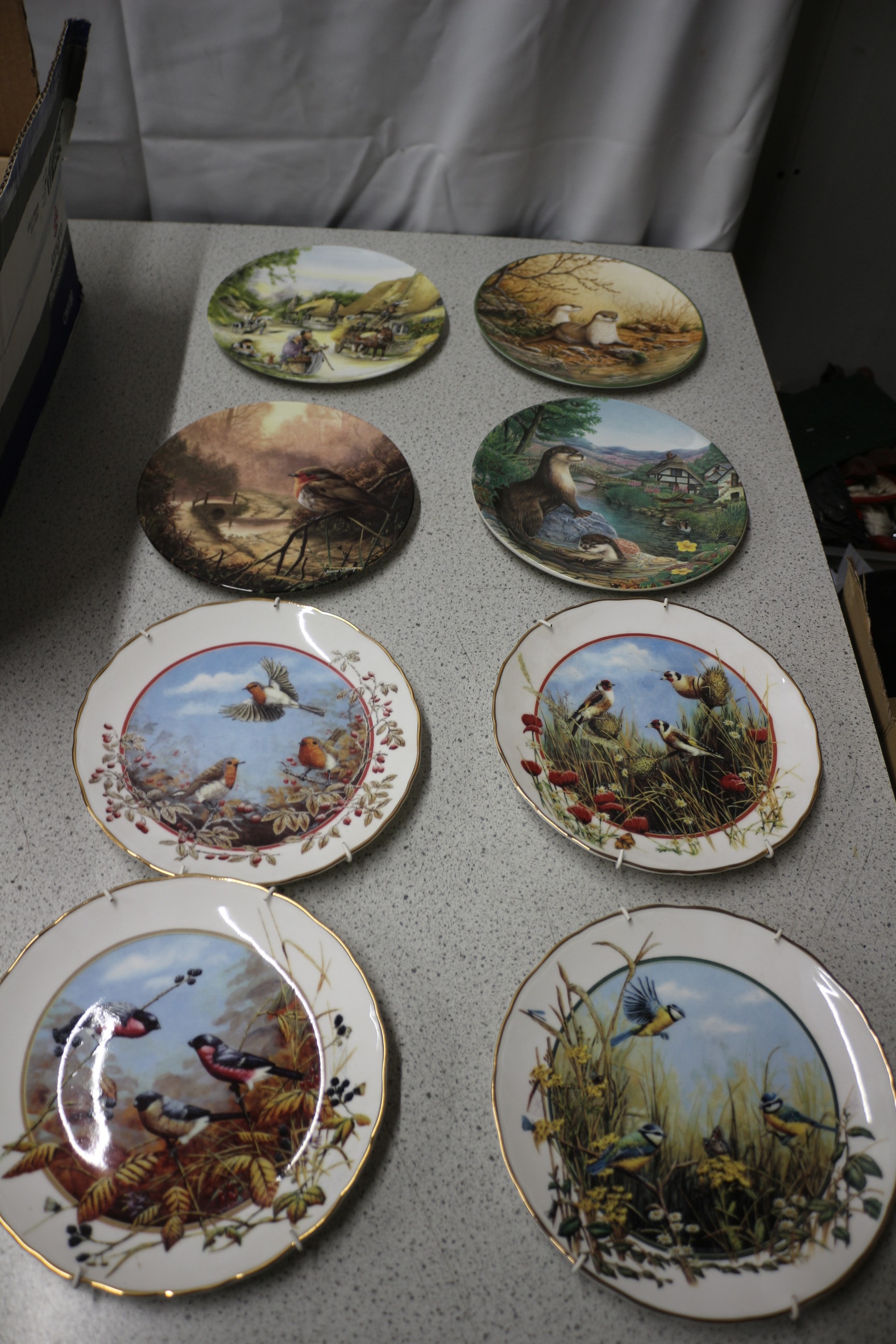 Eight decorative collector’s plates, four depicting rural or animal scenes in green, brown, and blue, and four depicting groups of small birds in foliage with prominent gold rims in blue, red, and green by Royal Doulton