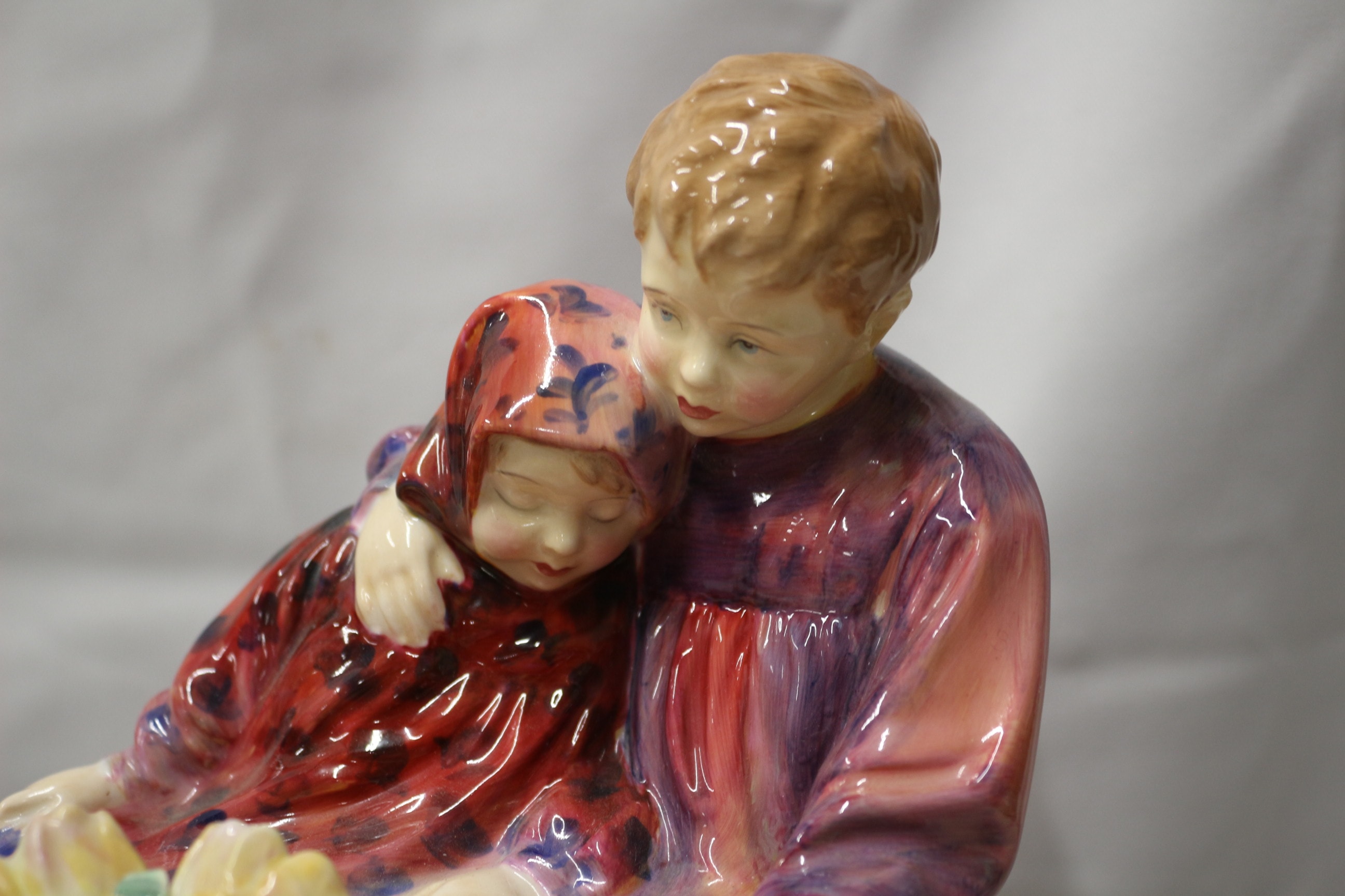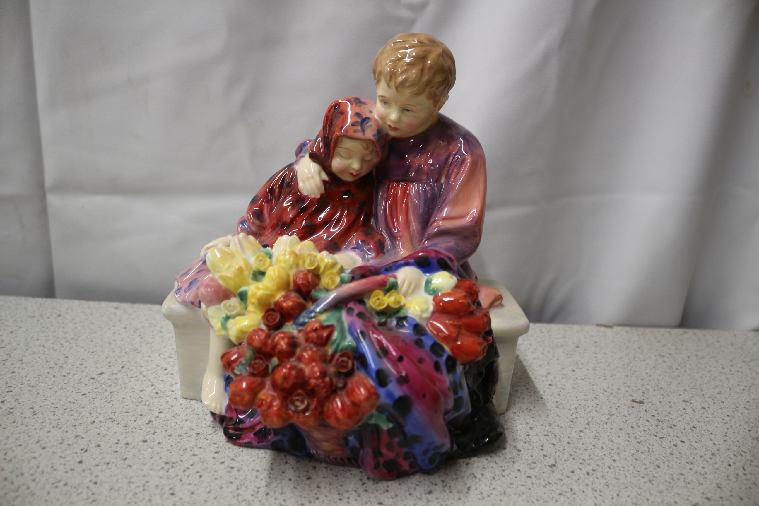 A multi-coloured Royal Doulton bone china figurine depicting “Flower Seller’s Children” in vibrant reds, blues, pinks, and yellows, with “HN1392” and “TW” inscribed on the base. 20cm tall