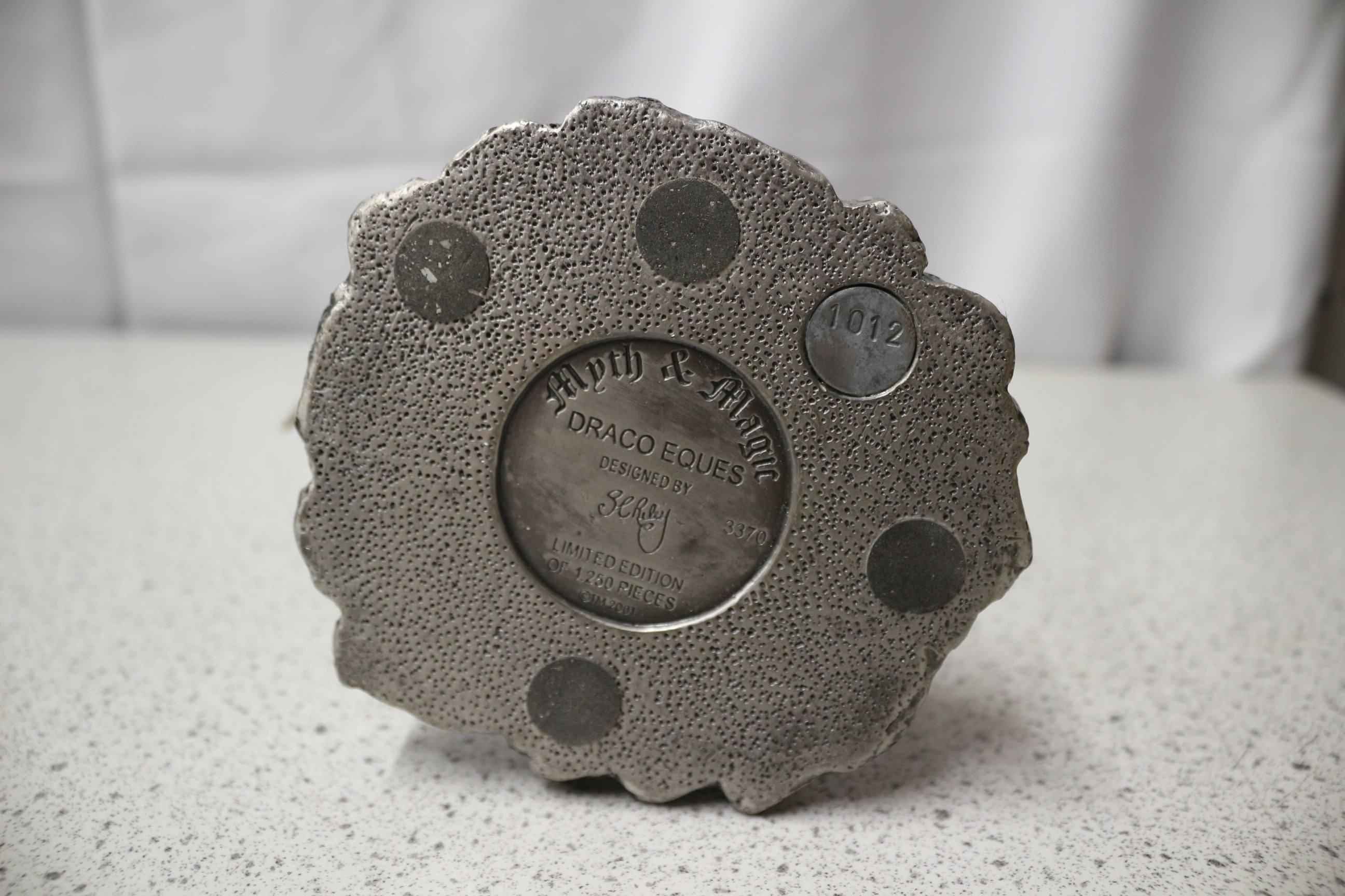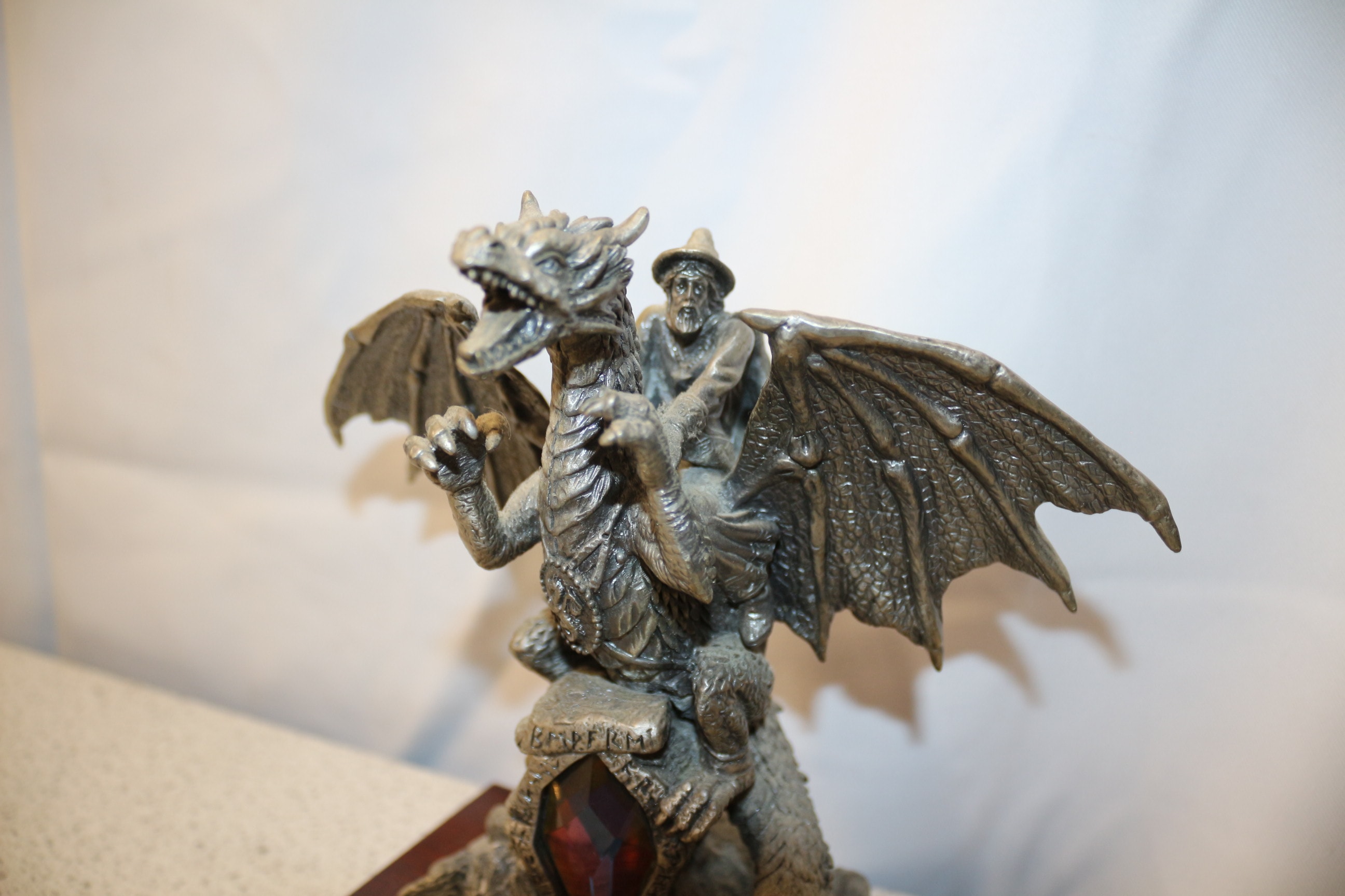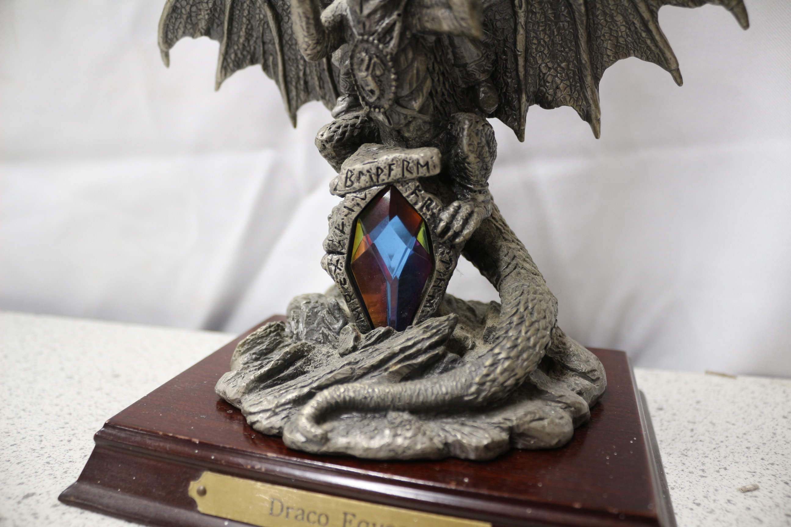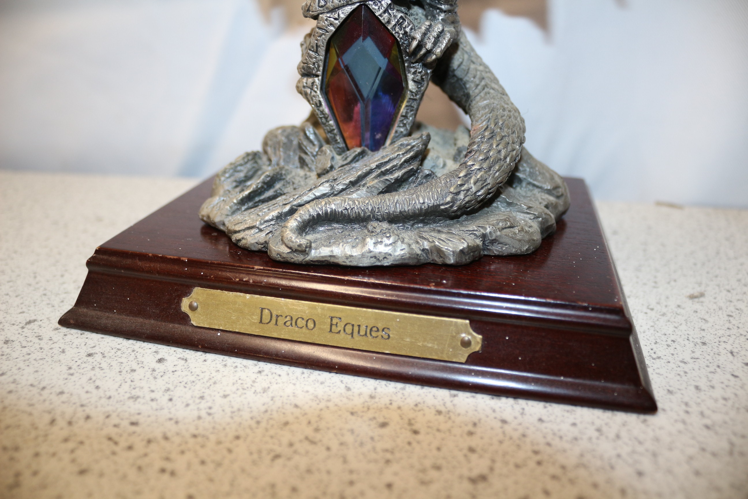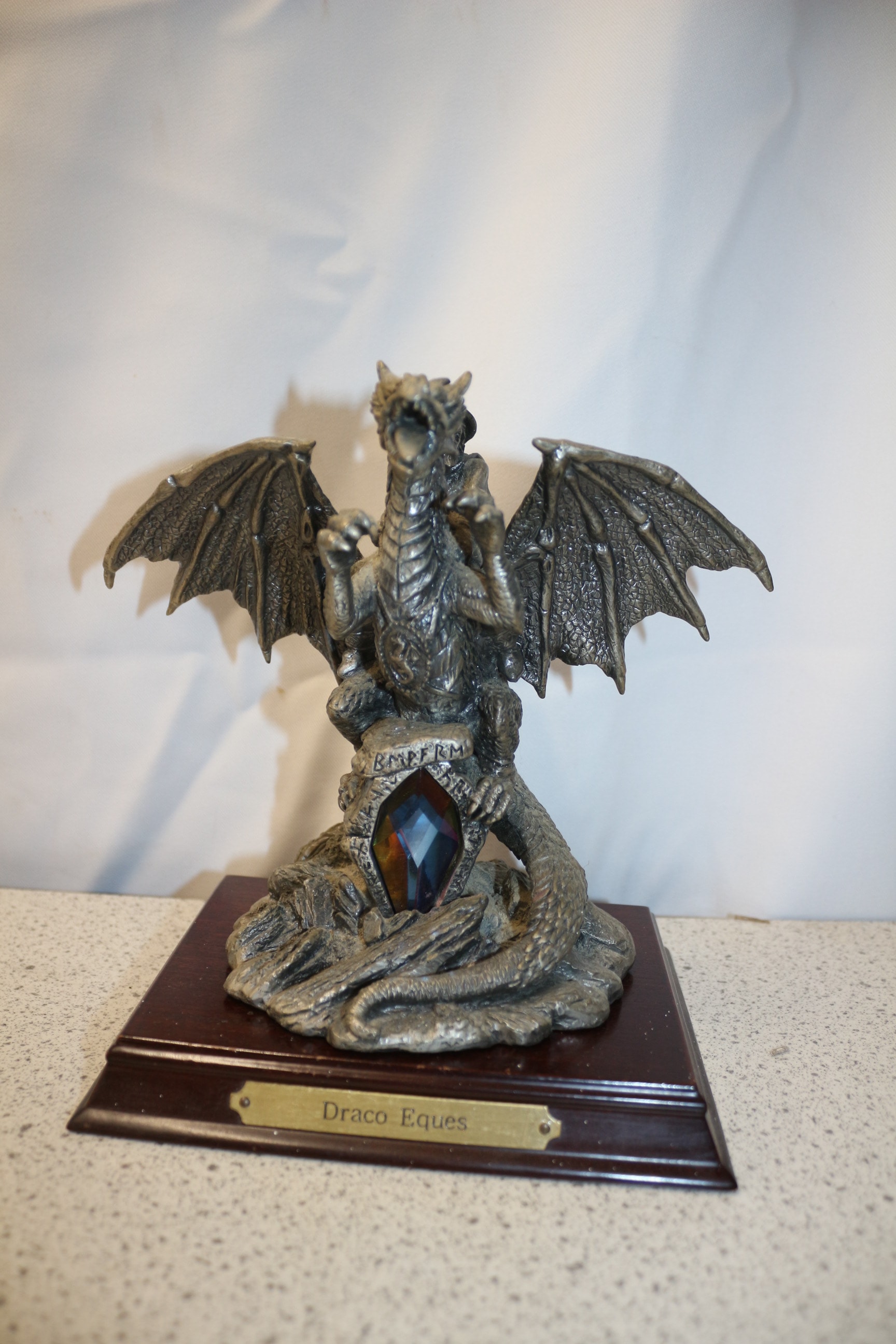A silvery-grey Myth & Magic ‘Draco Eques’ limited edition dragon figurine, designed by Gerry, featuring a rider, a multi-coloured gem, and marked ‘RMPFRM’, mounted on a wooden plinth with a brass ‘Draco Eques’ plaque, numbered 3379 of 1200 pieces. 18cm tall