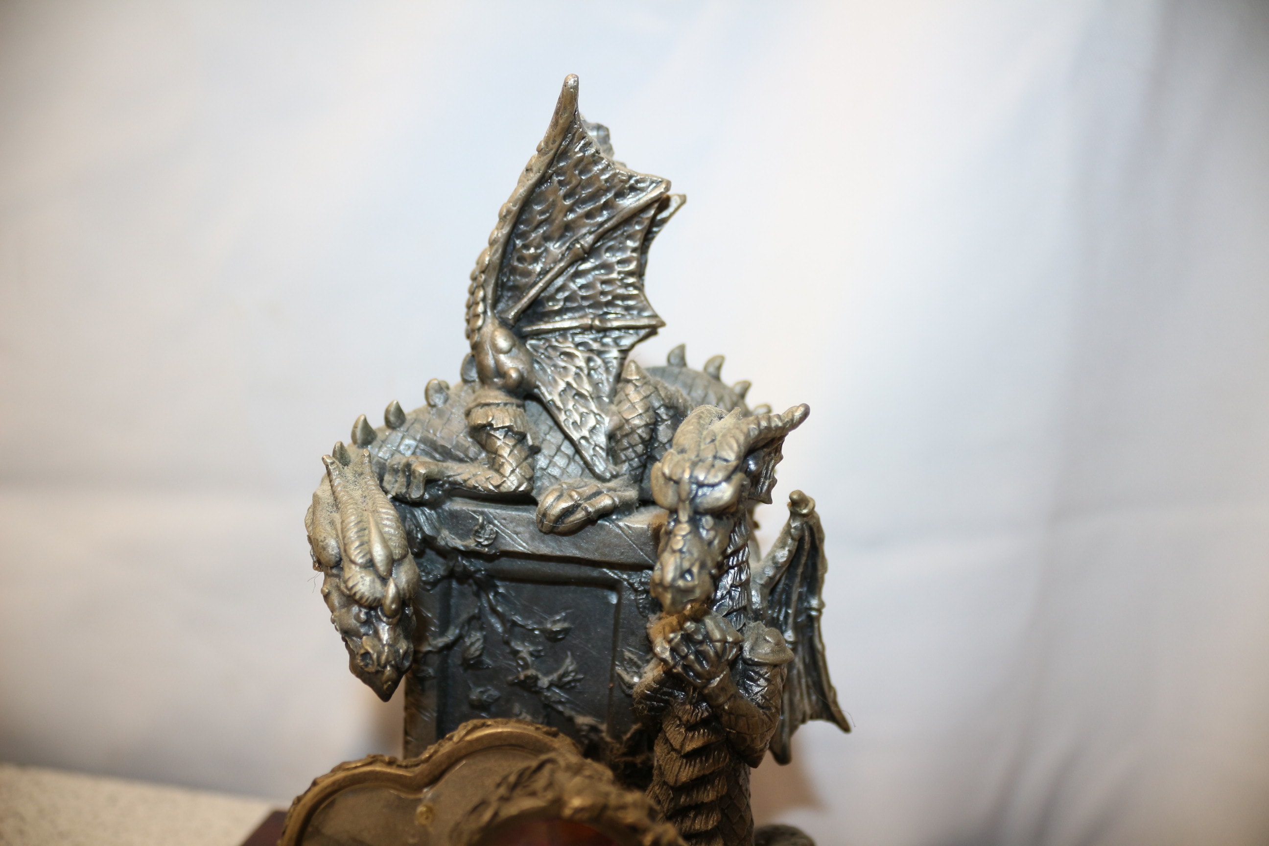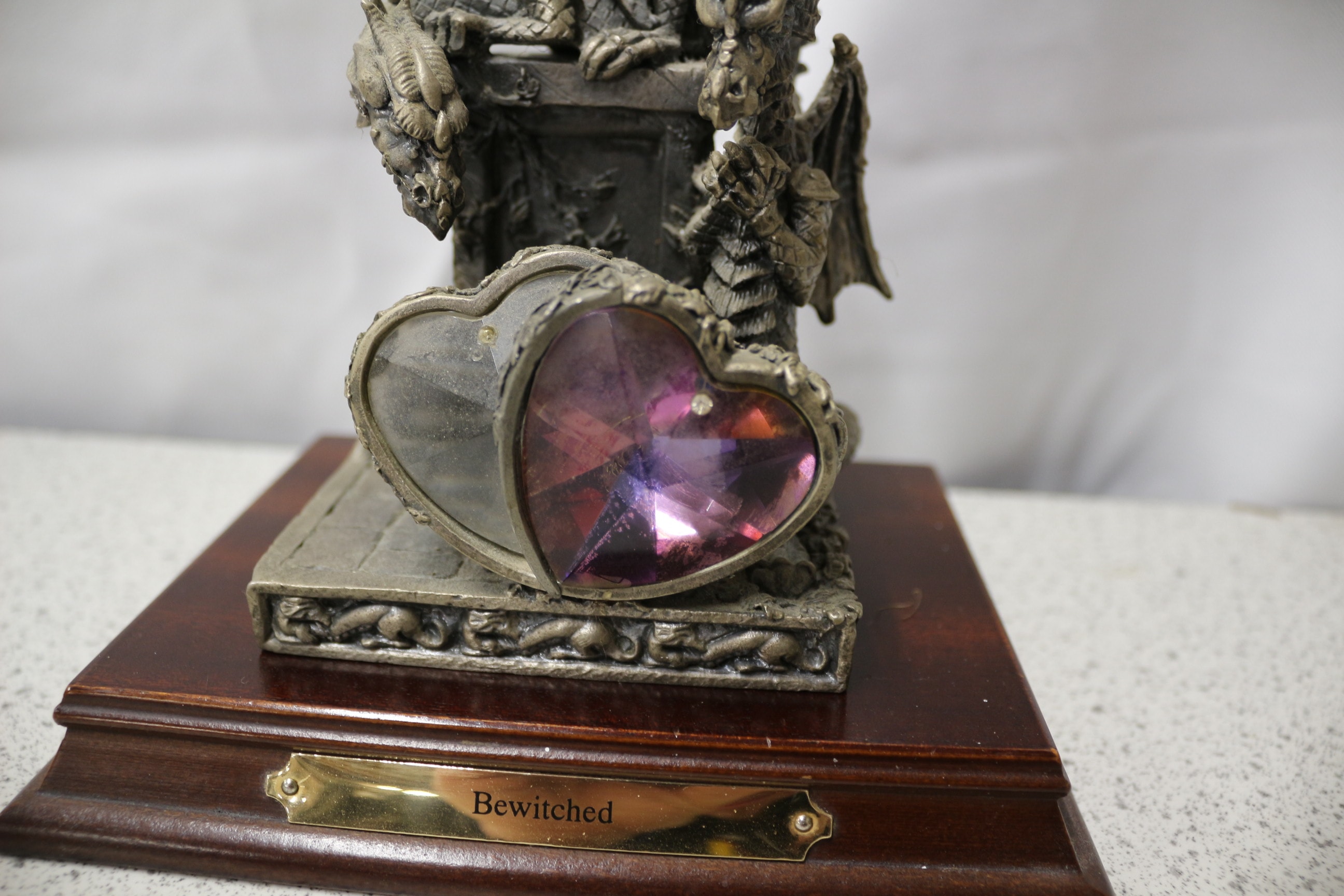 A silver-grey dragon statue featuring a purple faceted heart-shaped stone, mounted on a dark brown wooden base with a front plaque engraved “Bewitched, ” and an underside inscription reading “1997 “ONE YEAR ONLY” PIECE BEWITCHED BY J.C. Sherratt ©97 MADE IN THE U.K.” 17cm tall