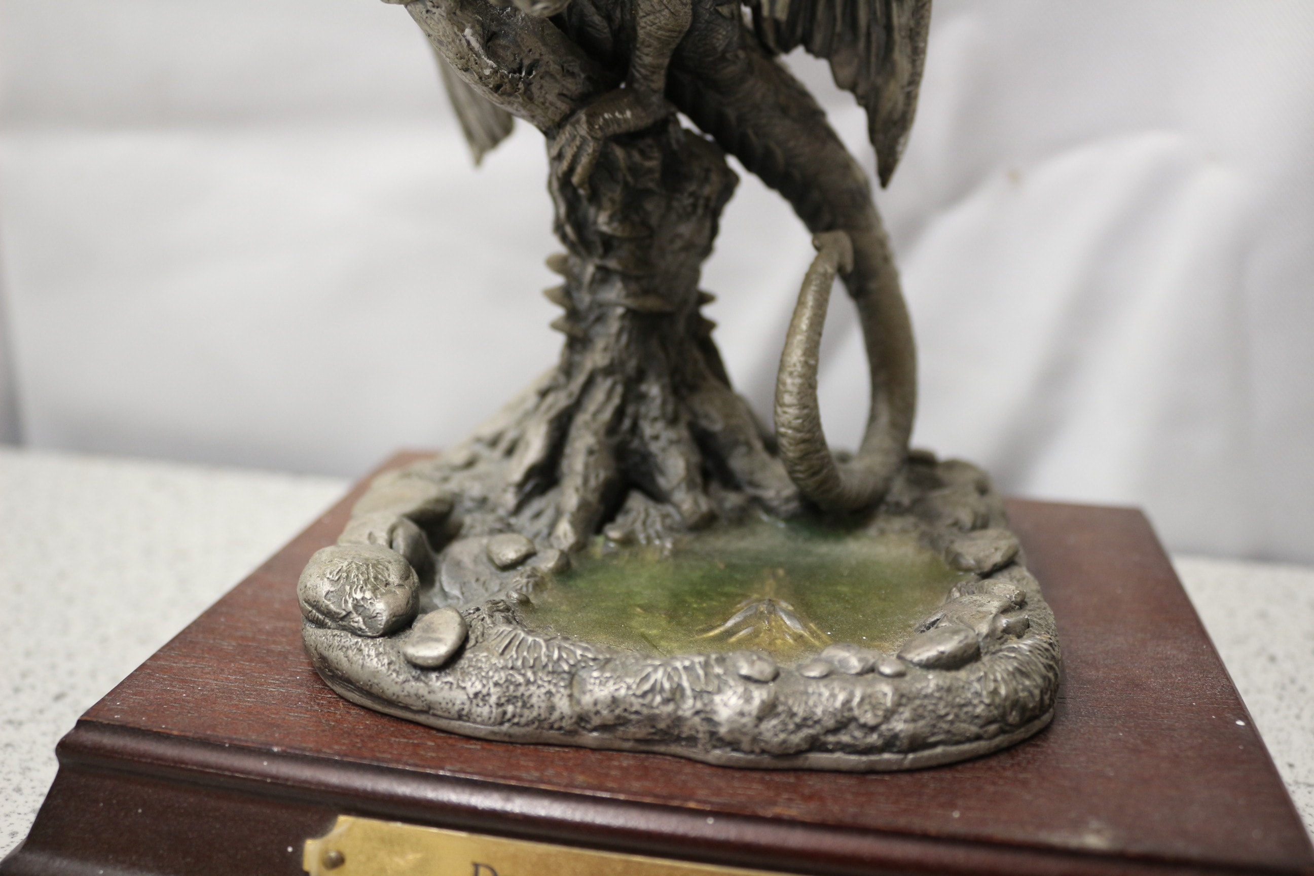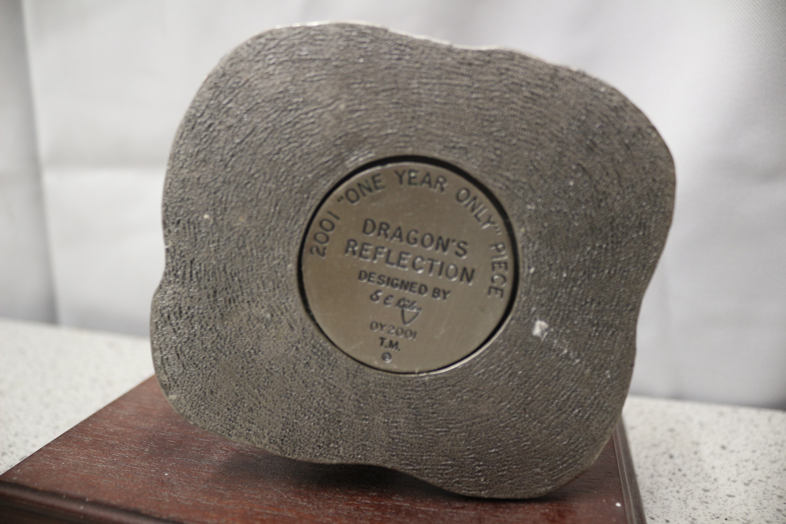 A silvery-grey dragon sculpture holding a clear crystal sphere, on a green-accented base, mounted on a brown wooden plaque, labelled ‘2001 ONE YEAR ONLY PIECE’. 16.5cm tall