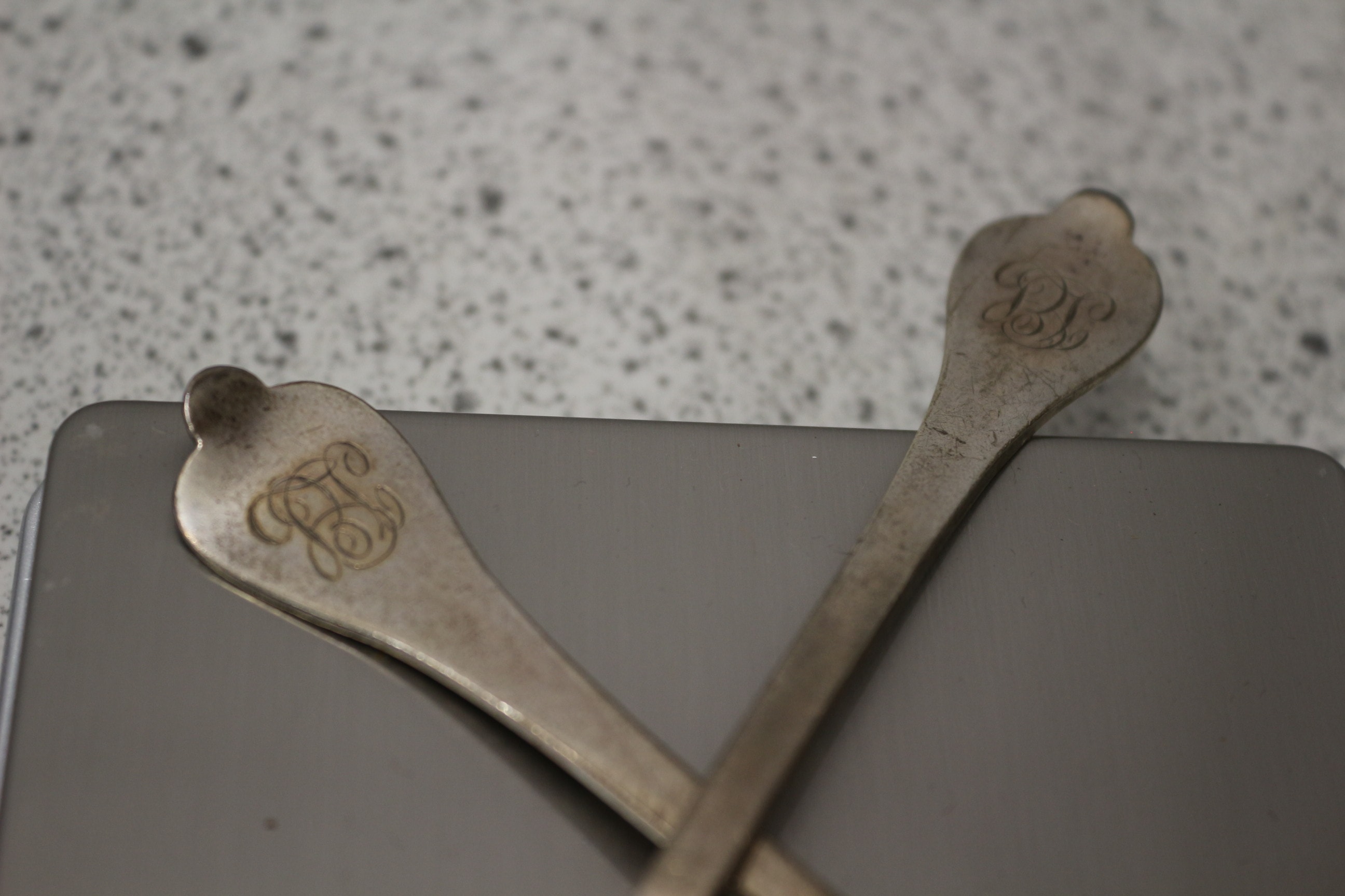 A pair of hallmarked silver cutlery, a spoon and a fork, weighing 44.03g, with engraved ‘JB’ initials and hallmarks ‘G & S Co’, an anchor, a lion passant, and a script letter in a shield, presented in a fitted box.