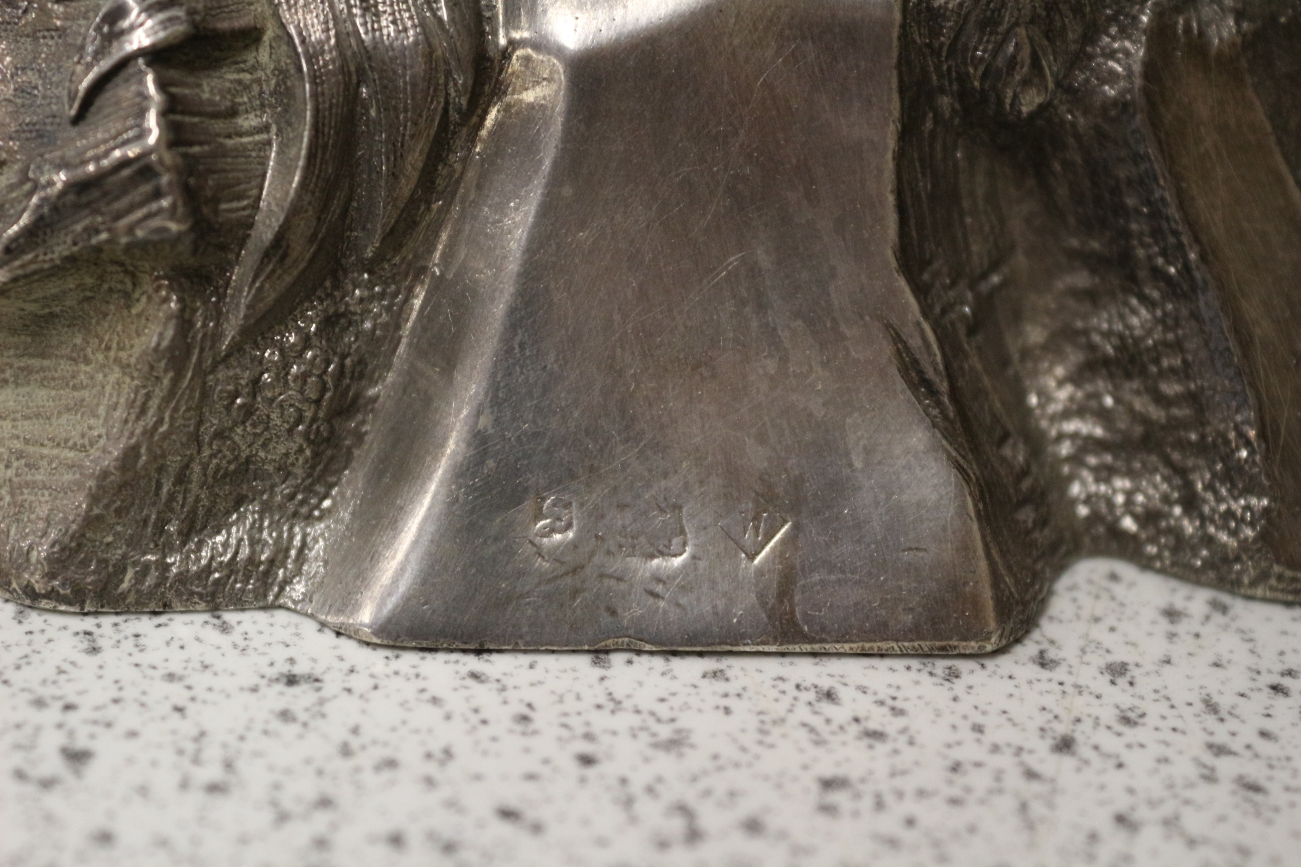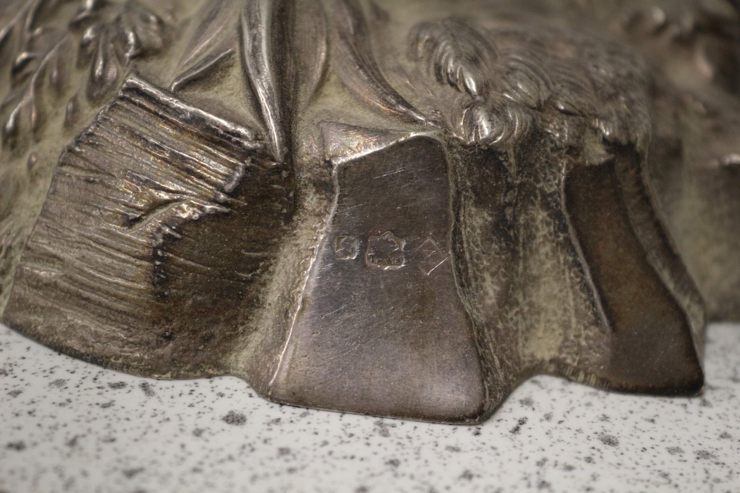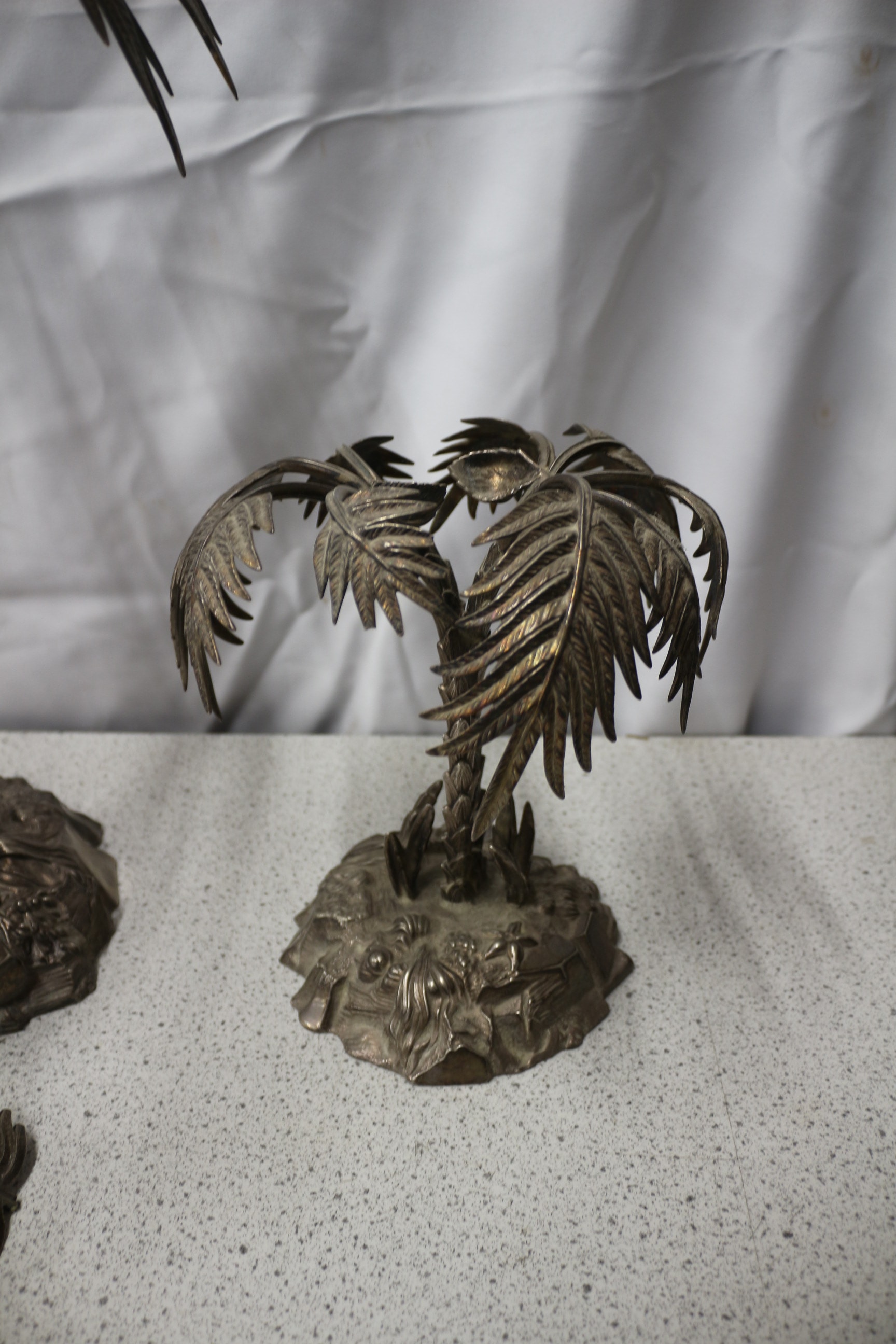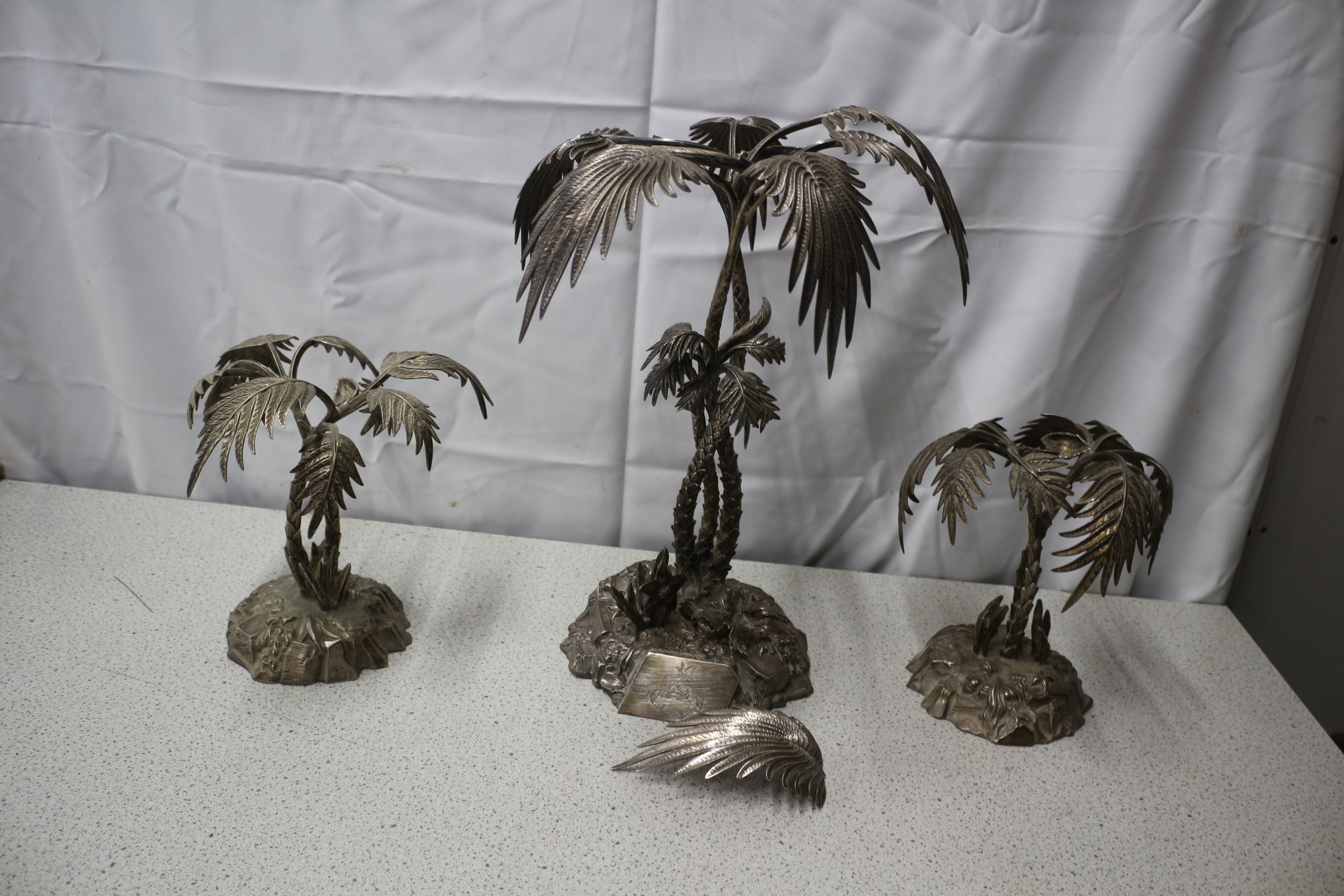 Three heavy silver-plated metal palm tree sculptures and one loose frond, the largest featuring a plaque inscribed with Latin and a Boars head and a bird above. The platers marks are hallmarked on each piece. Tallest 44cm. One in need of repair