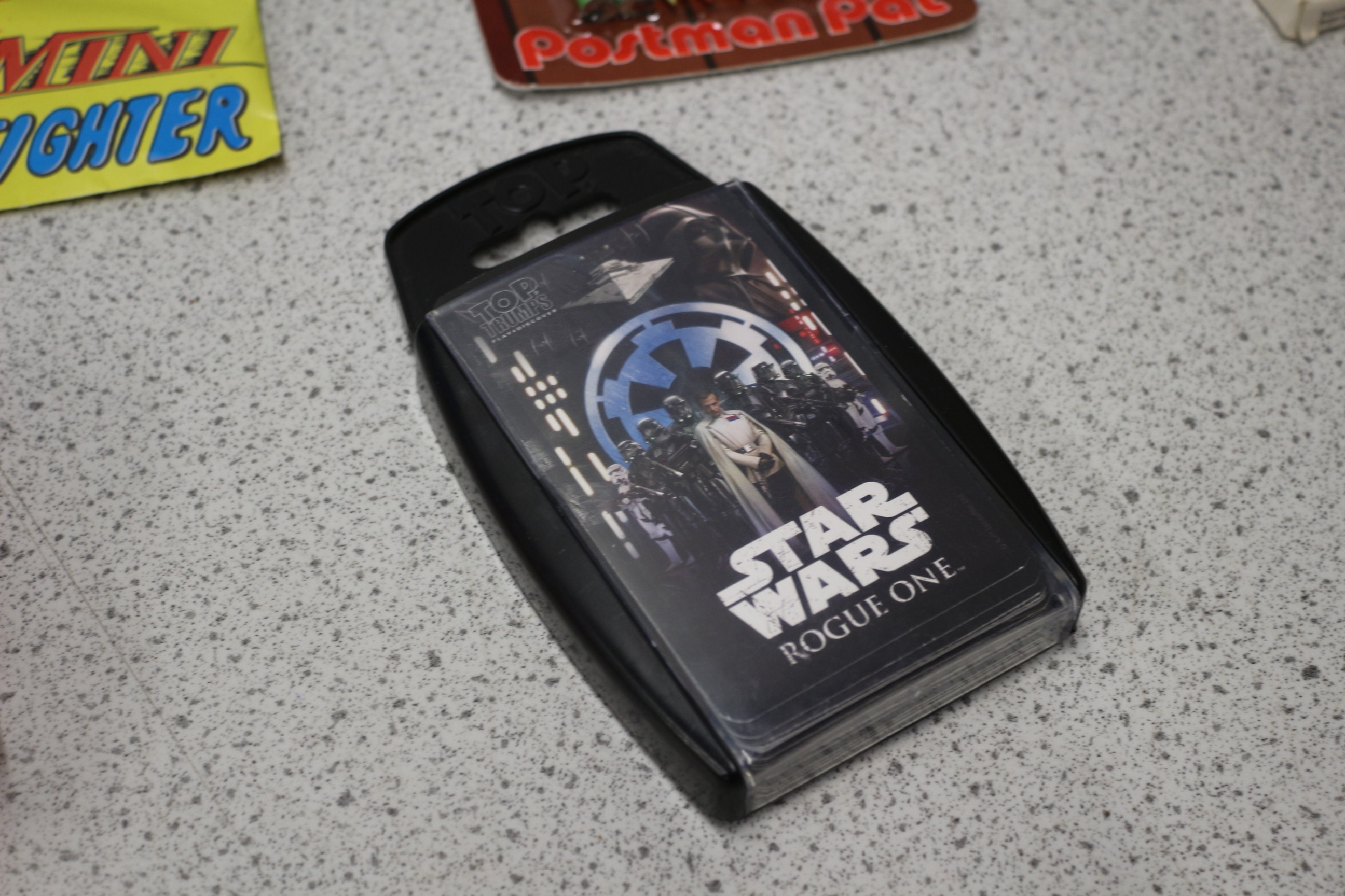 A black plastic-cased pack of Top Trumps Star Wars Rogue One cards.