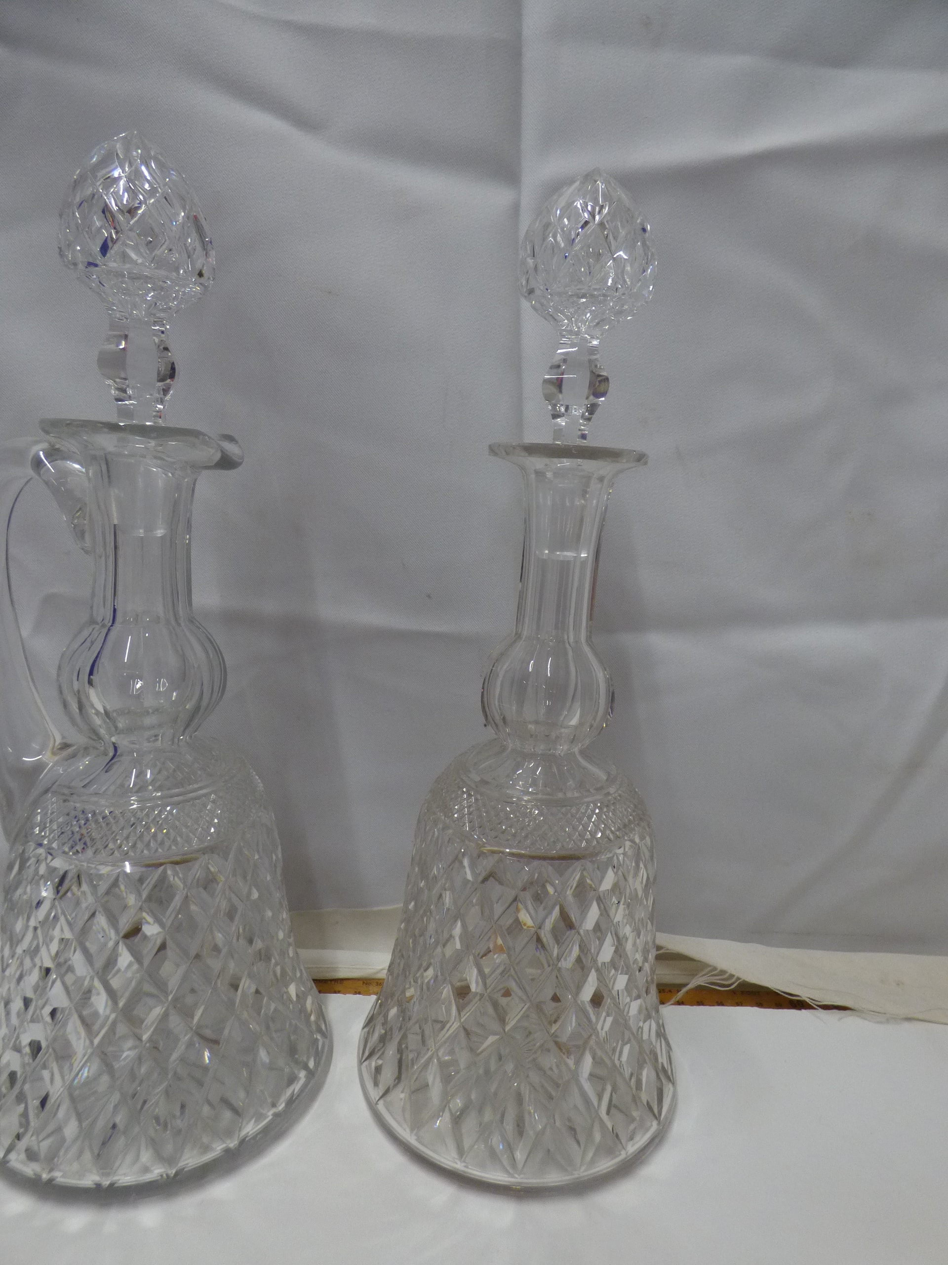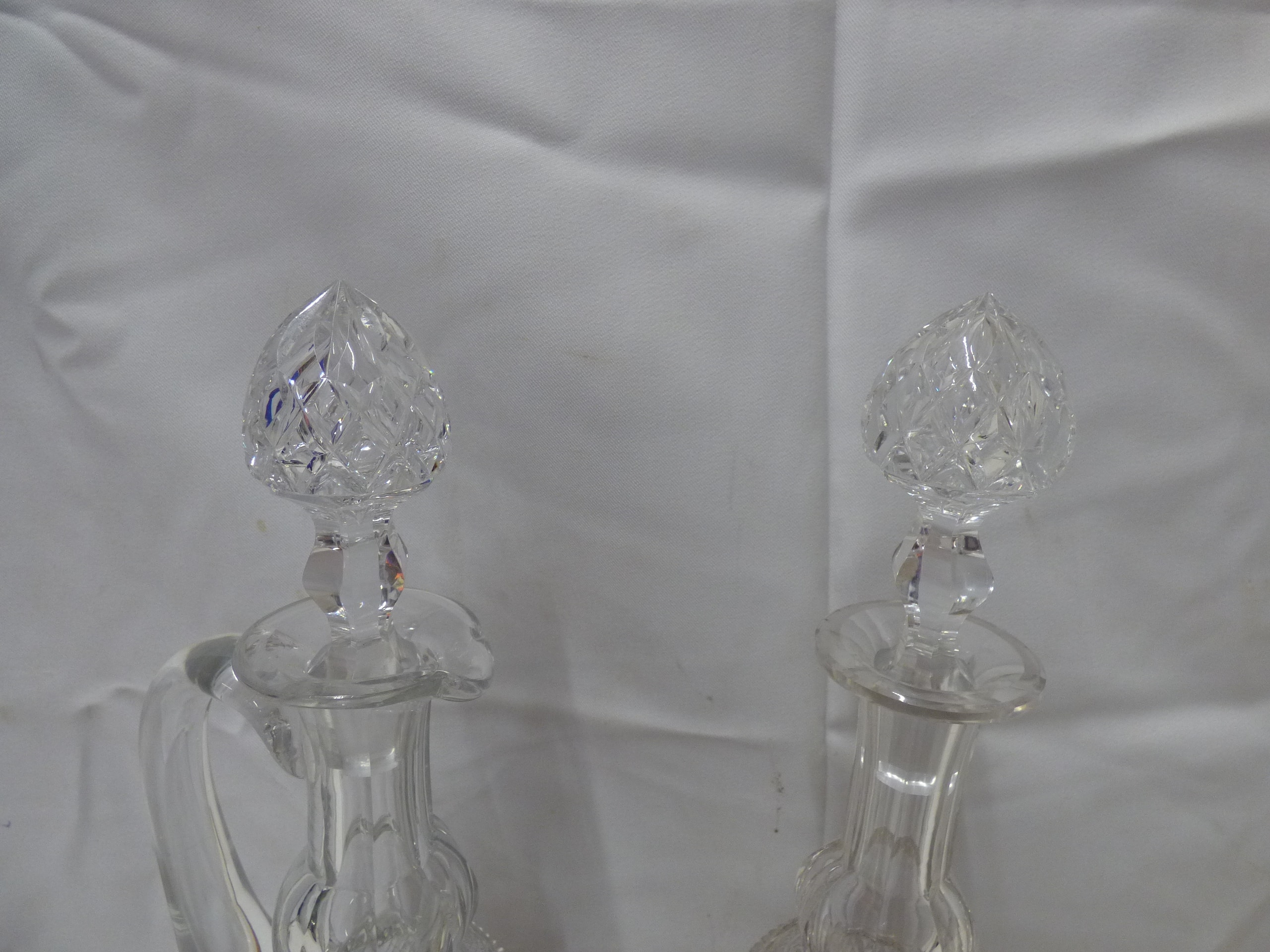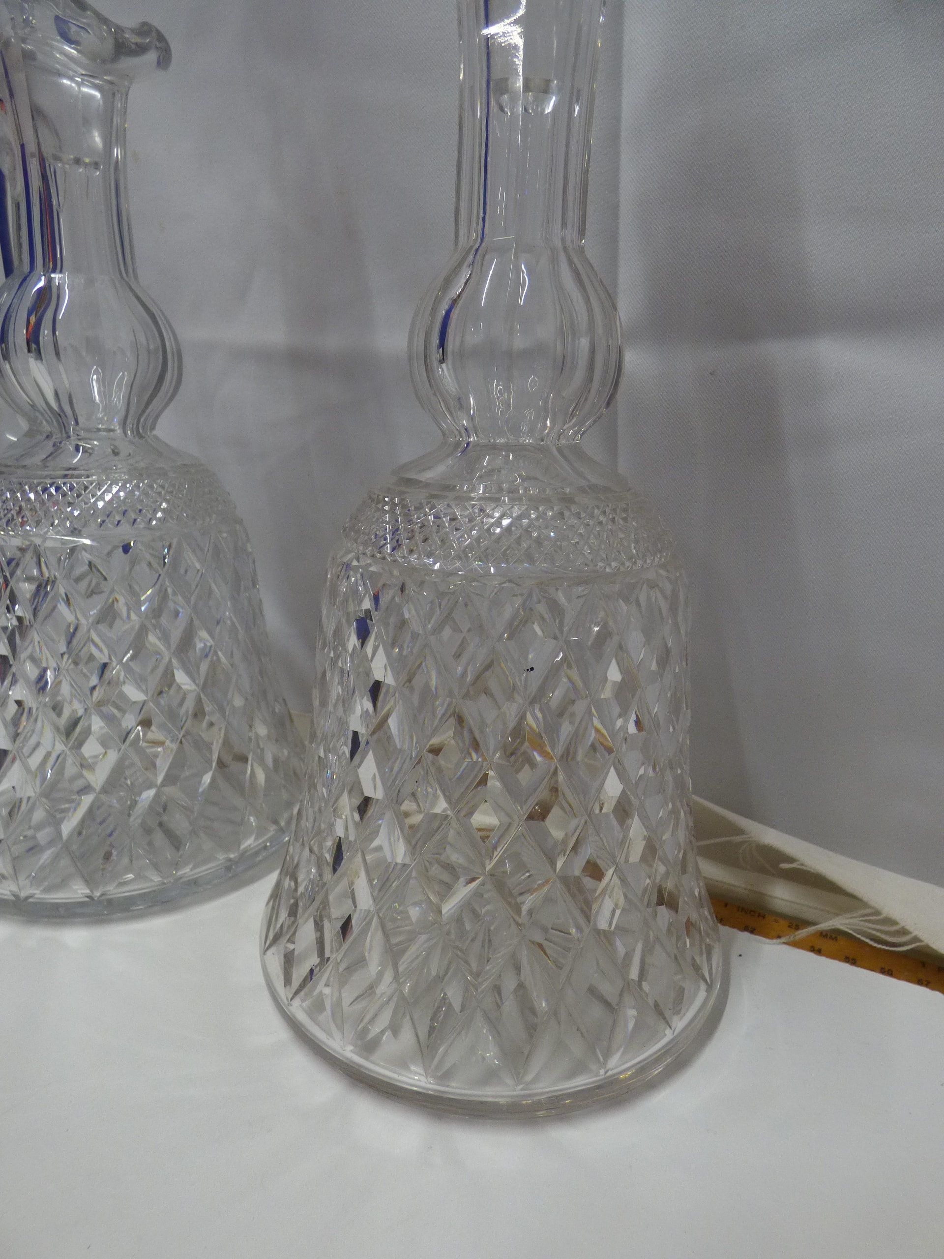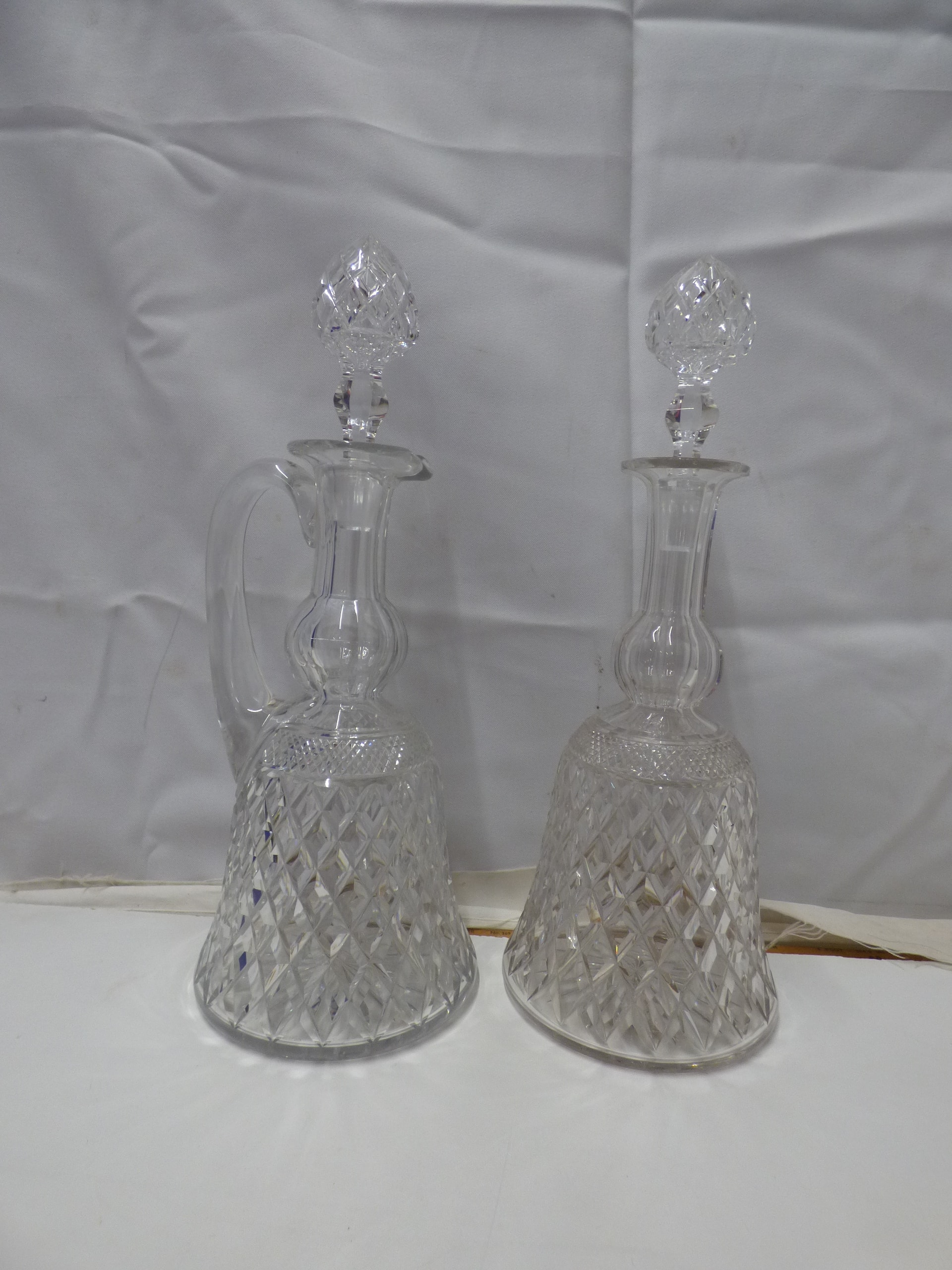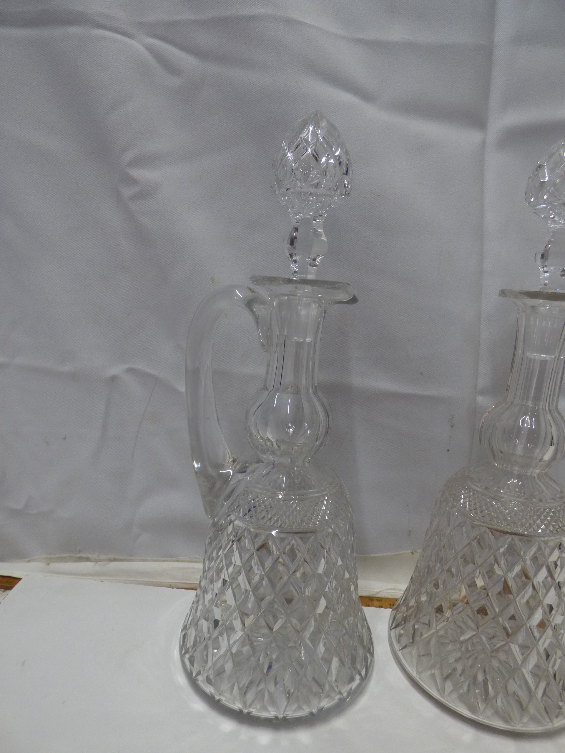 A pair of what is believed to possibly be Baccarat crystal decanters with stoppers, one featuring a handle, both adorned with diamond cut patterns. 34cm Tall