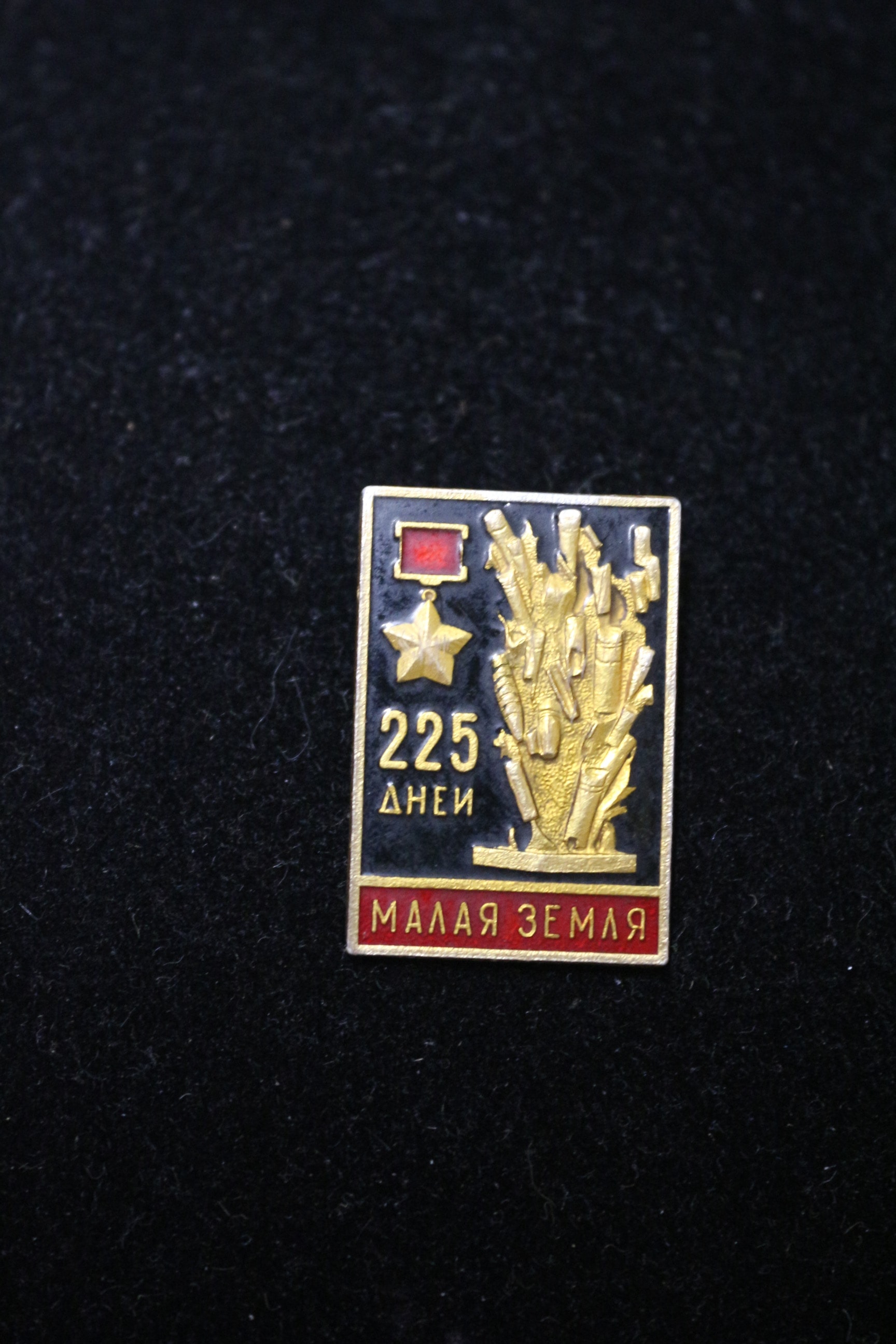 A single rectangular Soviet-era military commemorative badge, primarily black, gold, and red, features text ‘225 ДНЕЙ’ and ‘МАЛАЯ ЗЕМЛЯ’, a star, and golden artillery shells.