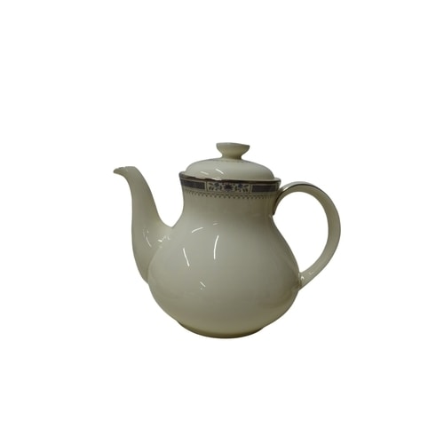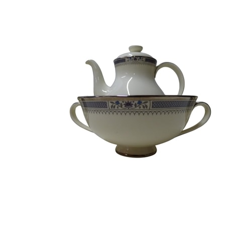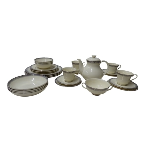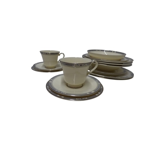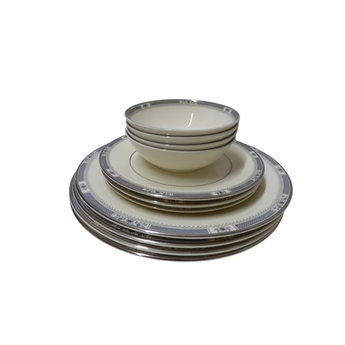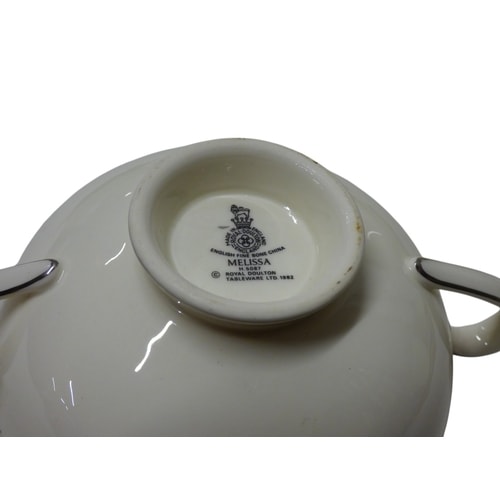 A 4 Person set of Royal Doulton ‘Melissa’ English fine bone china dinnerware and tea set, featuring off-white/cream pieces with dark blue/grey geometric and floral bands, platinum trim, and marked ‘MADE IN ENGLAND, ‘ ‘ENGLISH FINE BONE CHINA, ‘ ‘MELISSA, ‘ and ‘© ROYAL DOULTON TABLEWARE LTD. 1982.’ All in good condition. This lot includes extra pieces from the set including 2x cup & saucer, 2x side plates, 3x bowls, 1x soup bowl, 2x dinner plates, 2x tea plates, 1x cereal bowl