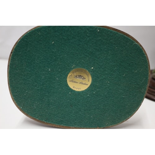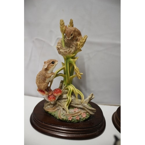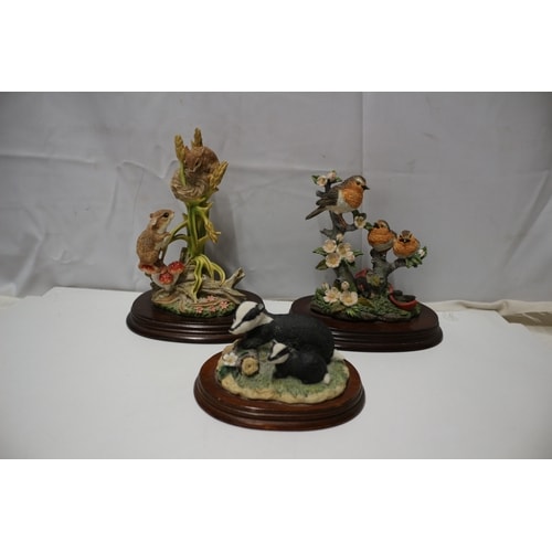Three multi-coloured animal figurines, including one depicting three birds (primarily brown and orange) perched on a green flowering branch with pink blossoms, on a wooden base with a gold label ‘The Leonardo Collection Nature Studies ©1995’, another with squirrels labelled ‘The Leonardo Collection Nature Studies ©1991’, and a badger figurine labelled ‘Badgers by REGENCY FINE ARTS’.