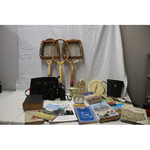 Three vintage wooden tennis rackets (one ‘DUNLOP’, one ‘Girl’), a black patterned handbag with a square metallic emblem, a pair of black binoculars, a collection of four assorted clocks, one black hard case, and a collection of books including ‘SCOUTING FOR BOYS’ and ‘HOW THE GIRL GUIDES WON THE WAR’.
