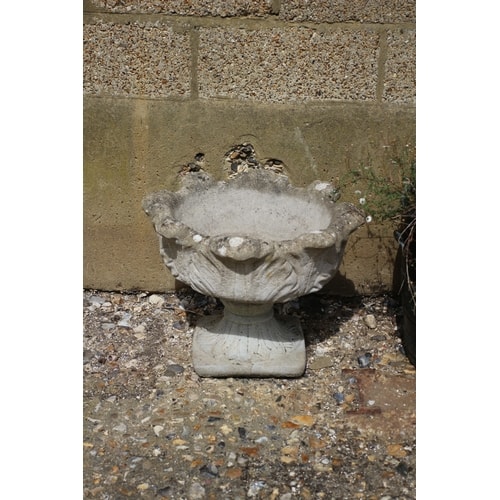 A grey decorative concrete bird bath/planter and a black round plastic planter containing green plants, with no visible labels or markings.