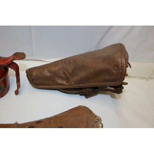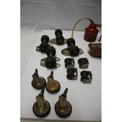 This lot includes one red metal oil can with a flexible yellow hose, marked “WORLD WIDE TRADER” on its rusted side, two brown leather bicycle saddles with exposed springs, and a collection of approximately 15 casters or rollers with dark brown/black wheels and metallic housings.