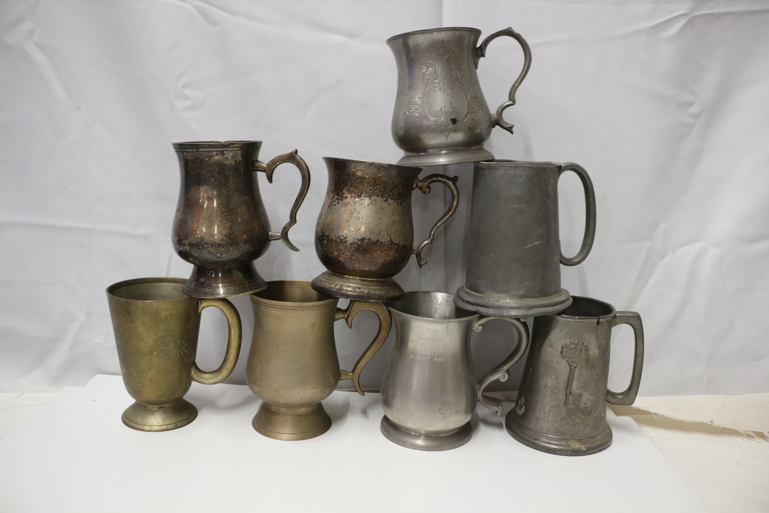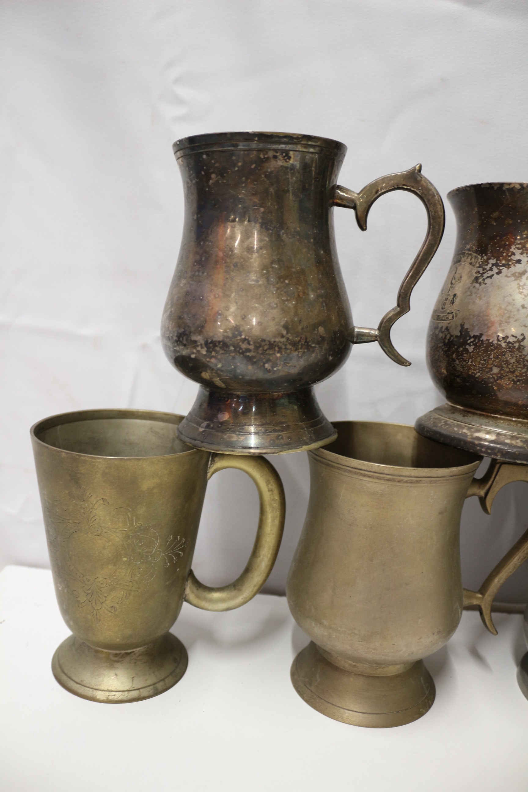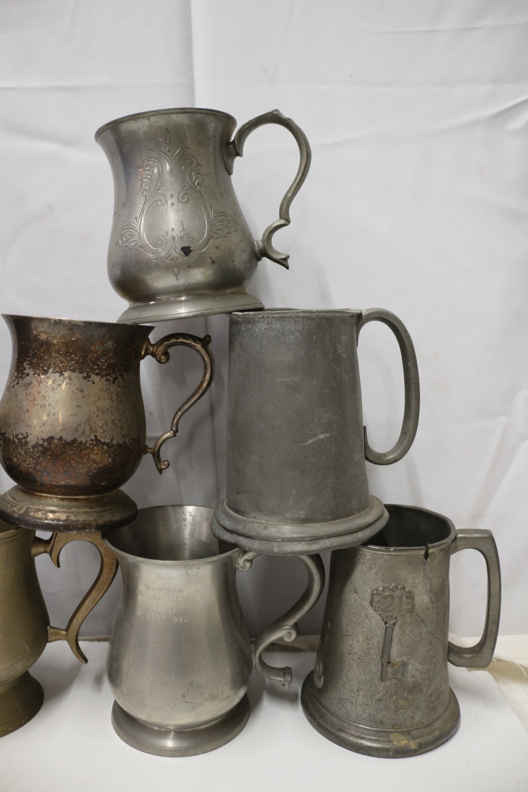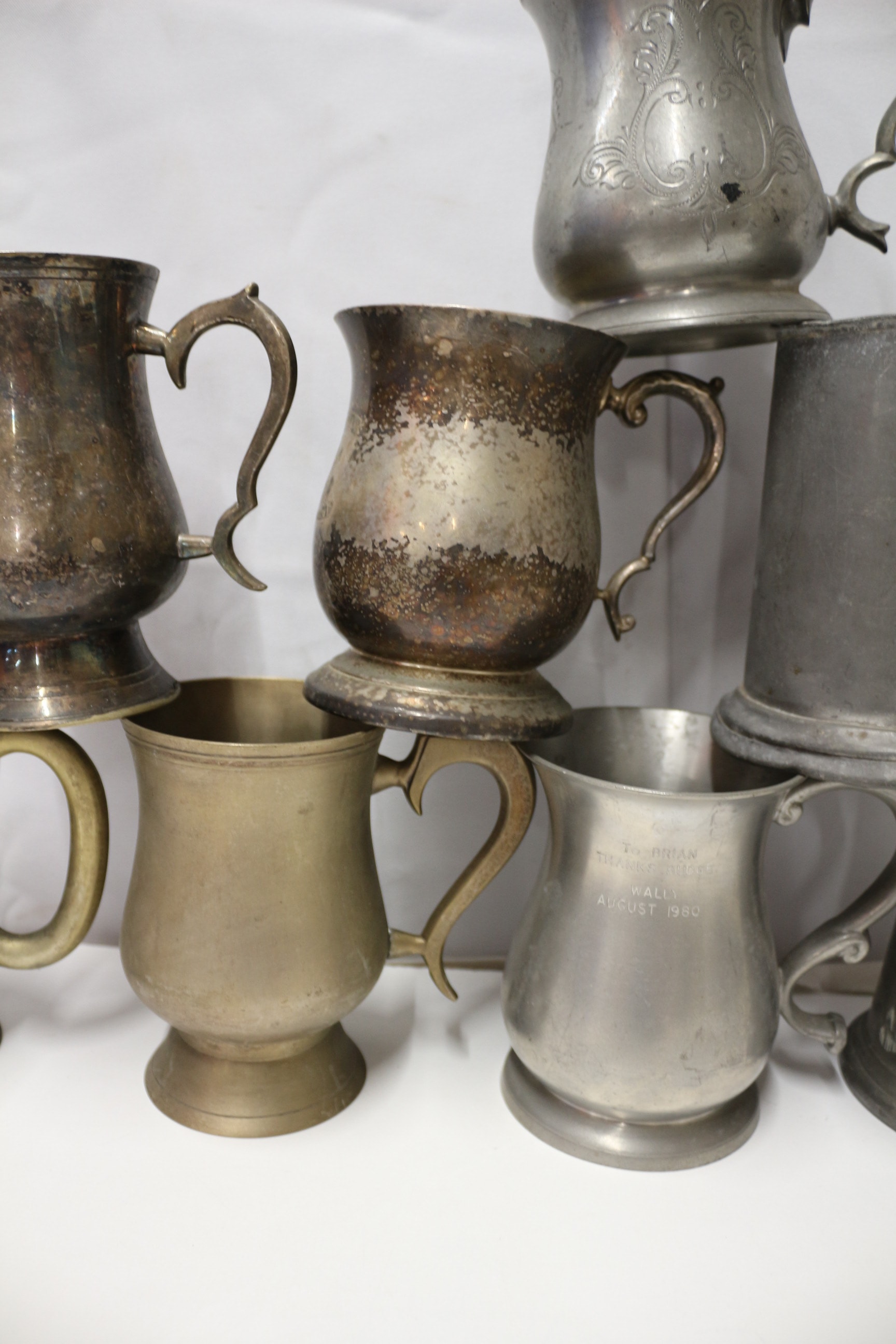 A group of eight assorted pewter tankards and mugs, some with decorative elements.
