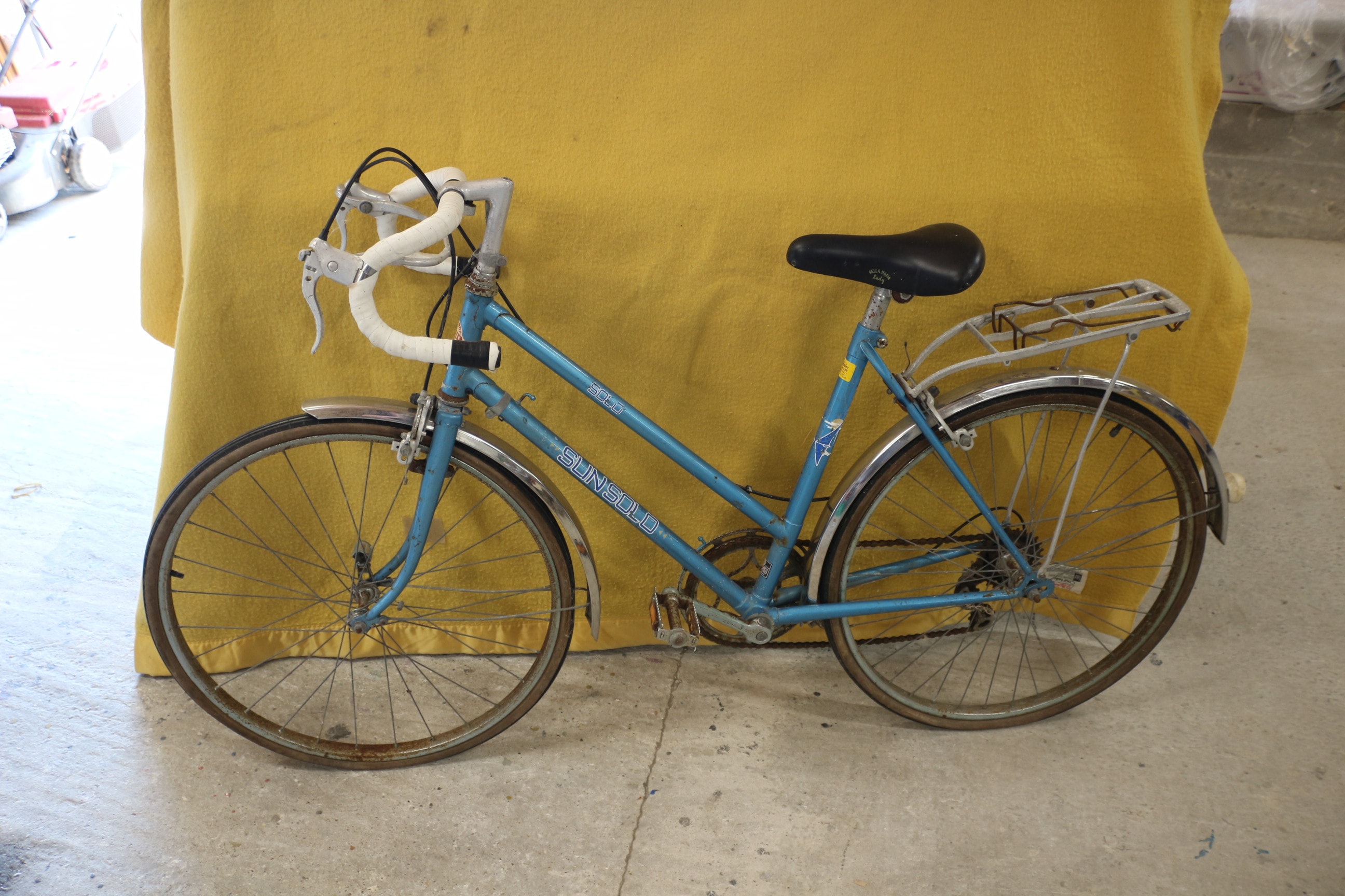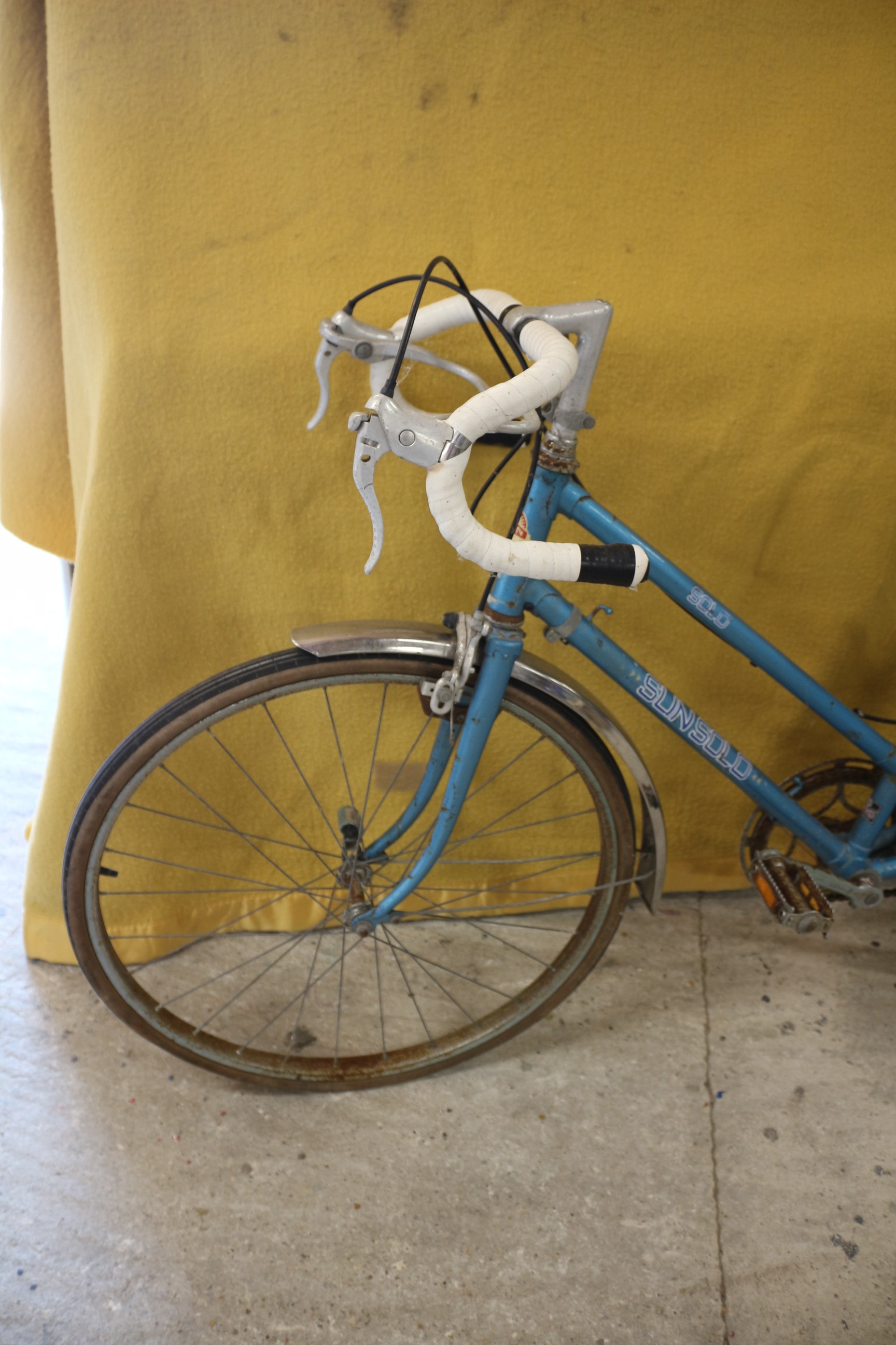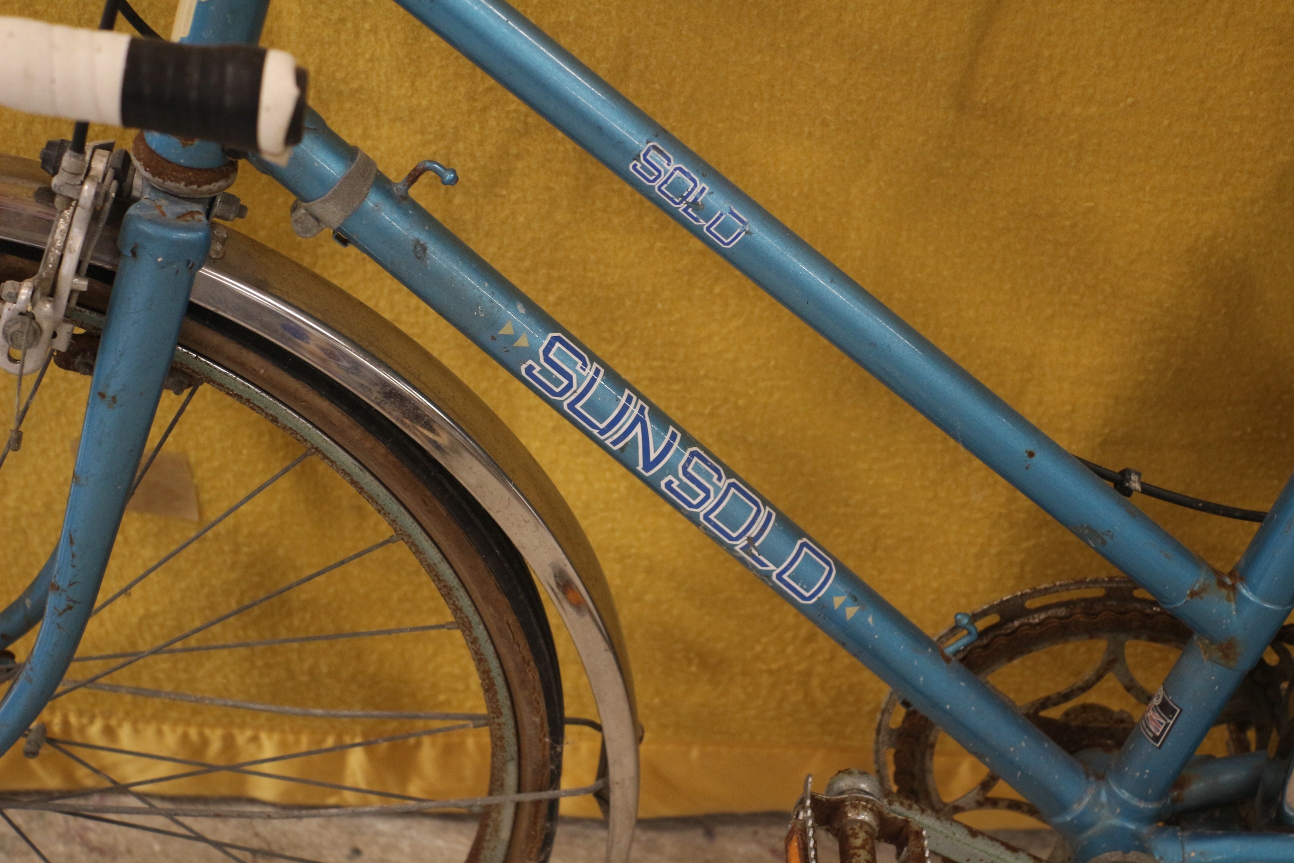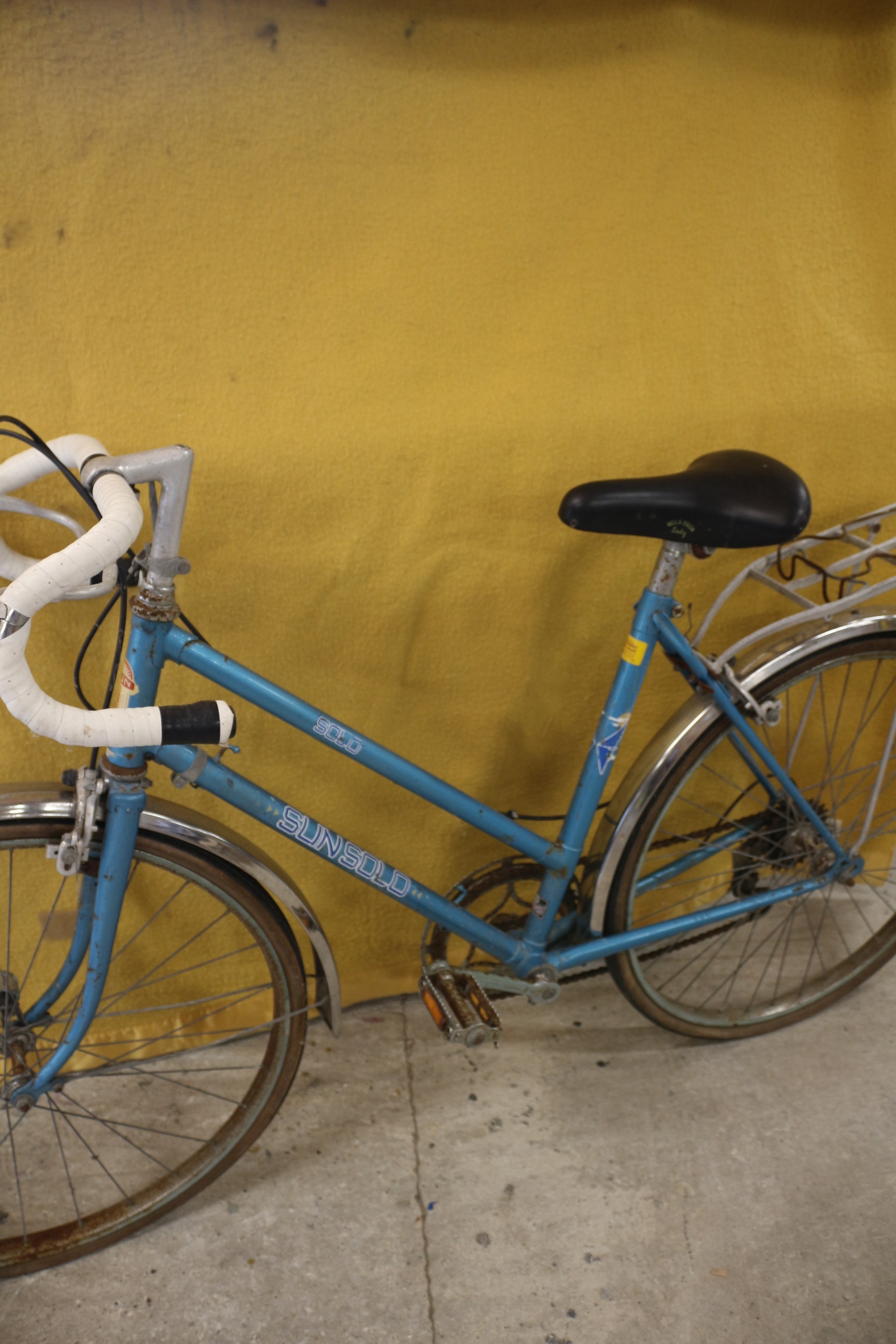 A light blue/teal bicycle with a black seat, white handlebar tape, “SUNSOLO” and “SOLO” text on the frame, a “SUN NOTTINGHAM” head tube badge, “WEINMANN” brake levers, and “UNION” pedals.
