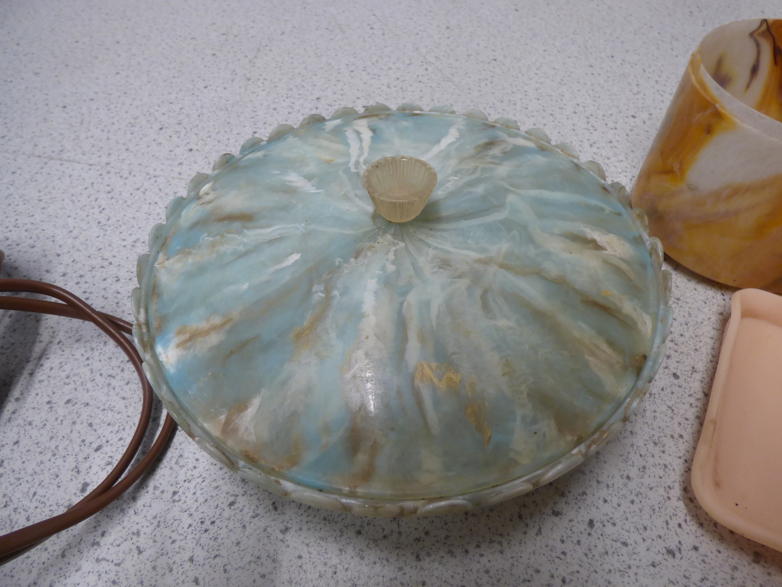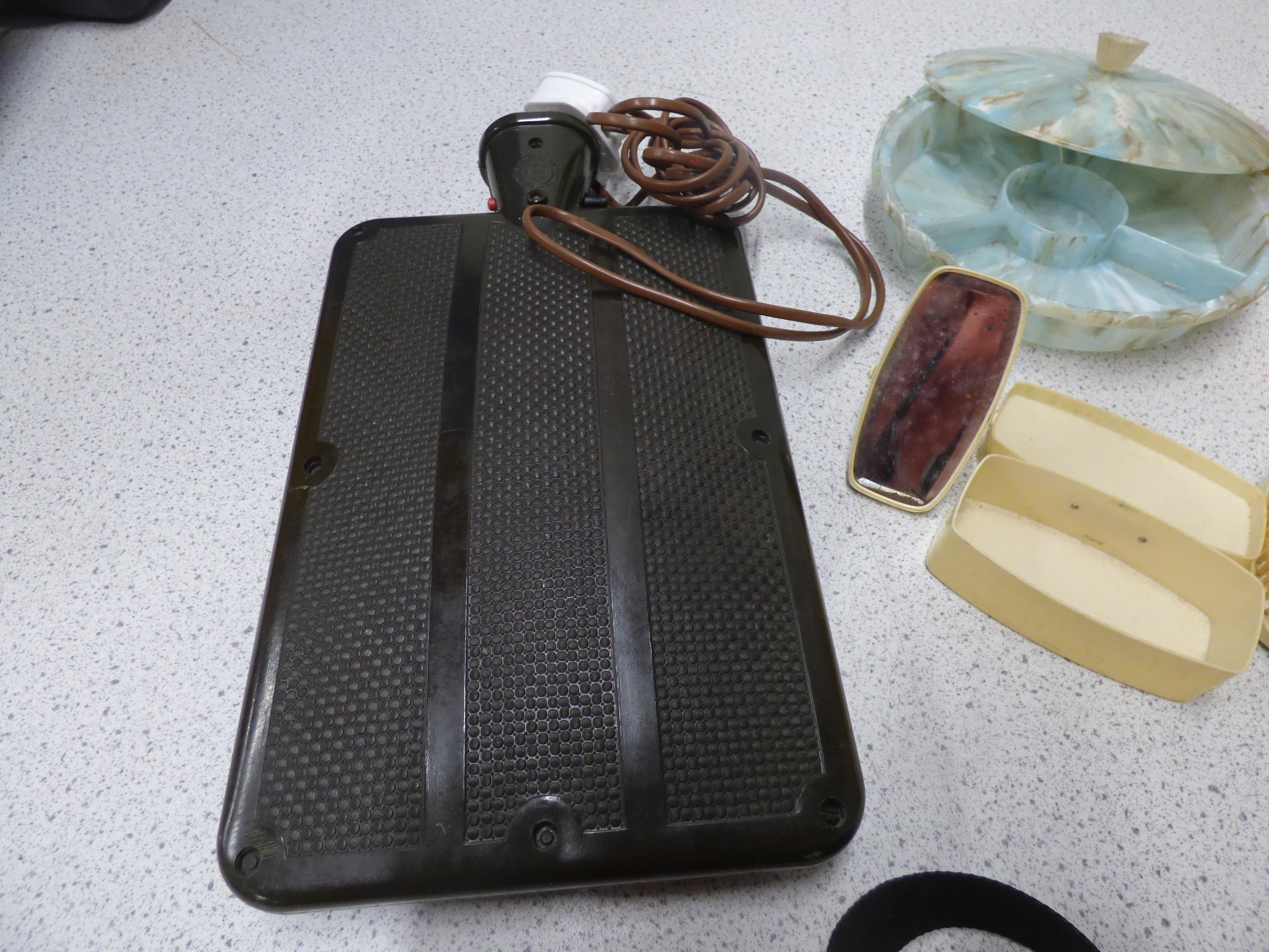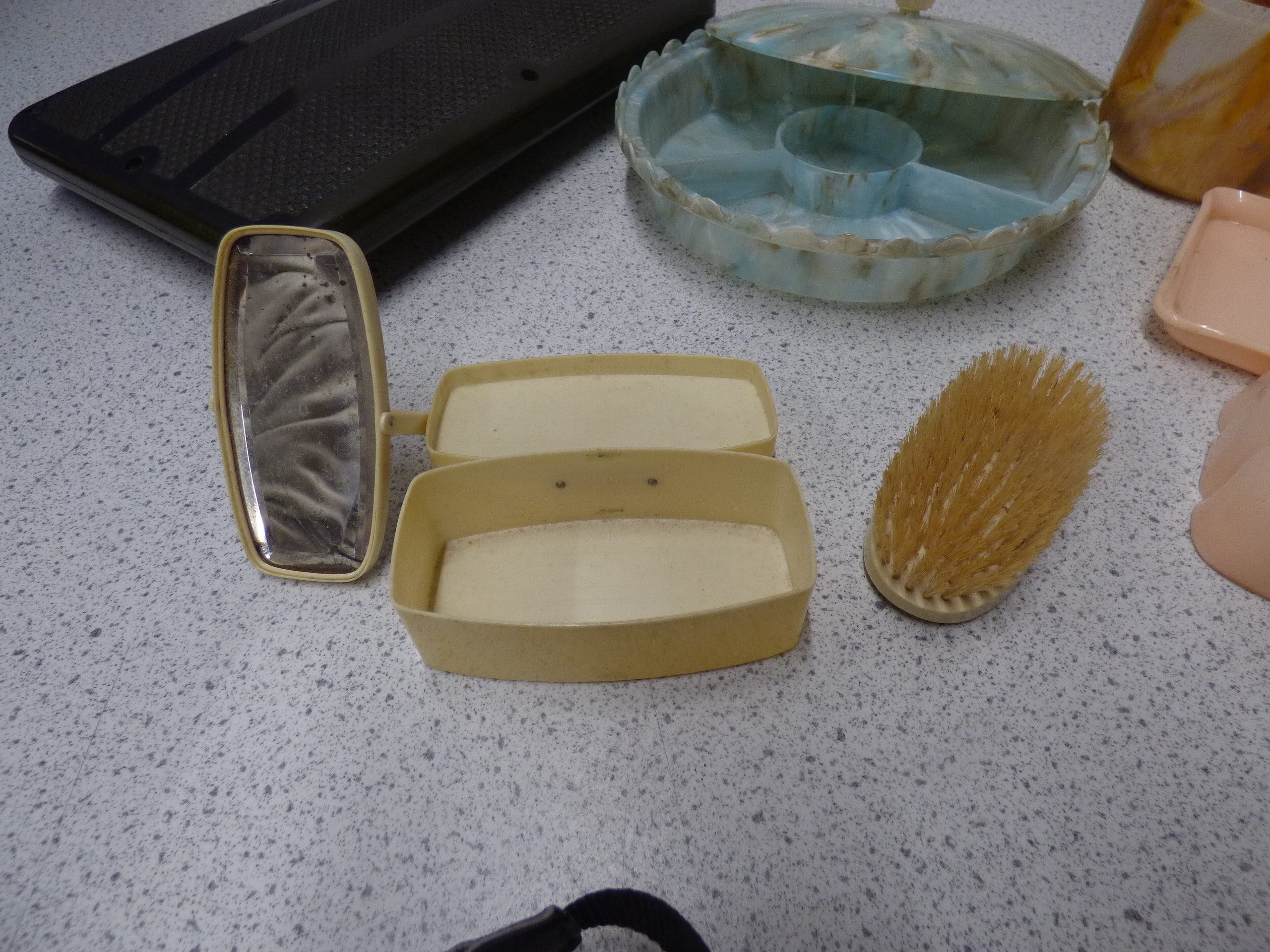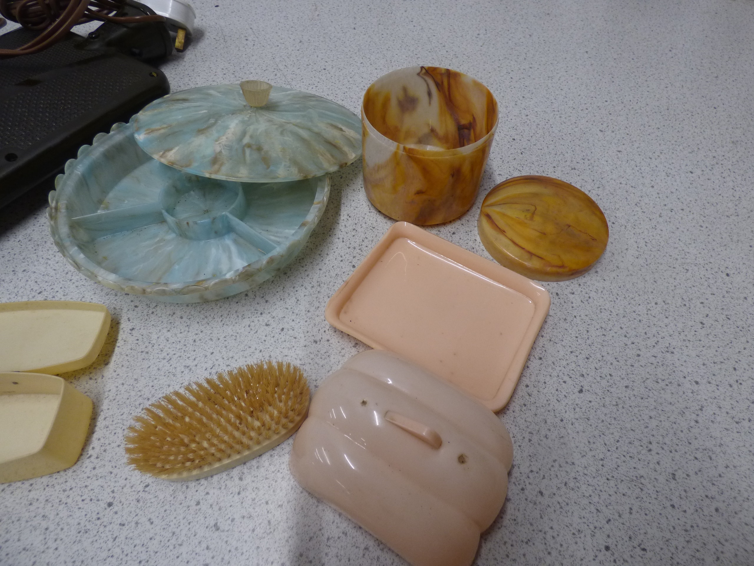 A dark green/black electric hot water bottle with a brown cord, a light blue and white marbled round lidded segmented dish, a brown and orange marbled lidded cylindrical container, a cream-coloured handheld mirror, a rectangular cream-coloured hinged box, a light pink lidded soap dish, and a small cream-coloured bristle brush are included in this lot.