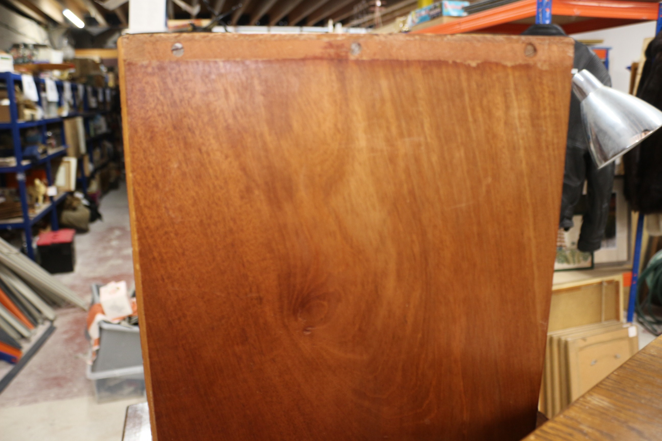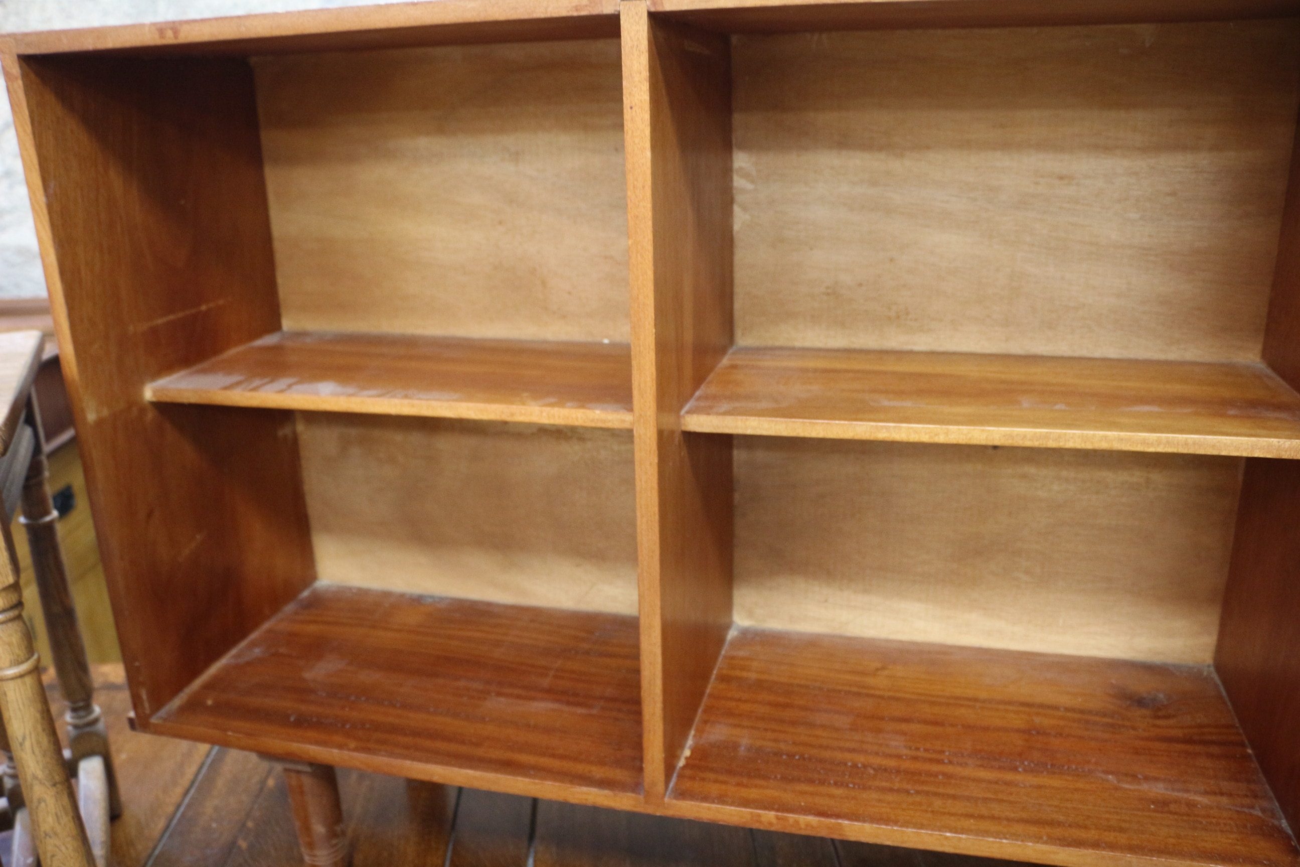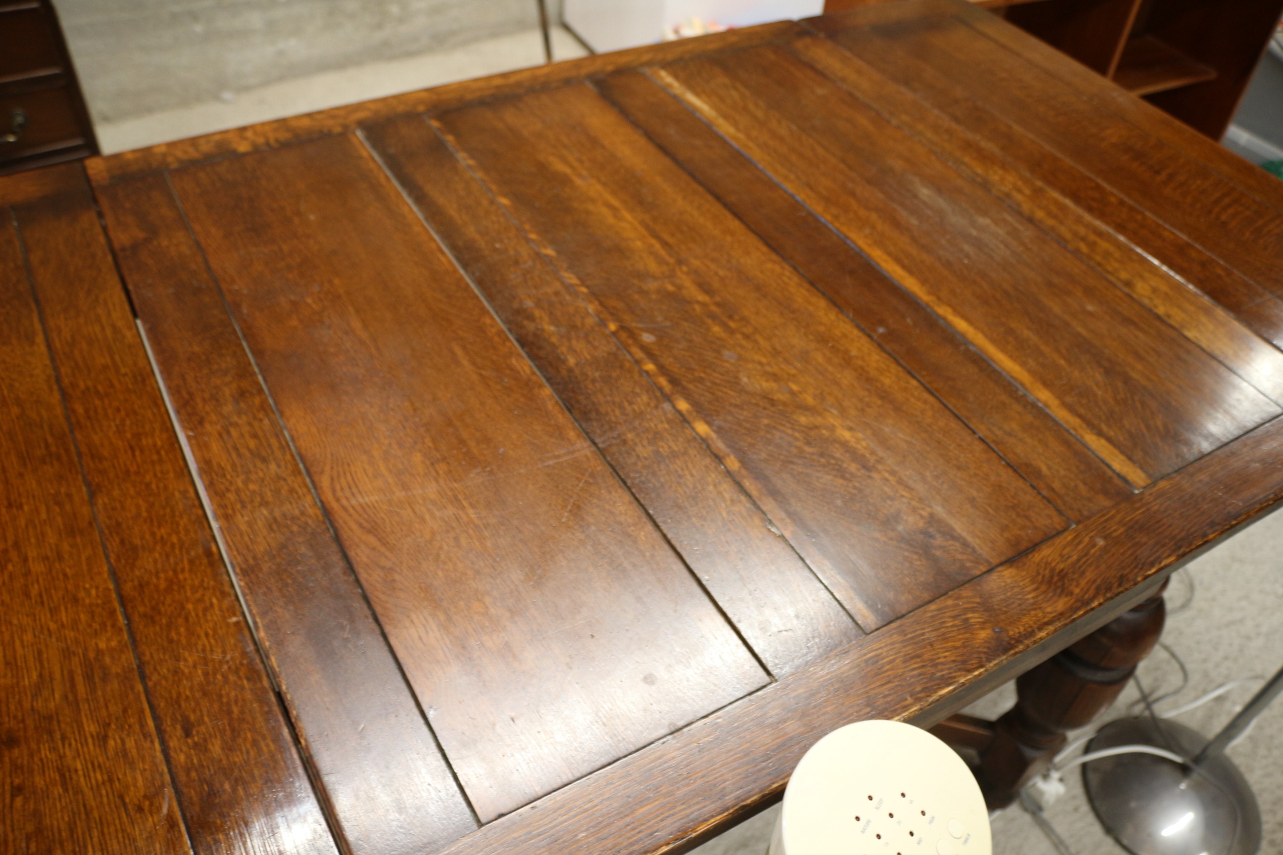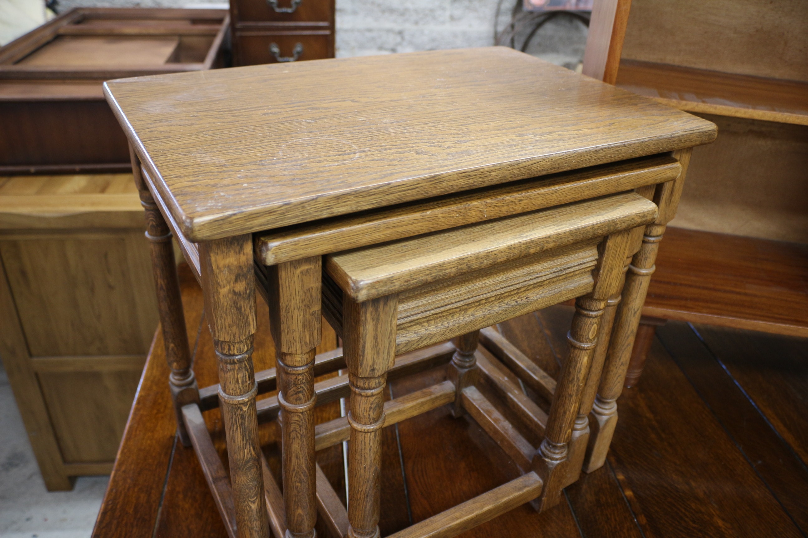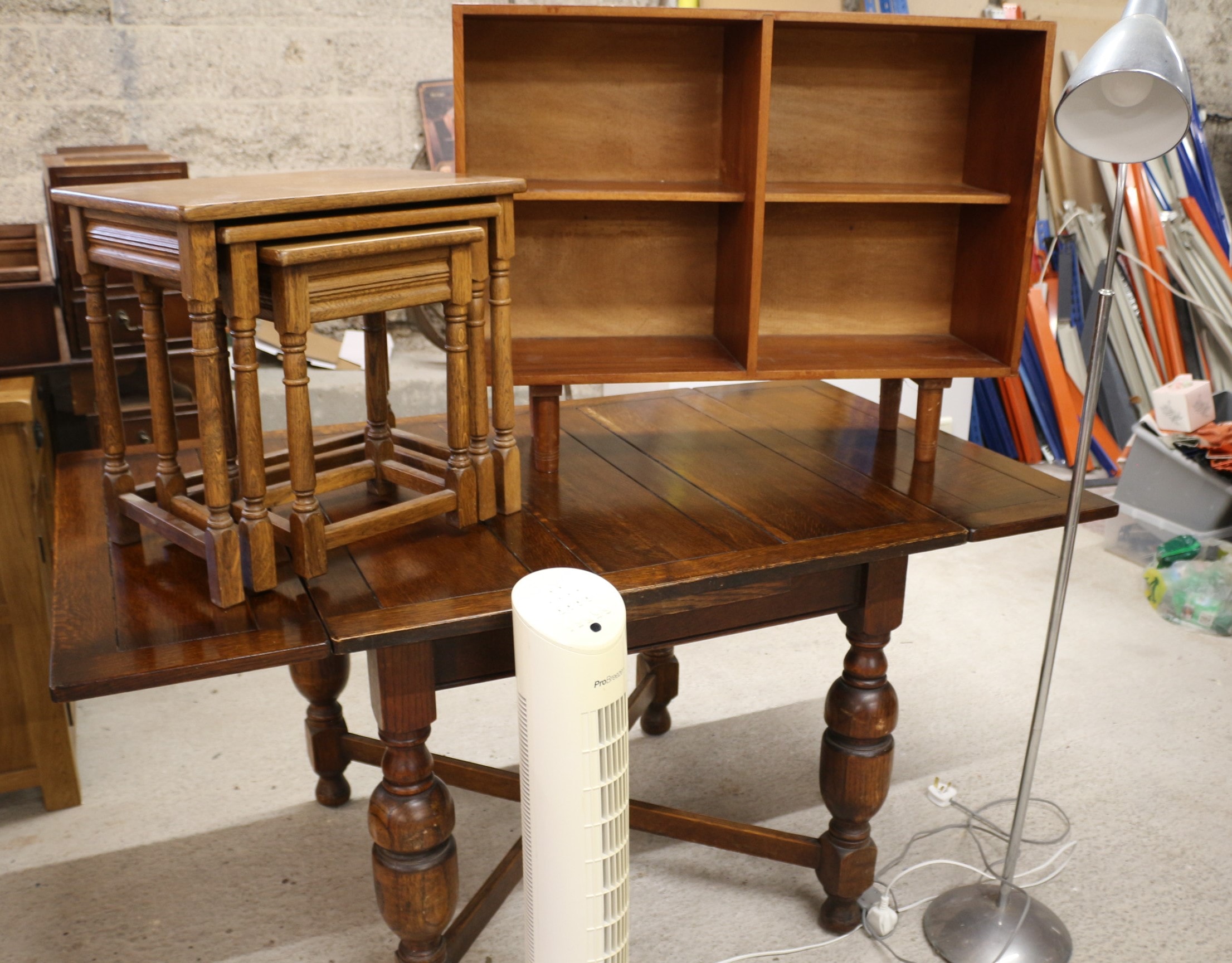 A collection comprising a set of three turned leg oak nesting tables, an dining table with turned legs, a small wooden bookshelf (AF), a ProBreeze tower fan, and a metal floor lamp.