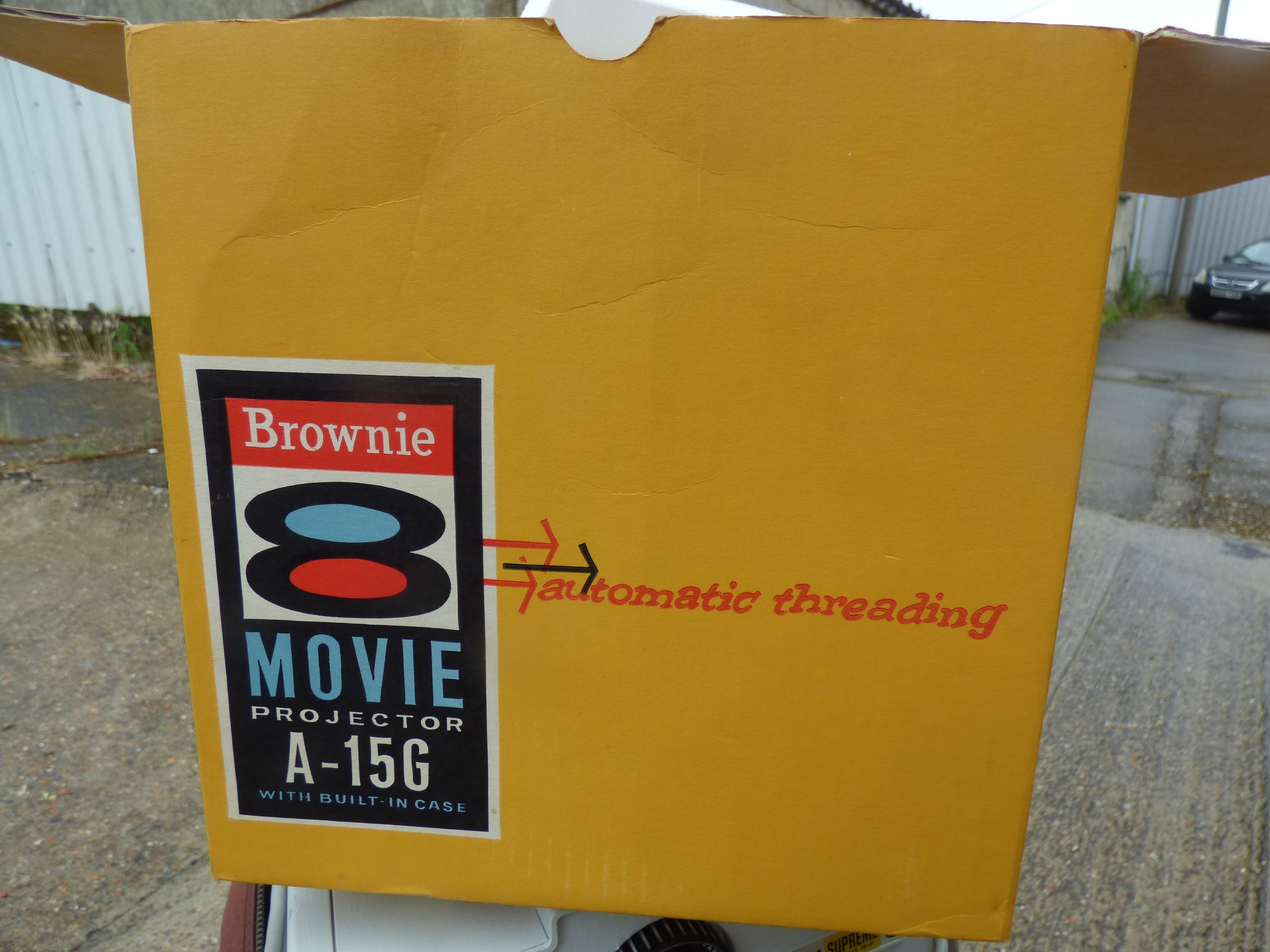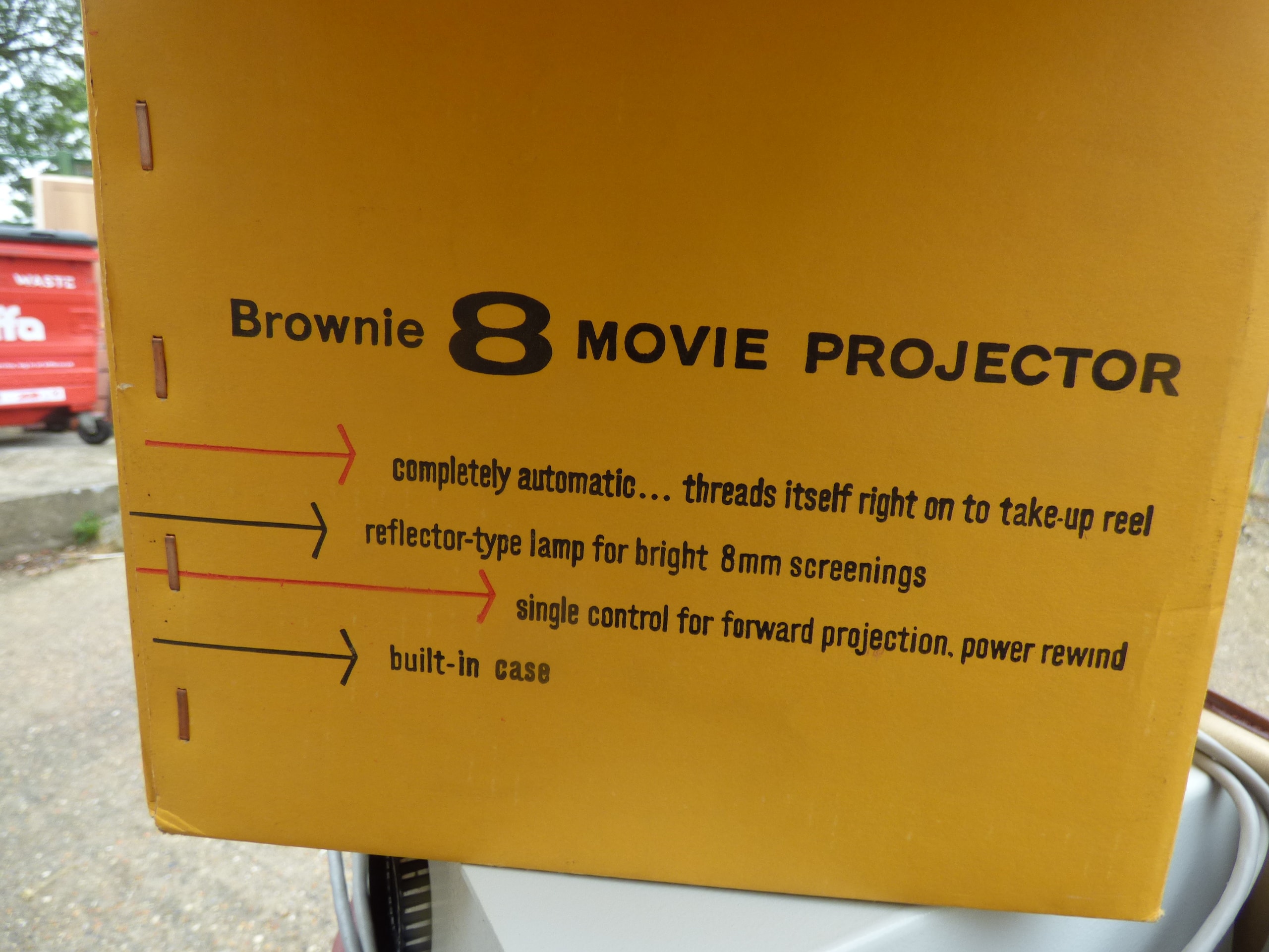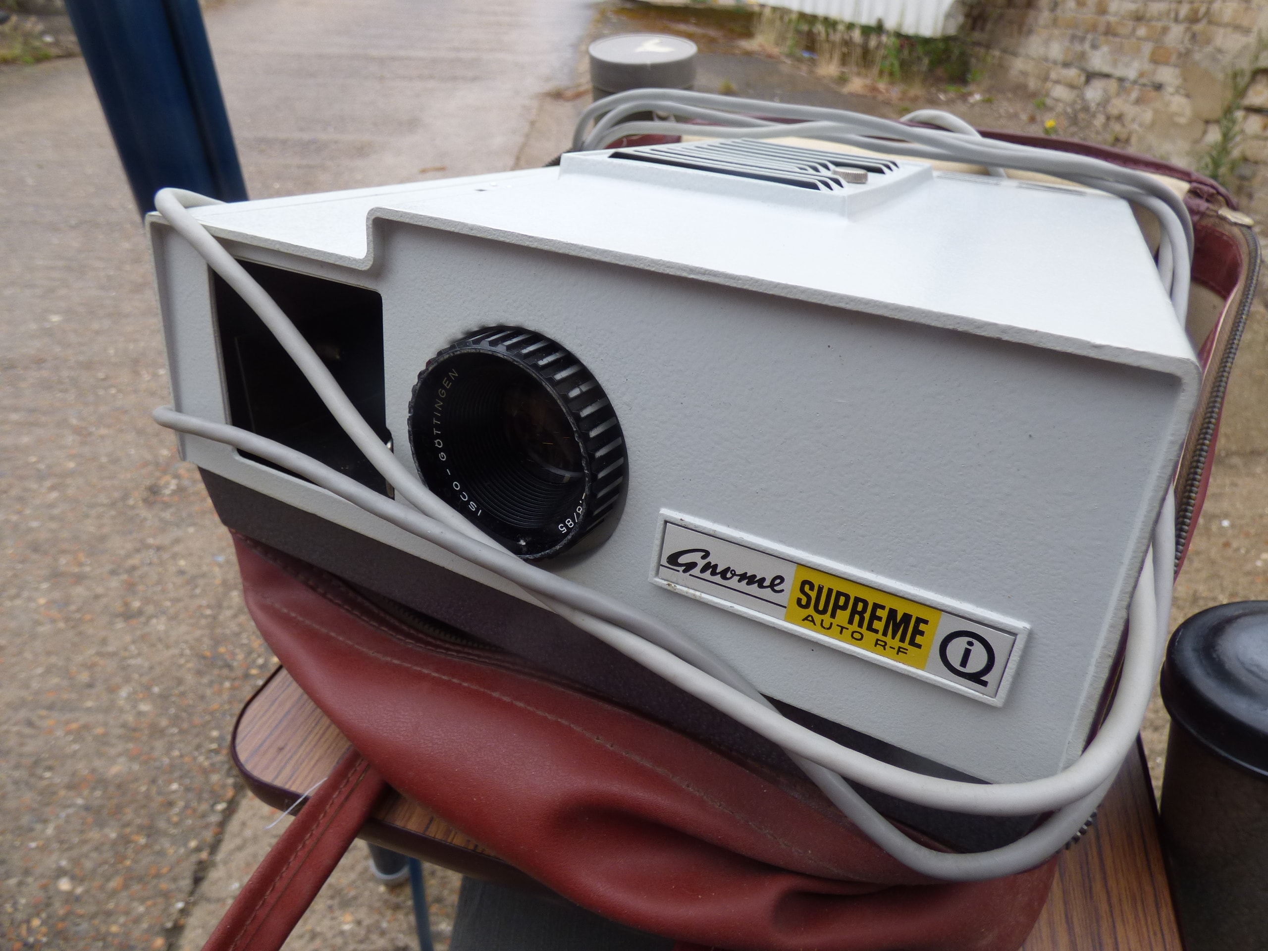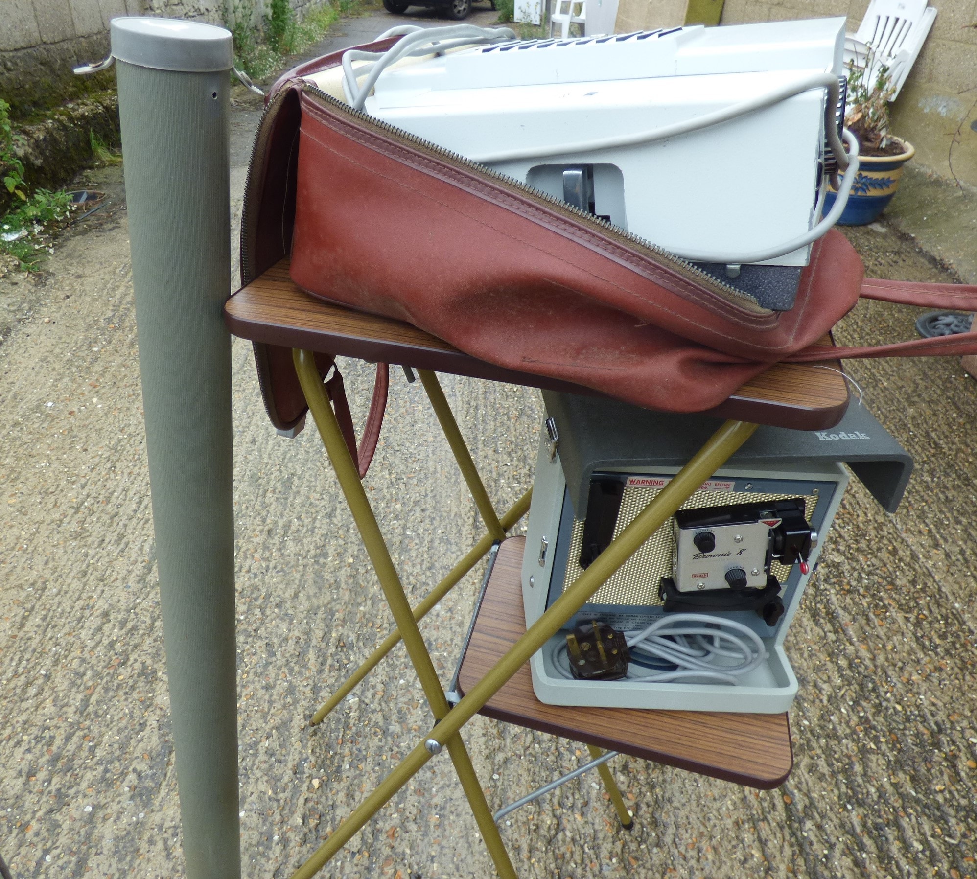 The lot contains a grey Kodak Brownie 8 Movie Projector A-15G with its yellow box noting “automatic threading” and “built-in case”, a light grey Gnome Supreme Auto R- slide projector with an ISCO GOTTTINGEN 95/85 lens and a remote labelled “FOCUS” and “SLIDE CHANGE” in a brown carry bag, a brown folding table, two grey cylindrical screen cases, and a blue projector stand. All Untested