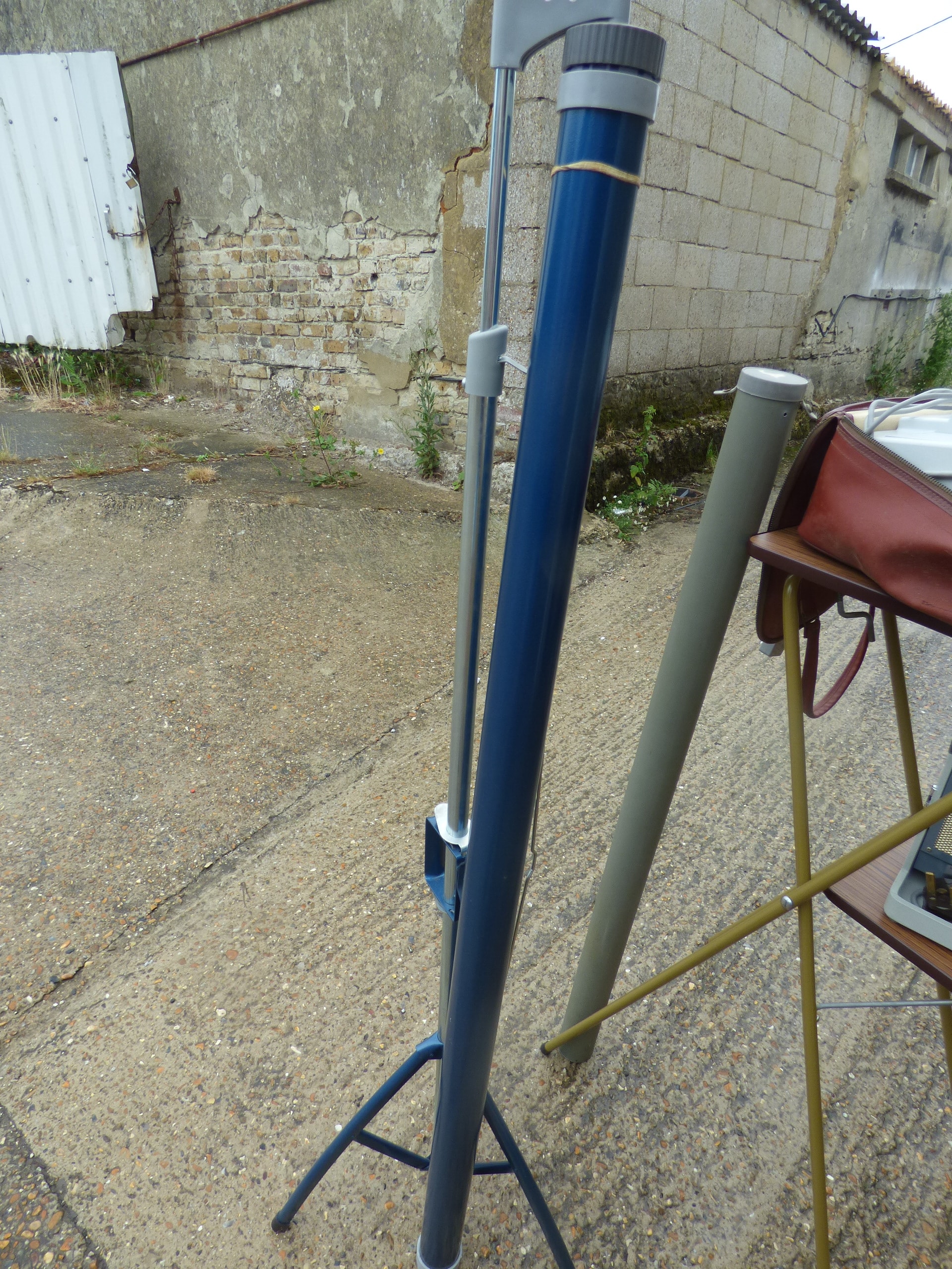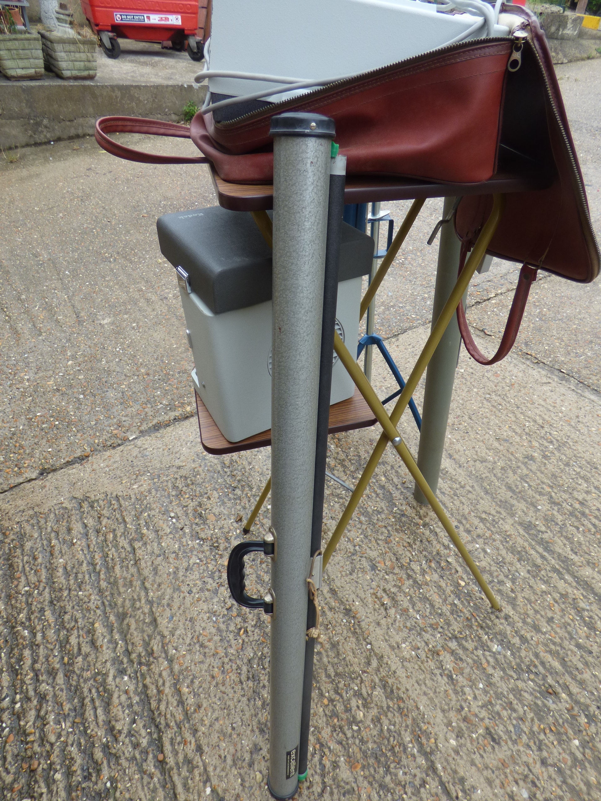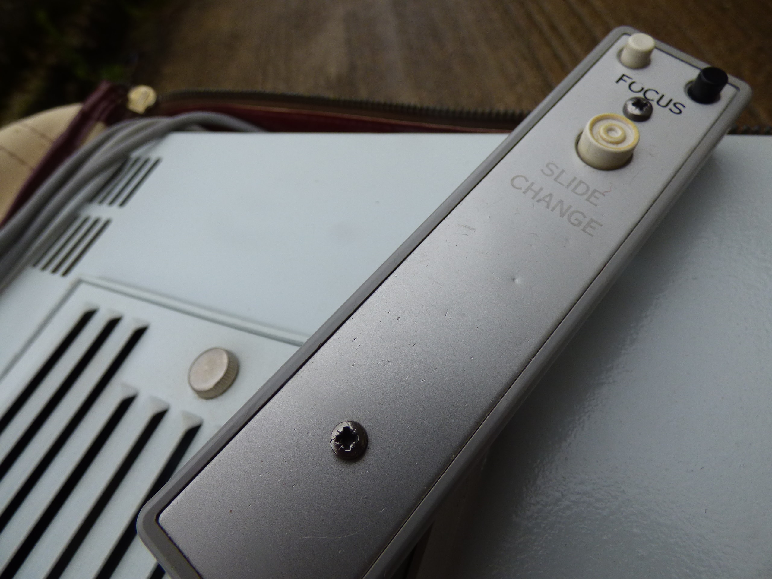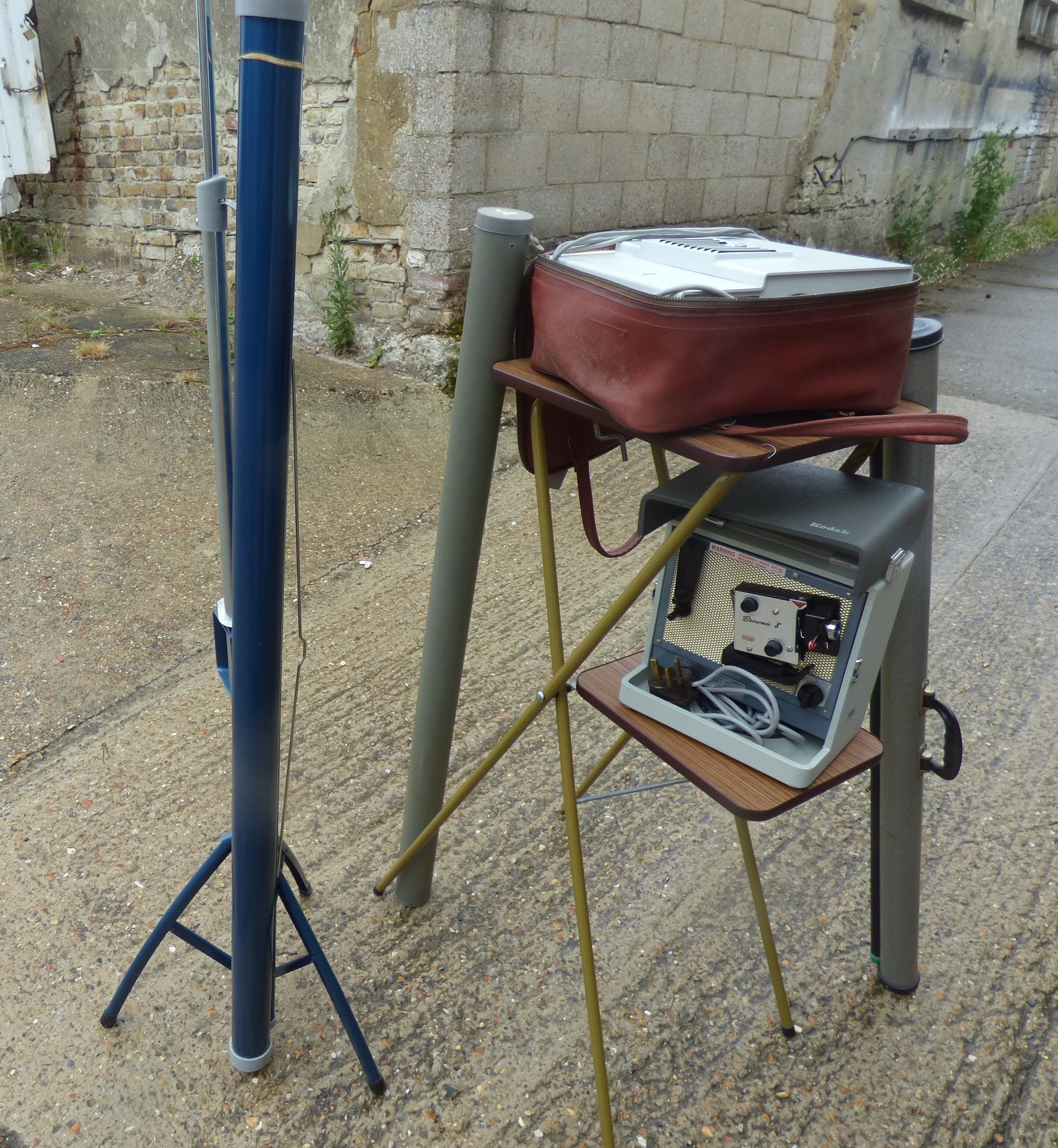 The lot contains a grey Kodak Brownie 8 Movie Projector A-15G with its yellow box noting “automatic threading” and “built-in case”, a light grey Gnome Supreme Auto R- slide projector with an ISCO GOTTTINGEN 95/85 lens and a remote labelled “FOCUS” and “SLIDE CHANGE” in a brown carry bag, a brown folding table, two grey cylindrical screen cases, and a blue projector stand. All Untested