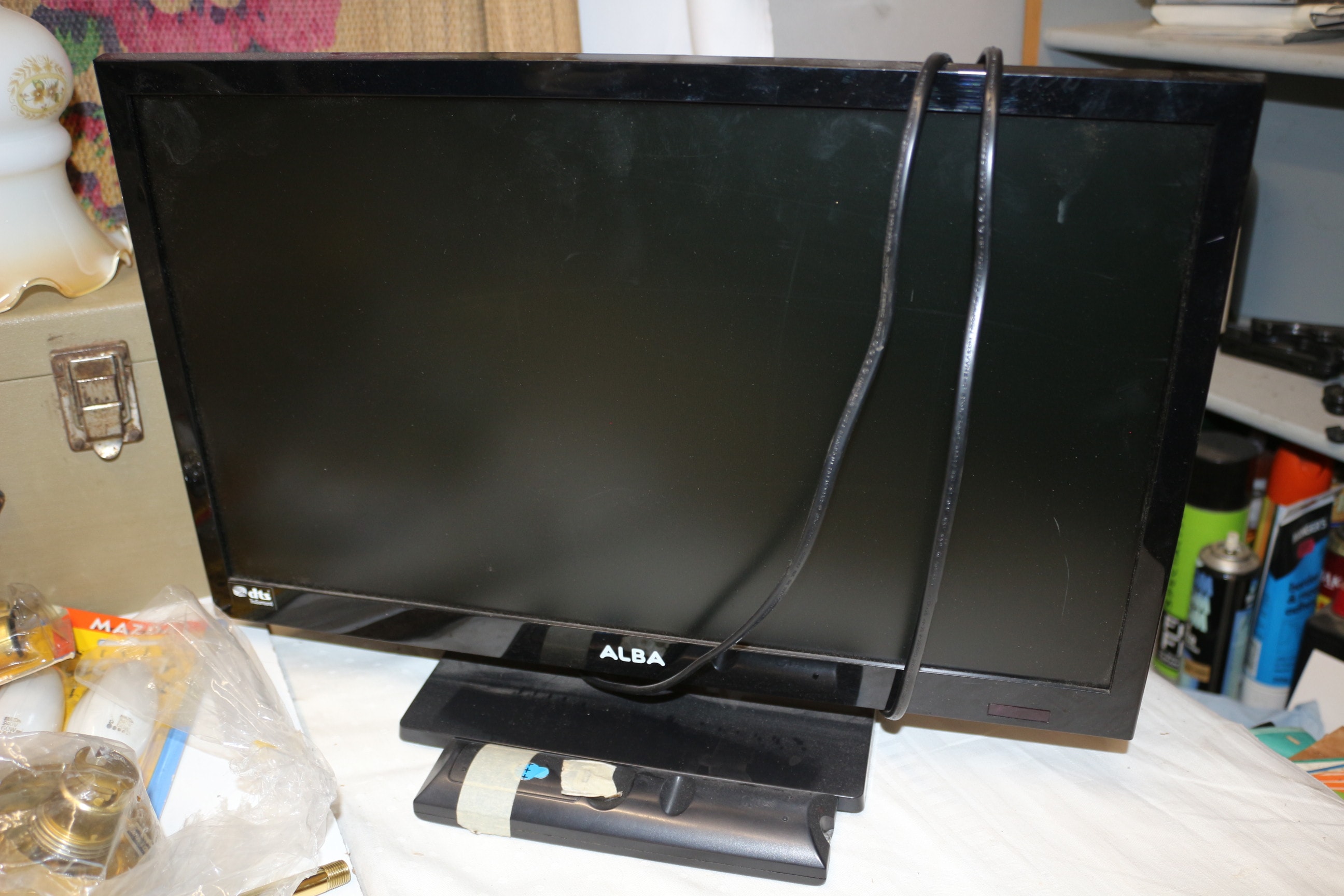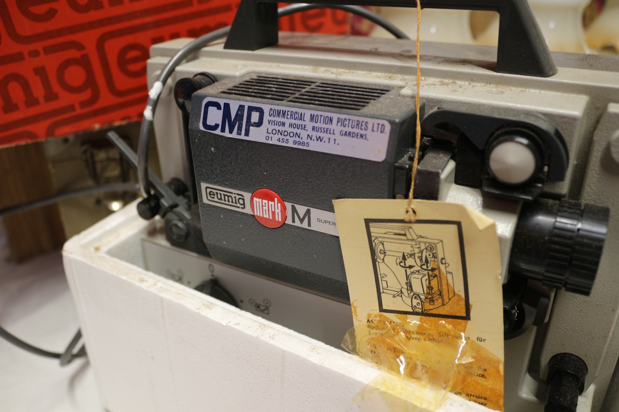 Mixed lot inc A grey and black projector, labelled “CMP COMMERCIAL MOTION PICTURES LTD.” and “eumig mark M SUPER”, features a brown tag with diagrams and German text including “Anschlußplan”. 19″ Alba TV, Light, Woven Mat and More. Untested