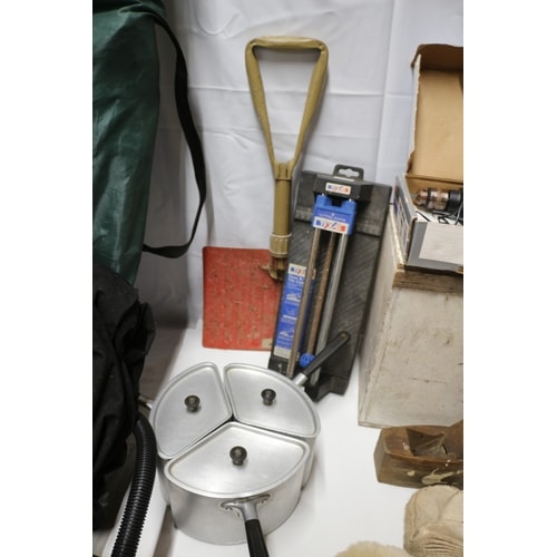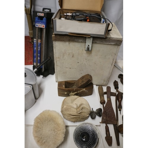 A collection including two dark green camping chairs, an aluminium three-compartment cooking pot, a tan digging tool, a D-Cut measuring tool, a white wooden chest, a BLACK+DECKER 9043 9.6V 8mm black and orange cordless drill with charger, a red corded drill, a wooden hand plane, several cream polishing pads, a silver grinding disc, various metal and wood-handled hand tools, a black carry bag, and two yellow/black flat objects.