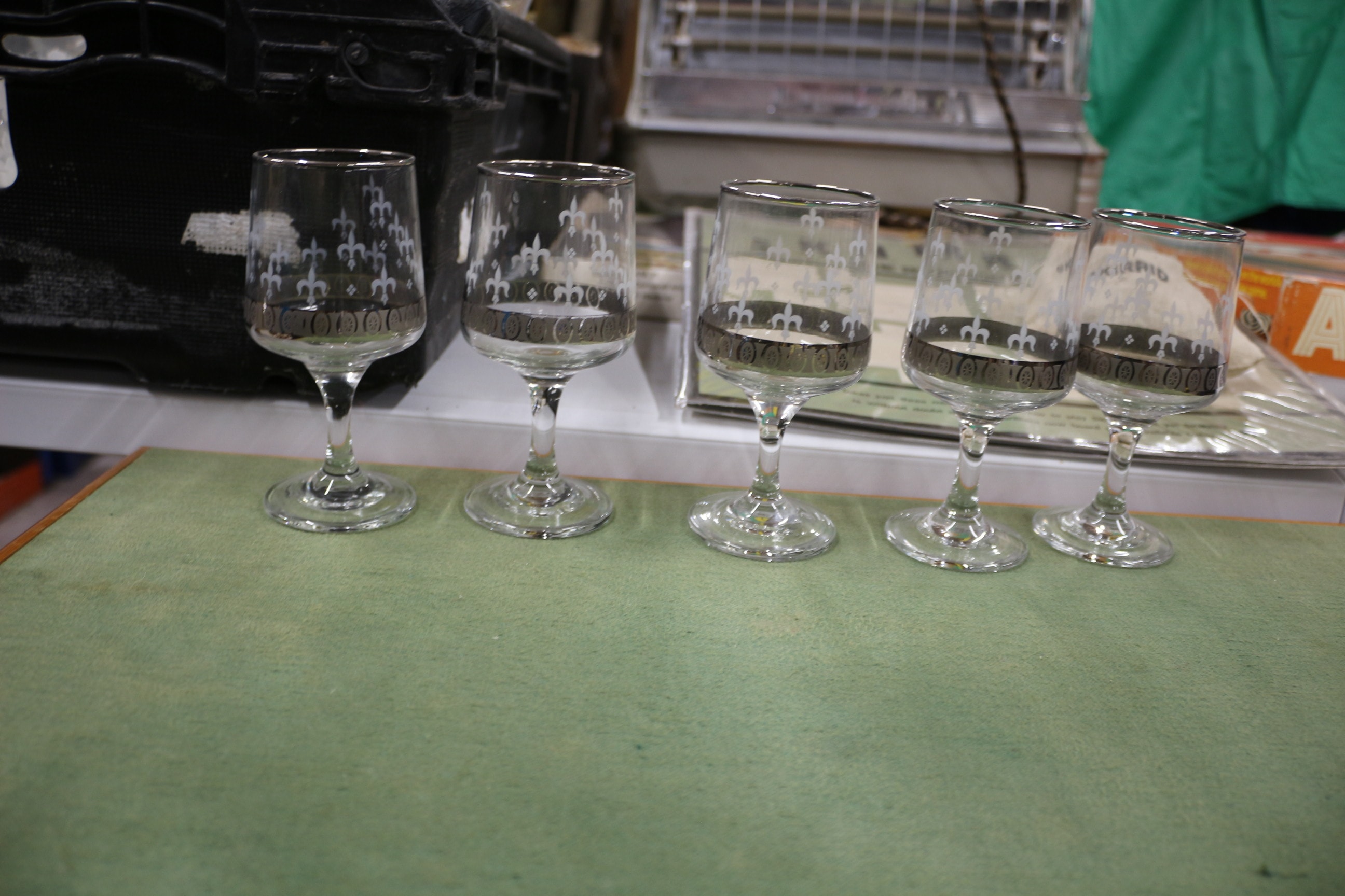 A large collection of approximately 30-40+ clear glass drinking glasses and bowls, with some featuring gold-coloured rims and others showcasing frosted floral or leaf patterns.