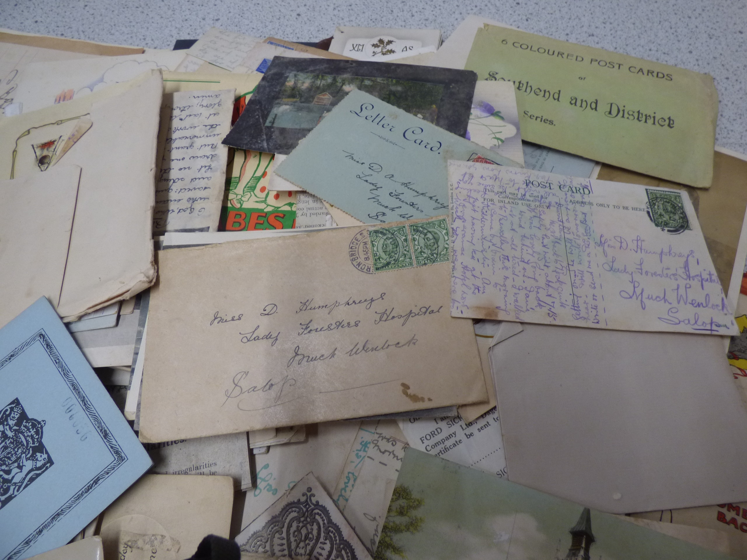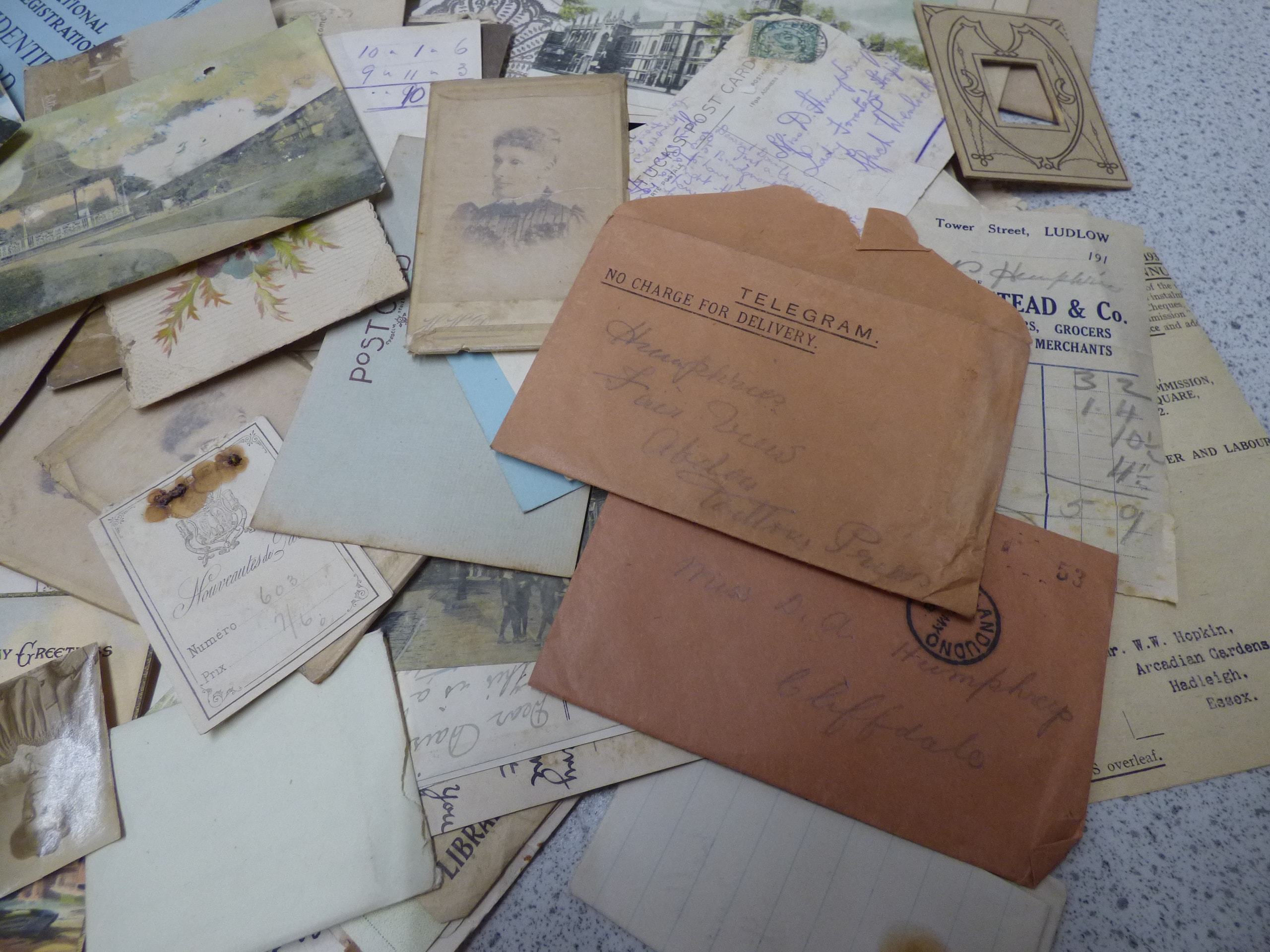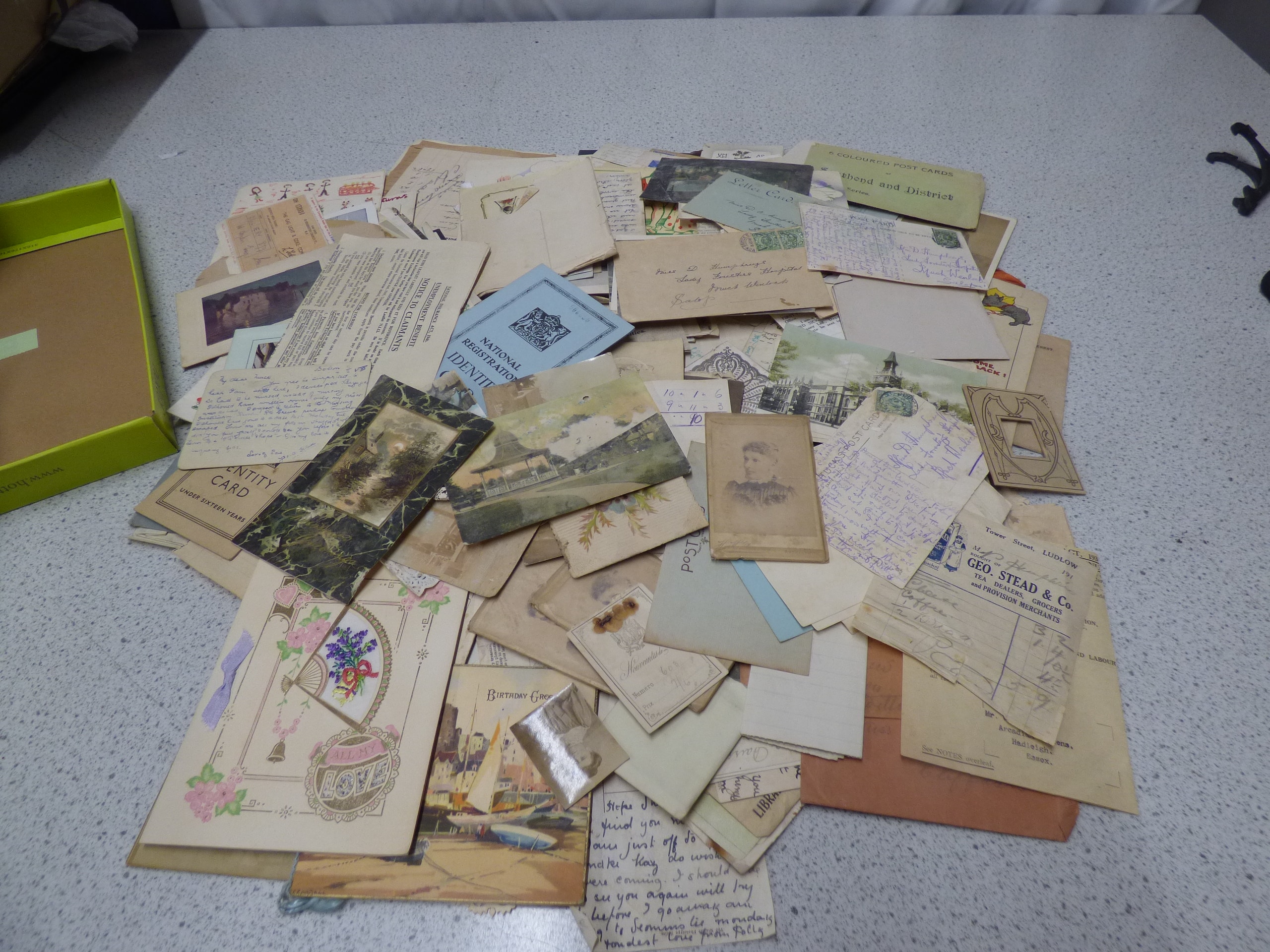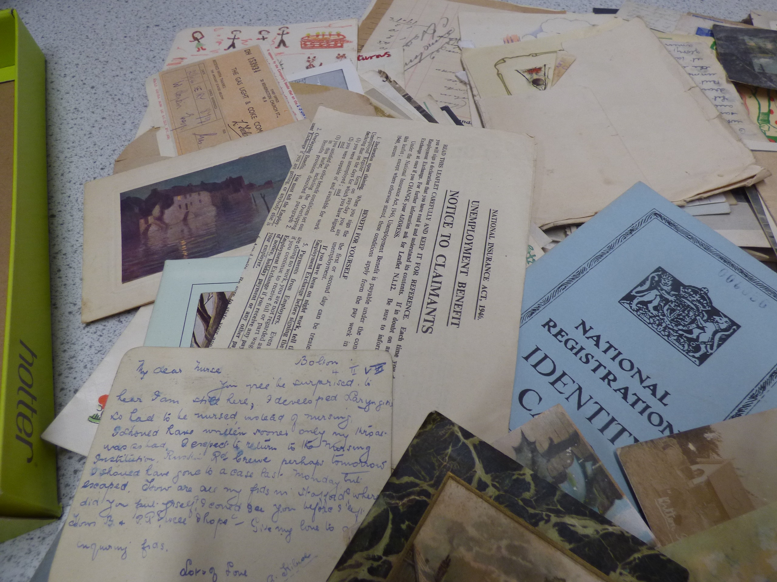 A collection of assorted paper ephemera, including letters, postcards, envelopes, greeting cards, and documents like a National Registration Identity Card.