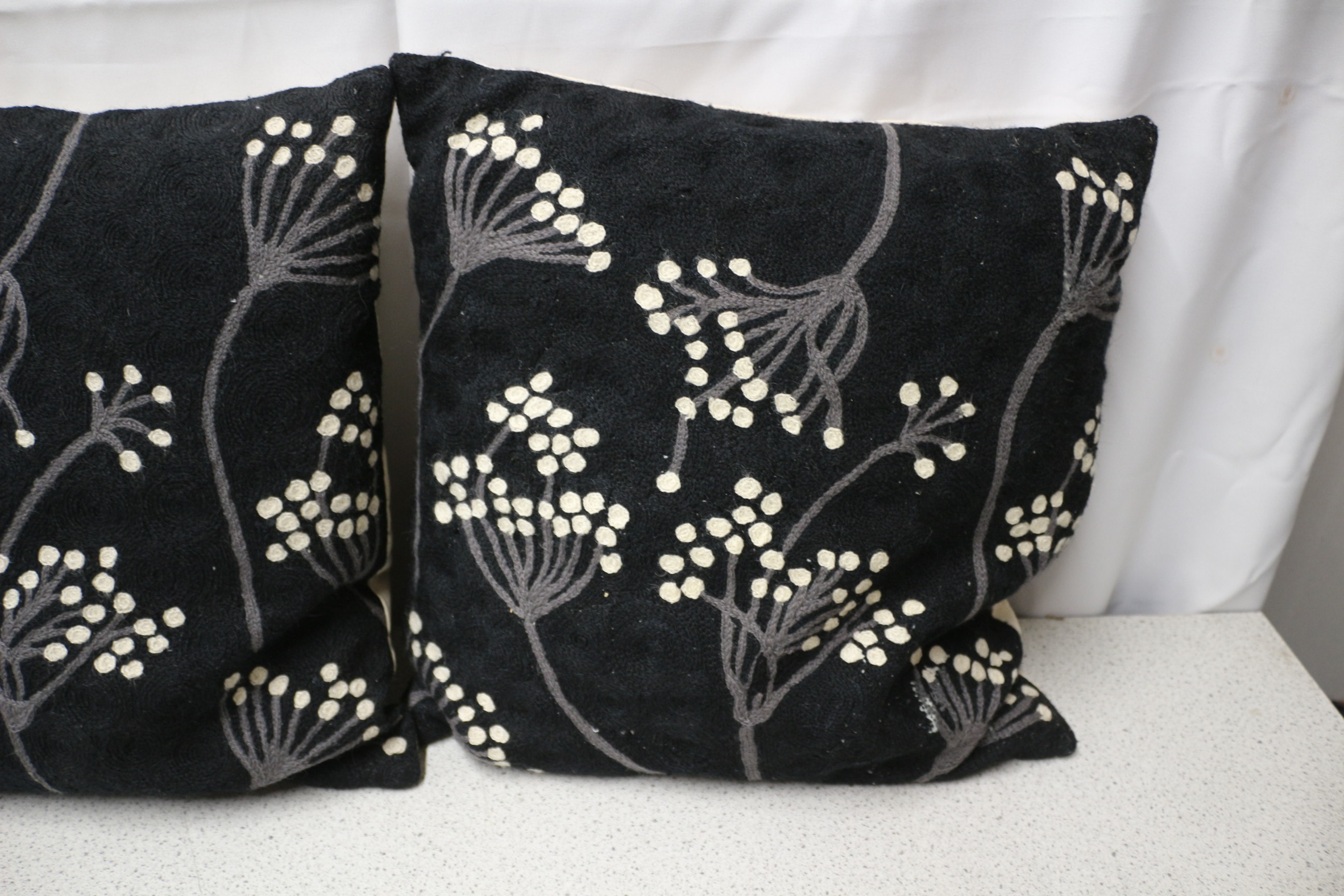 A pair of black throw pillows with a grey and white floral/seed head pattern.