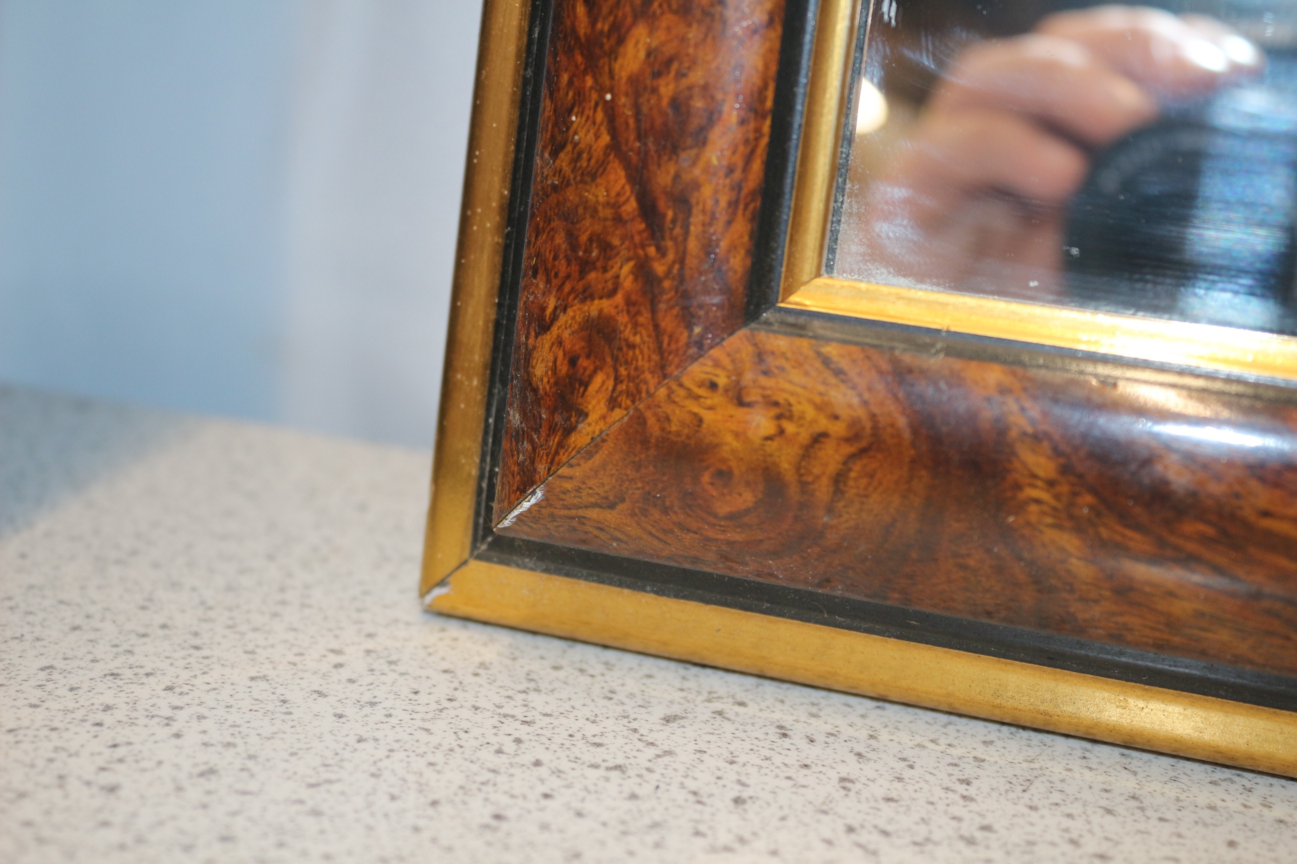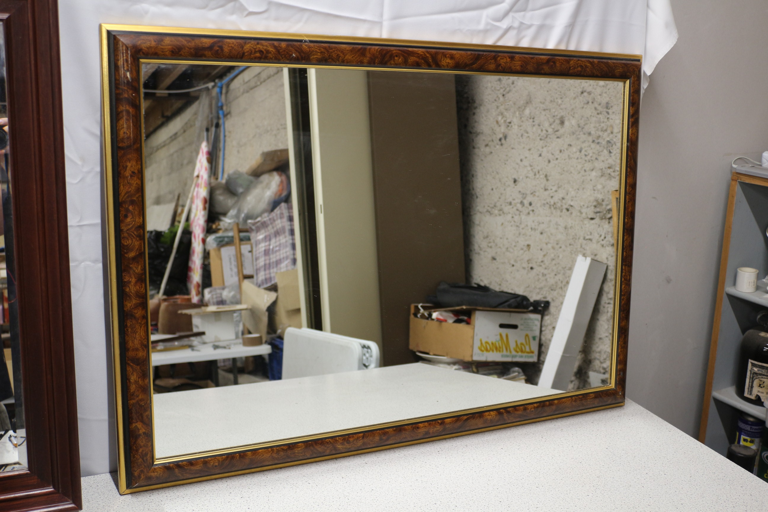 A large rectangular wall mirror with a brown burl wood pattern frame and gold-coloured trim. 70.5x101cm