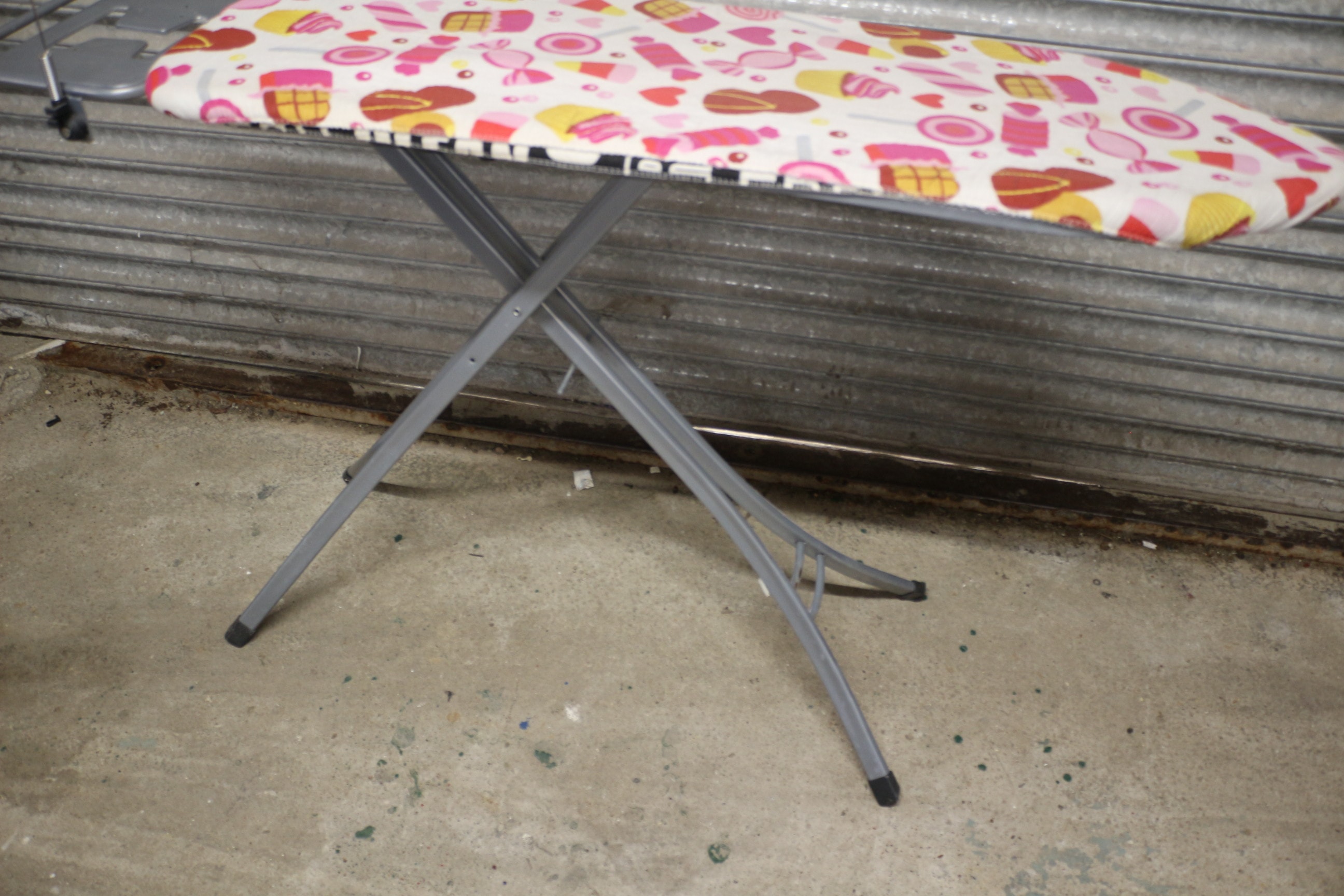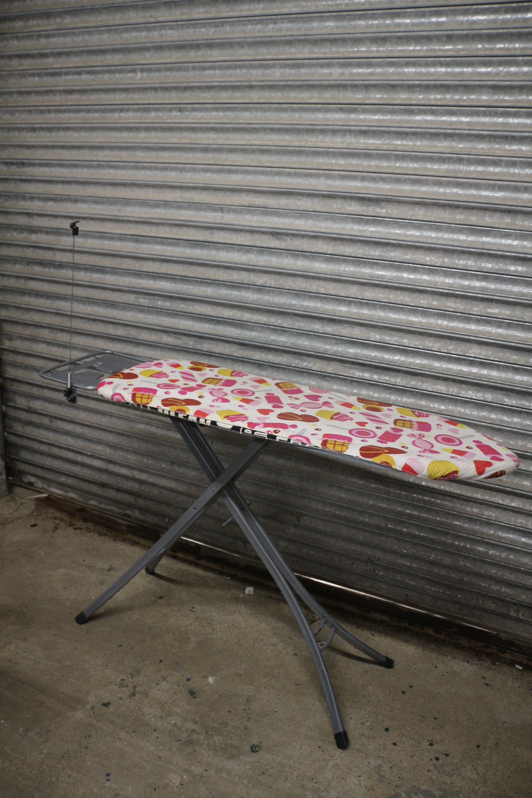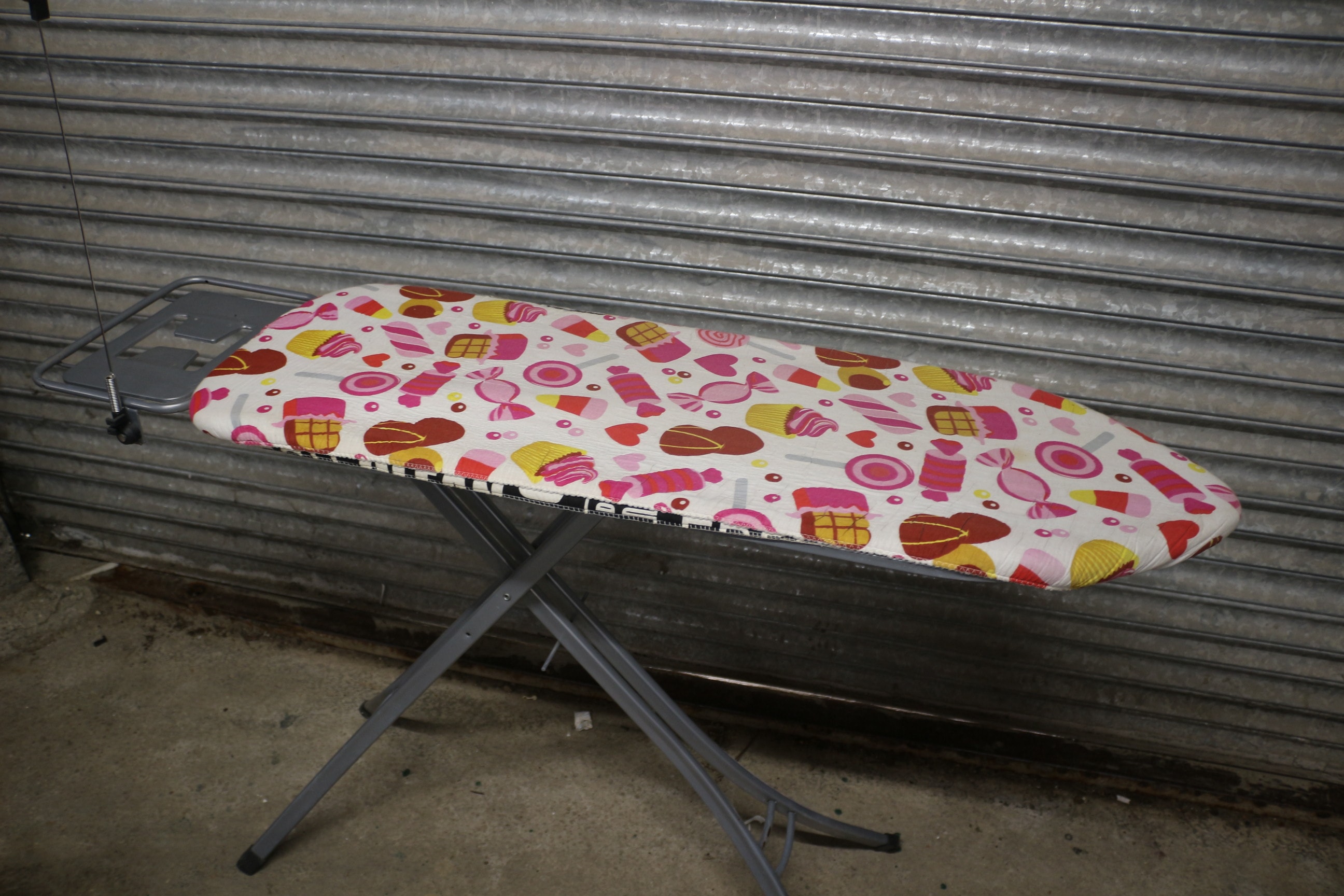 A grey wide ironing board with a white cover patterned with pink, red, yellow, and brown hearts, cupcakes, and candies.