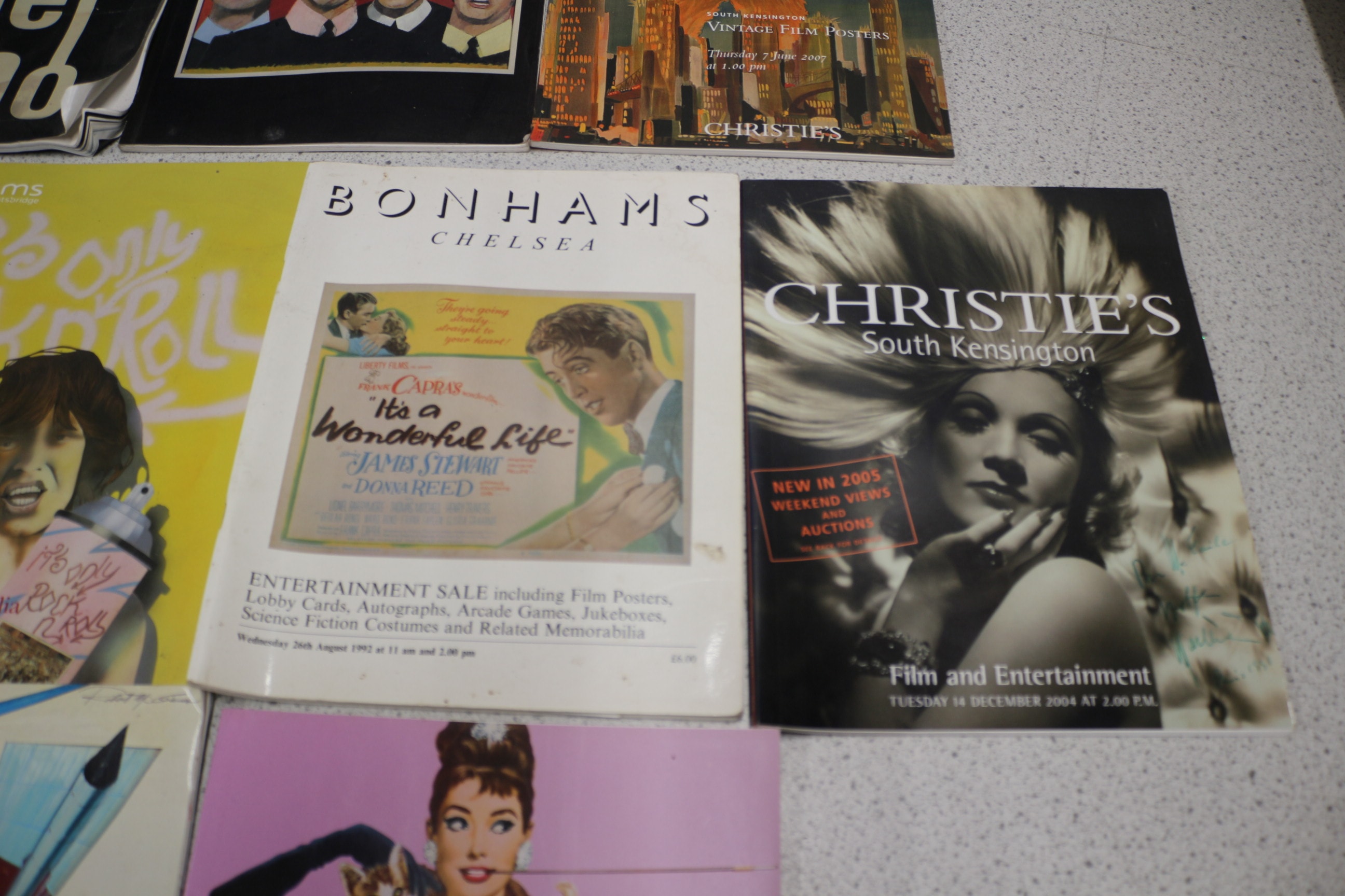 Collection of auction catalogues, including A white and blue Christie’s “VINTAGE FILM POSTERS” auction catalog, dated Wednesday 15 June 2011 at 11.00 AM, features a multi-color illustration of a James Bond-like character alongside a woman with a turbulent background. Sotherbys and Bonhams