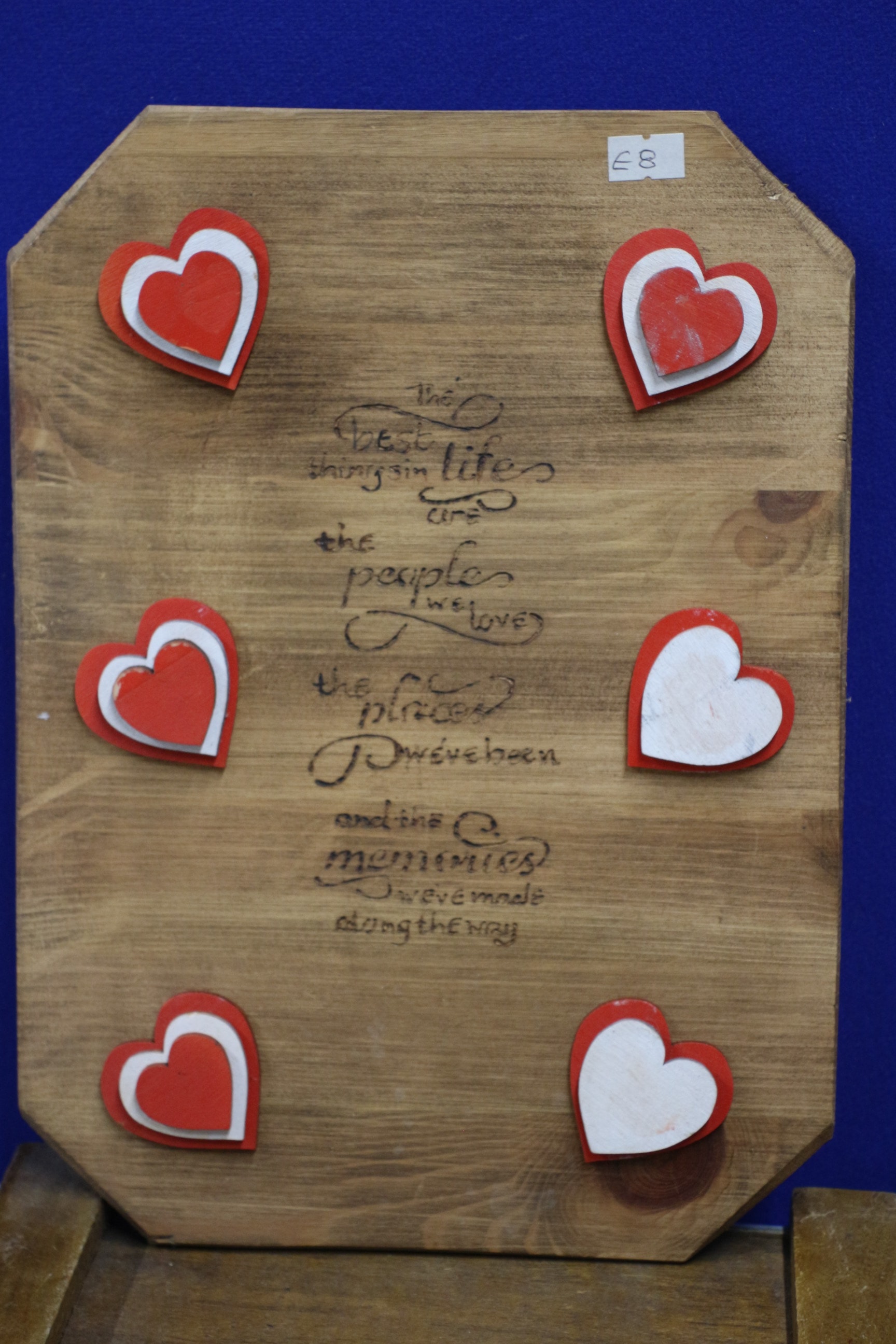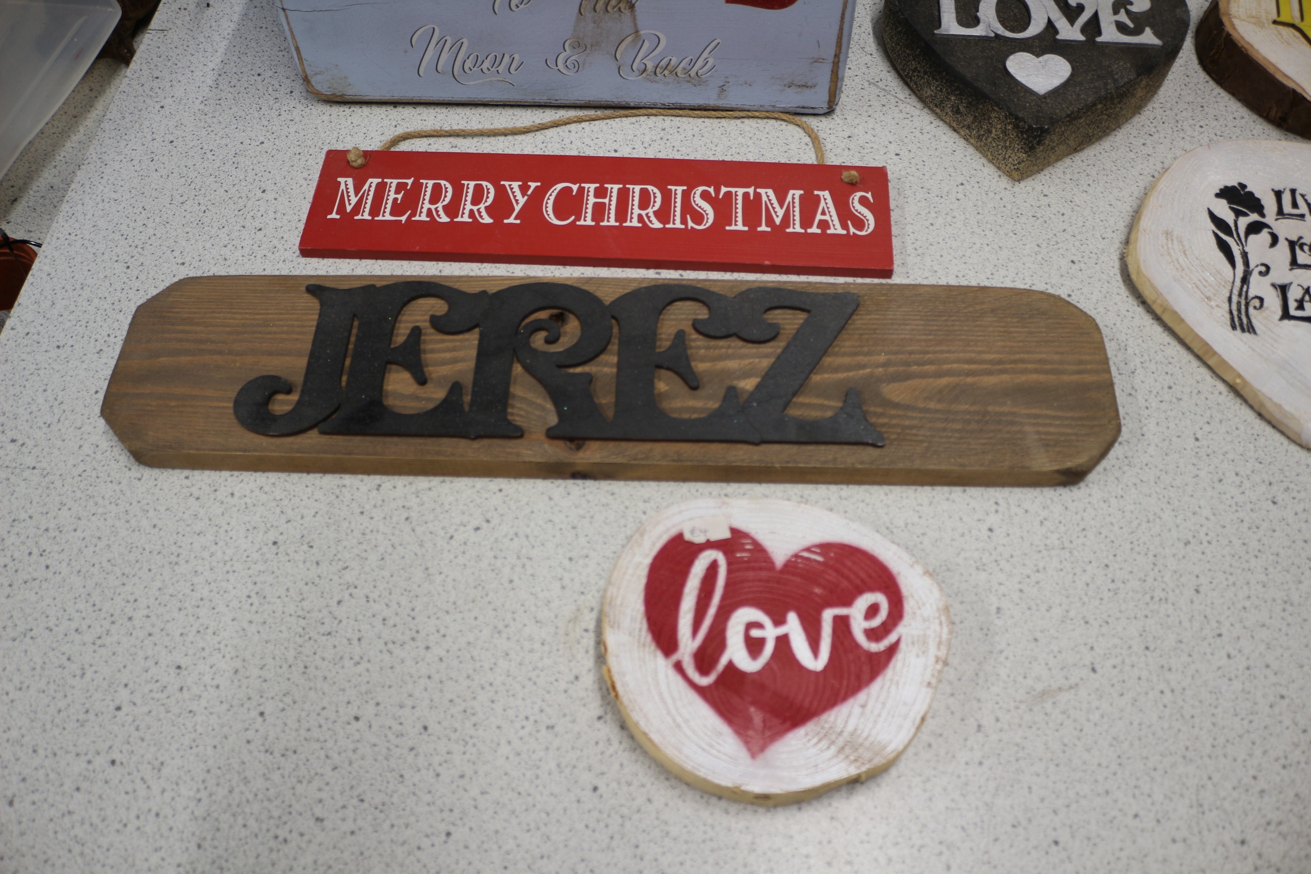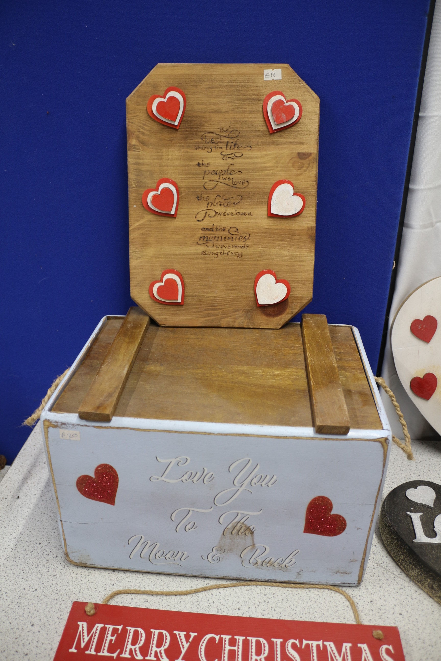 A single white wooden storage box with a natural wood lid and rope handles, decorated with two red glitter hearts and the inscription ‘Love You To The Moon & Back’. Collection of wooden signs