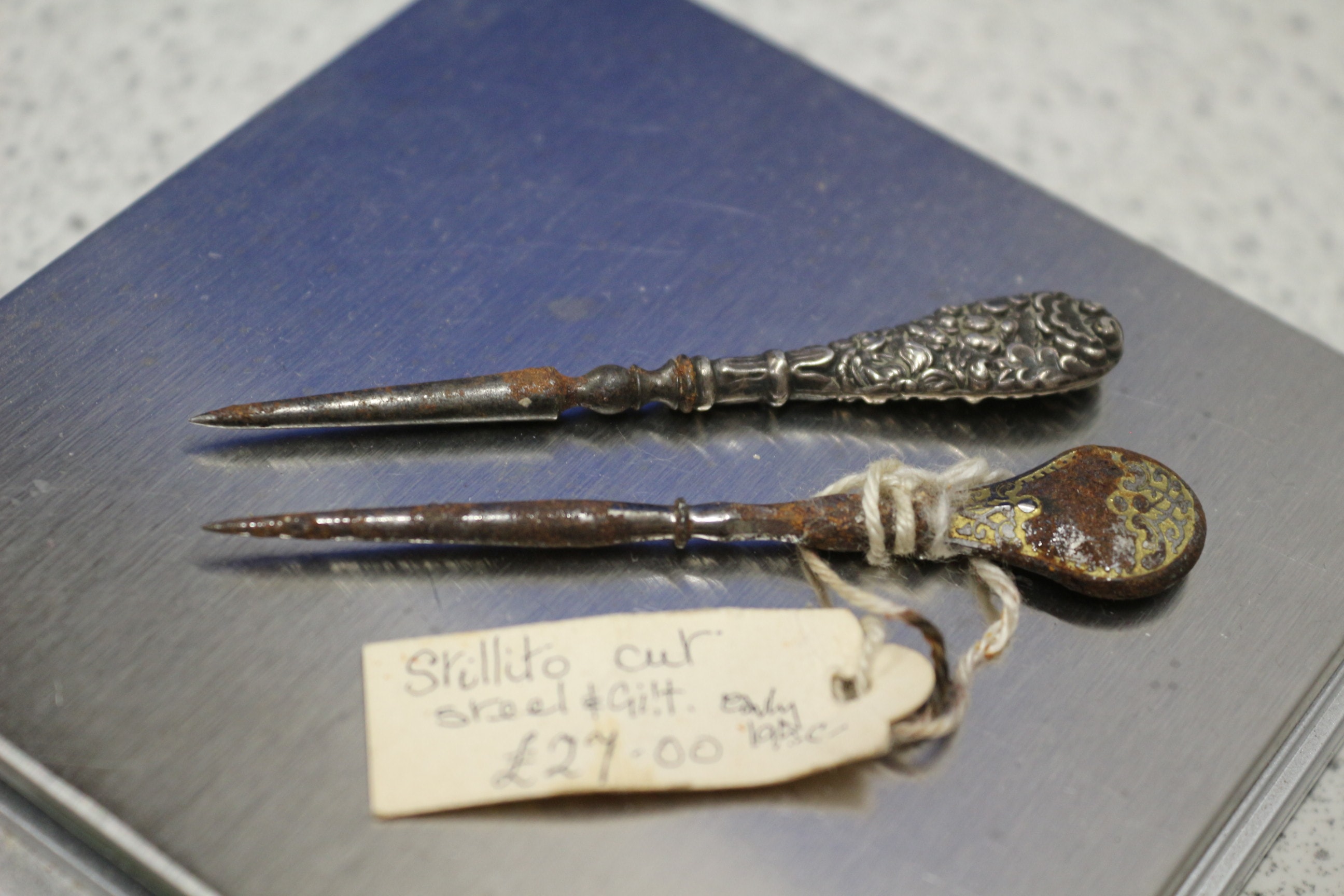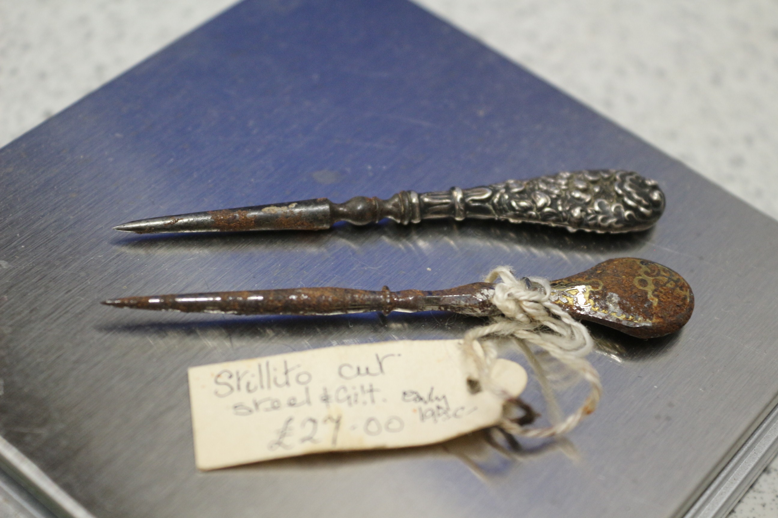 A pair of early steel and gilt sewing tools, one silver-coloured with an ornate handle, the other rusty brown with a patterned gilt handle, with a tag reading ‘Stillito cut’.