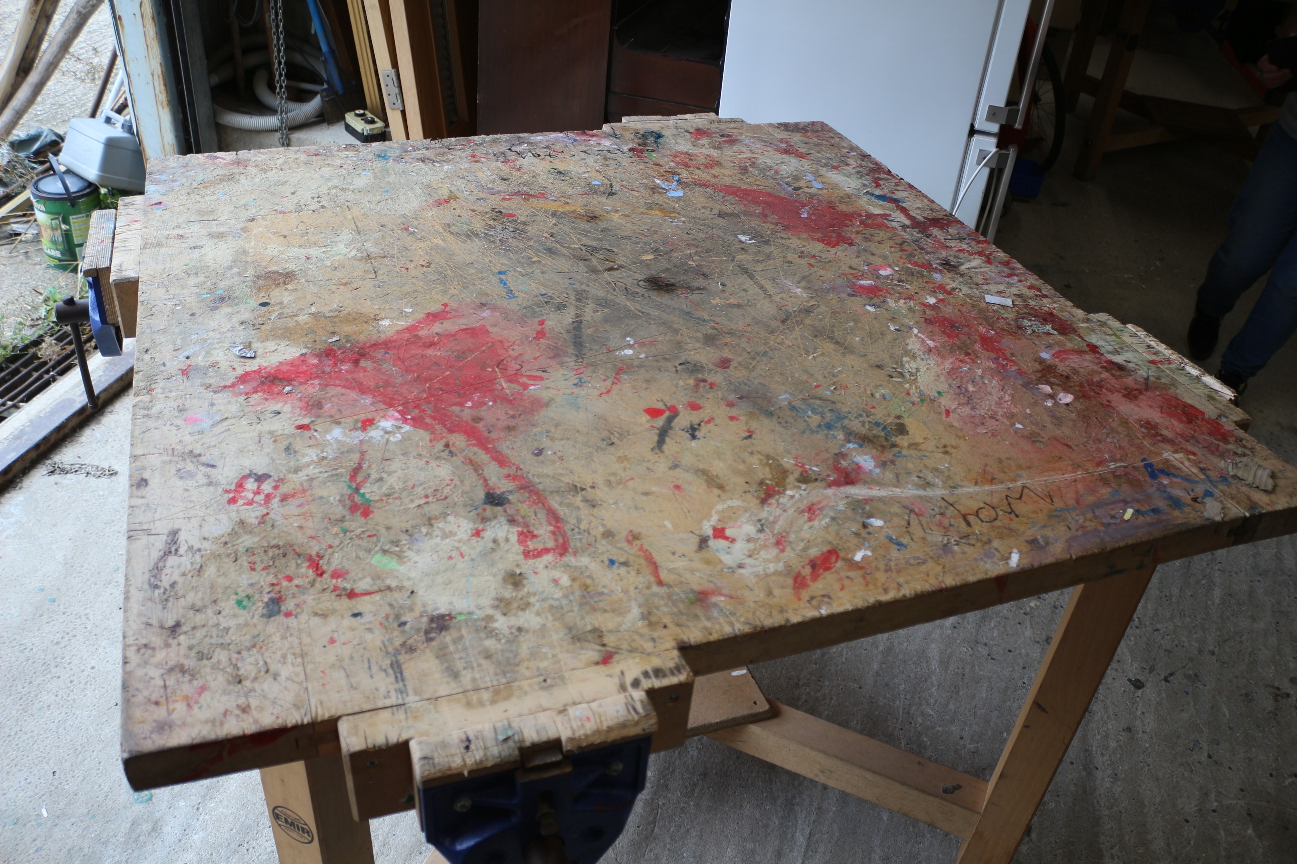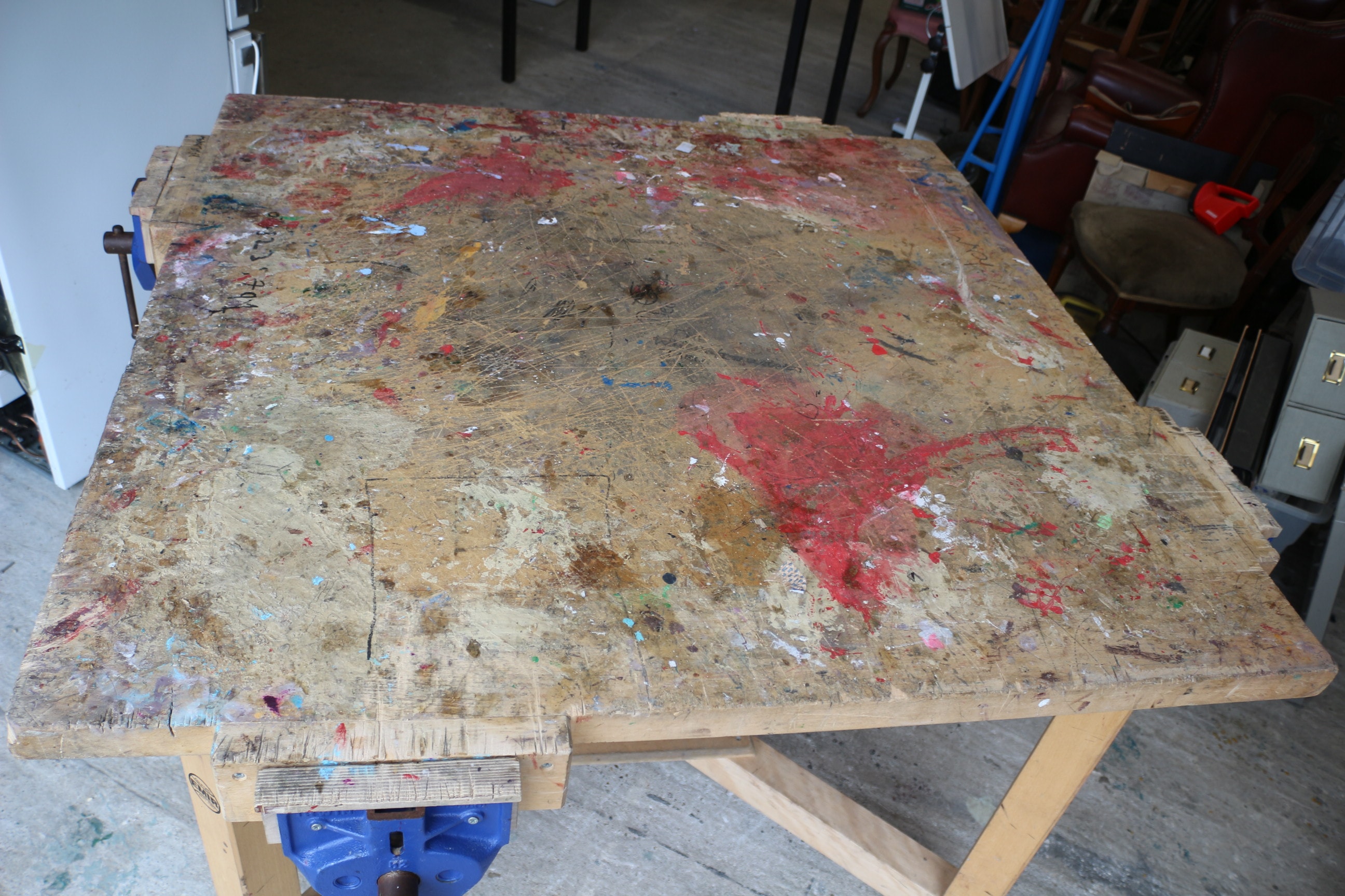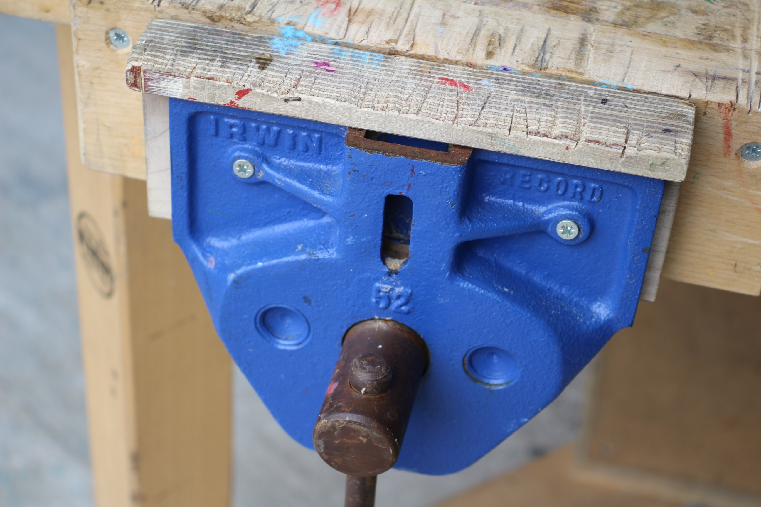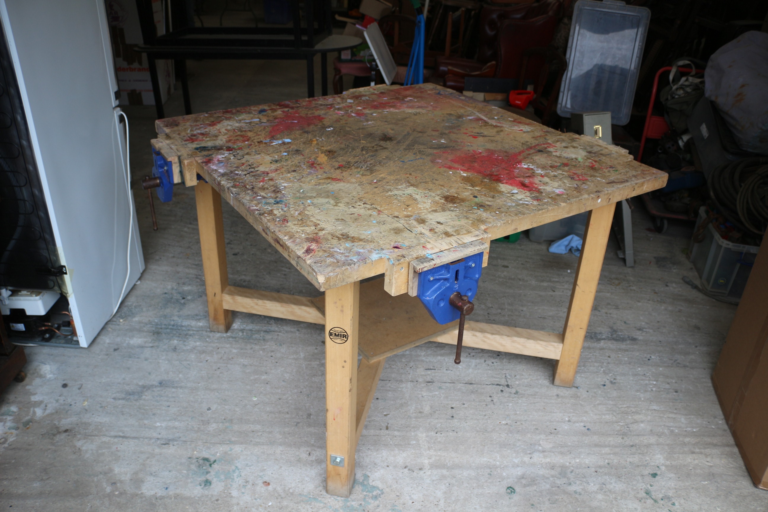 Used wooden school workbench by ASHFORD EMIR KENT (UK), with vices. 85cm tall, 122x122cm. Same photos used for all 3 lots, all benches in the same condition