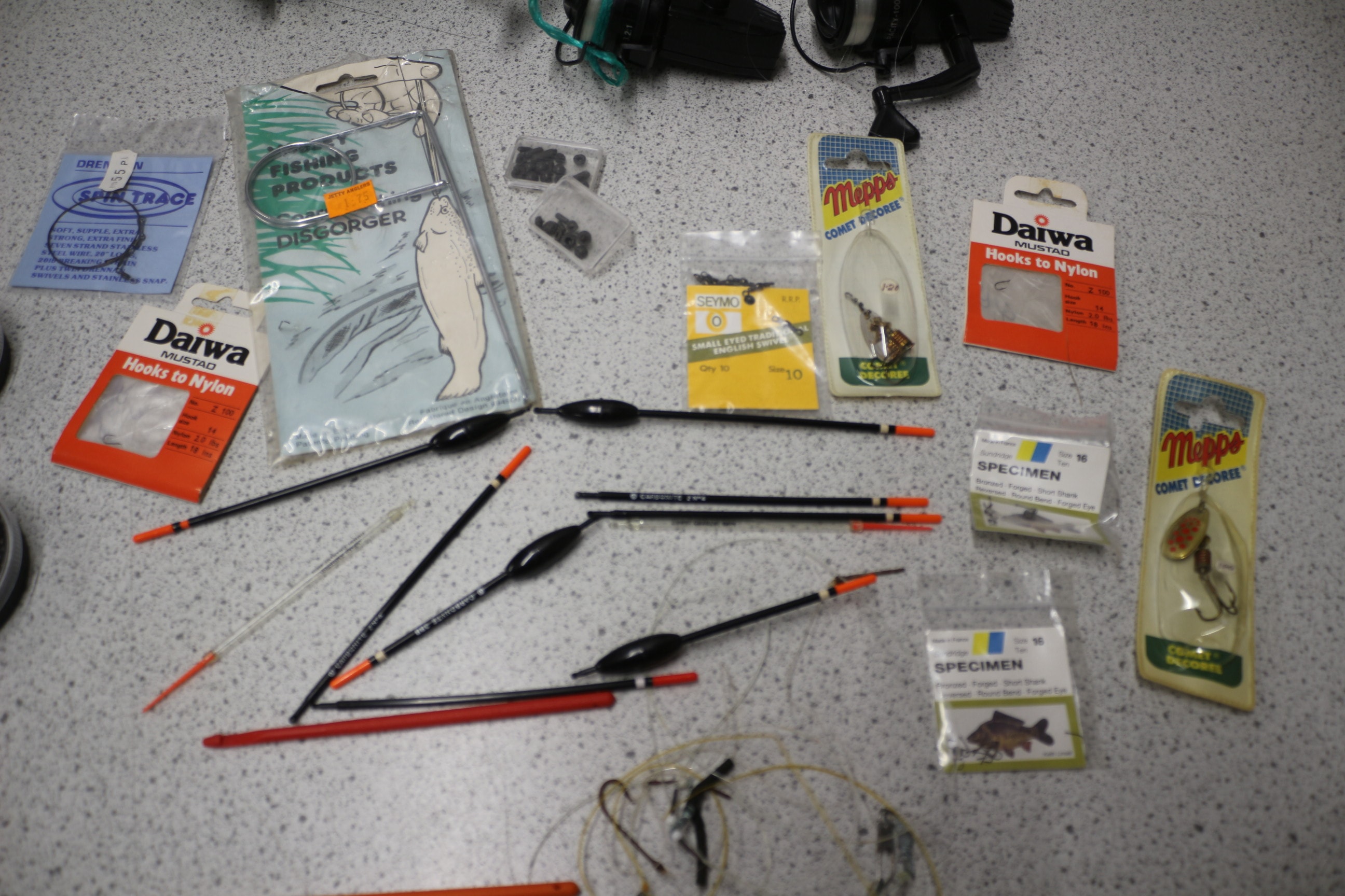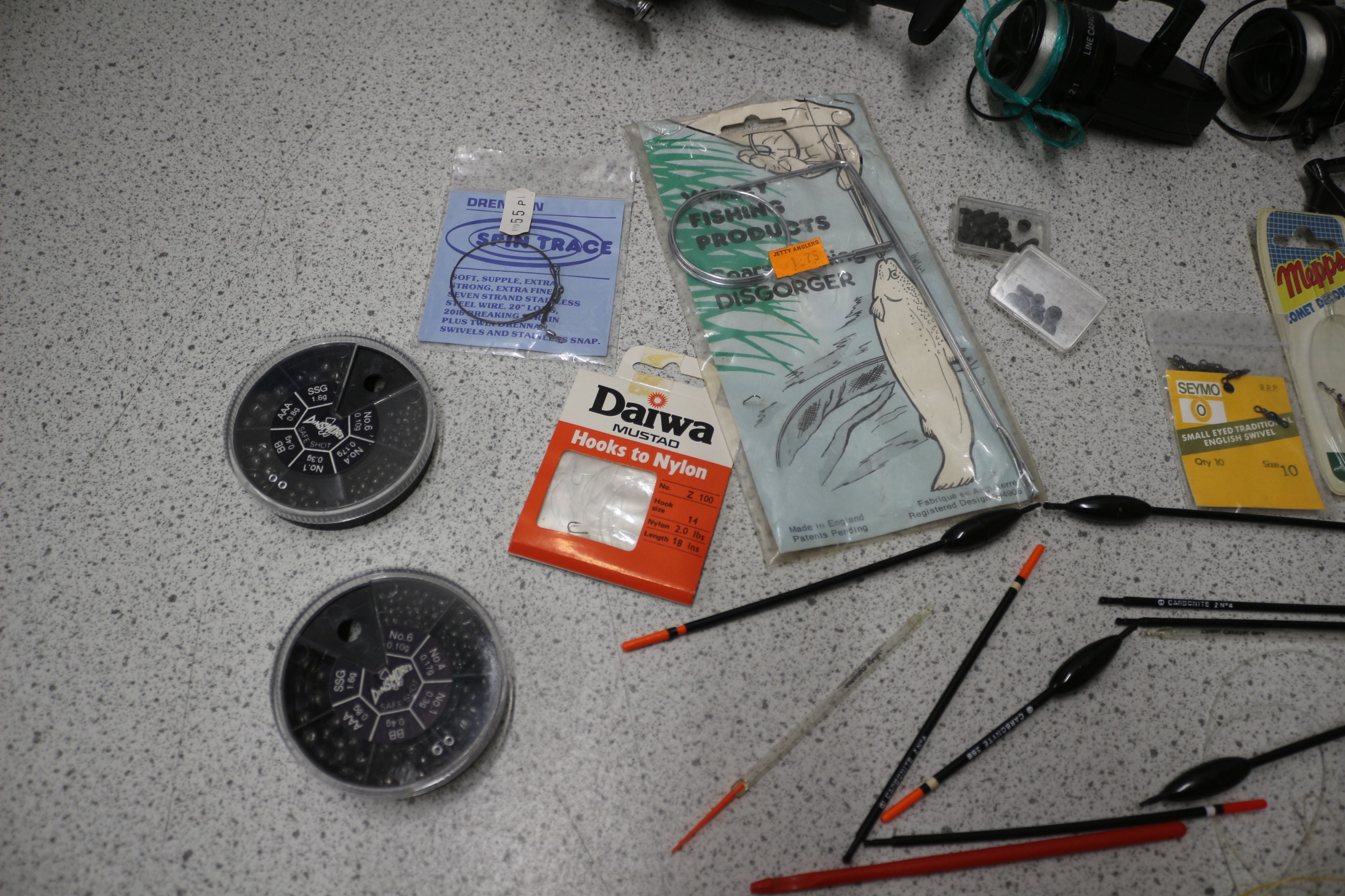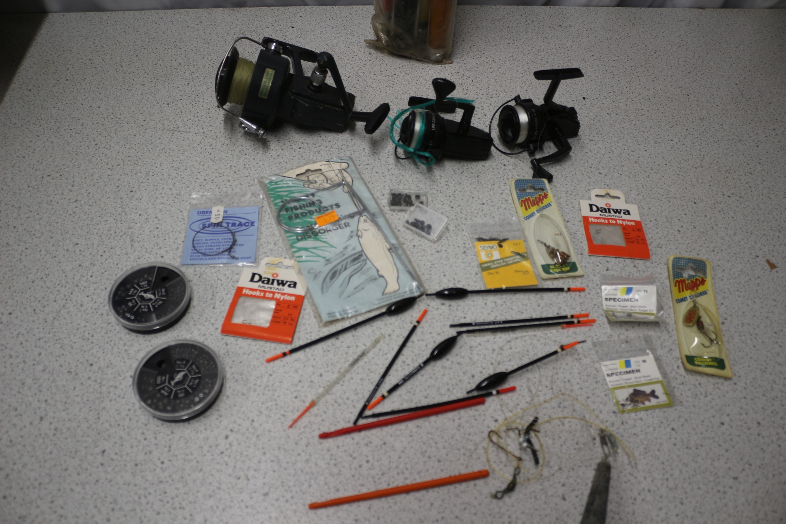 A collection of fishing rods (one Shakespeare 4500 70), three black fishing reels inc Daiwa (one MADE IN JAPAN, two CAPACITY 100YDS 4LBS), and various fishing tackle including Daiwa MUSTAD hooks, Mappo Comet lures, Drennan line, and a Fishing Products Disgorger AF