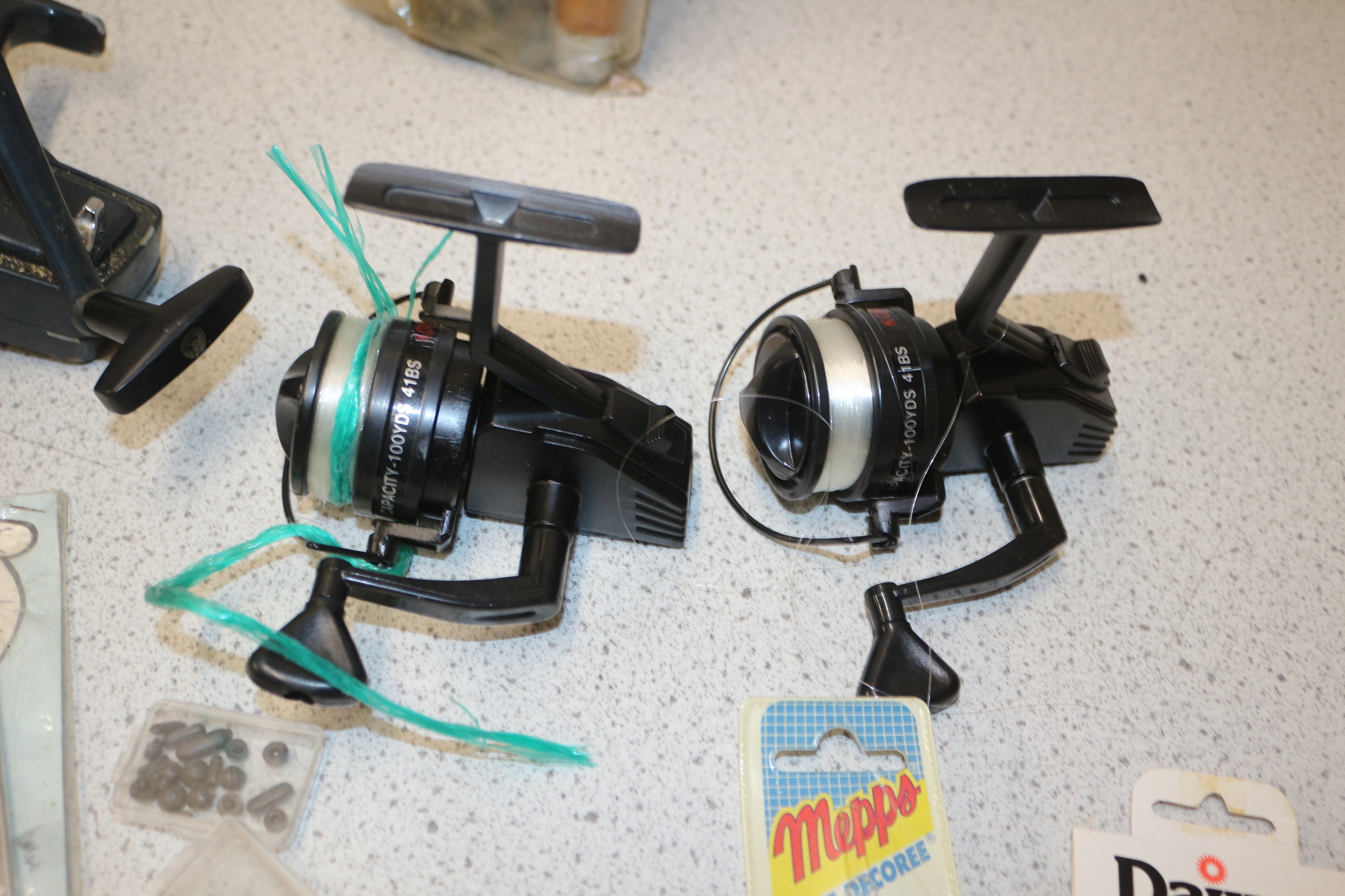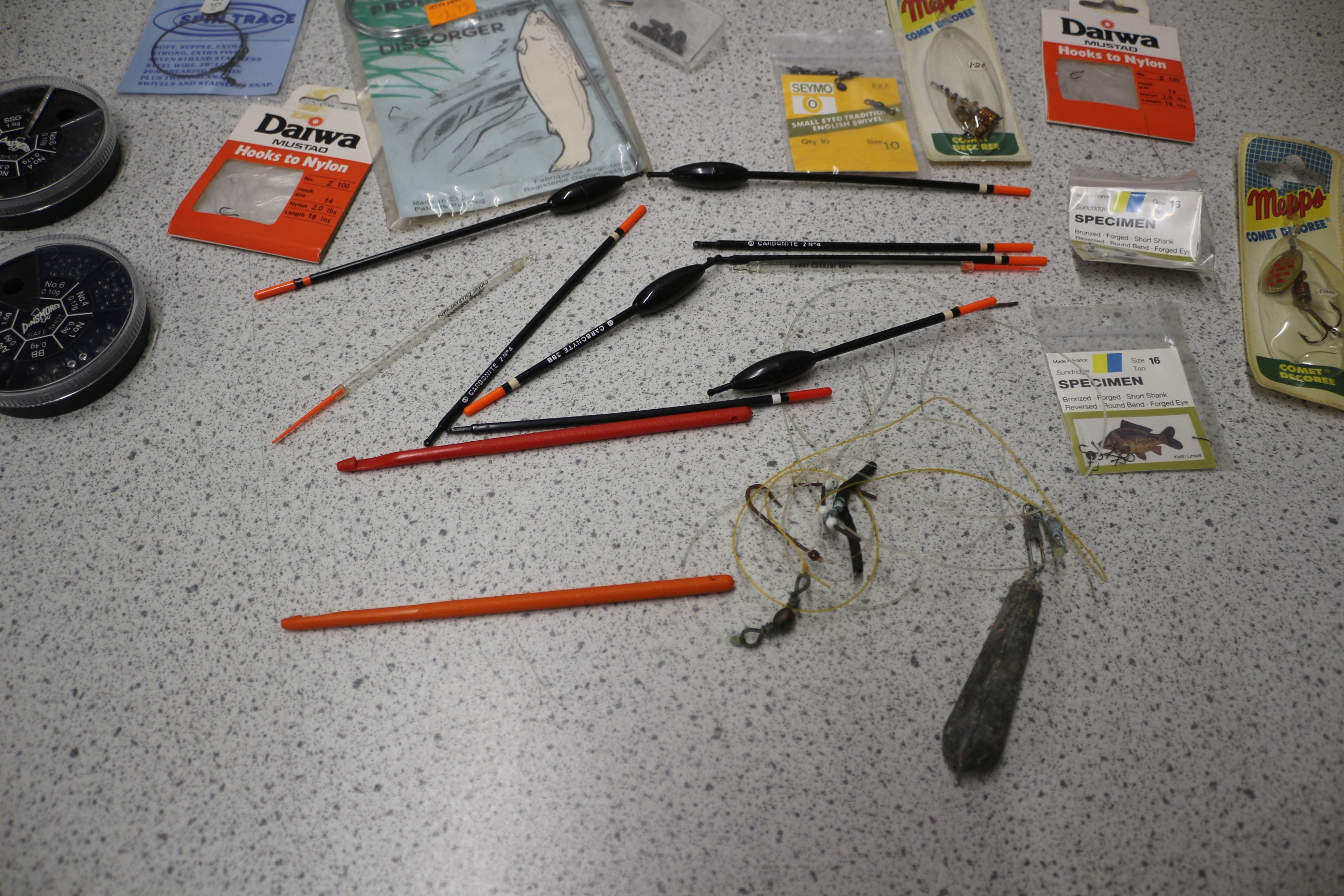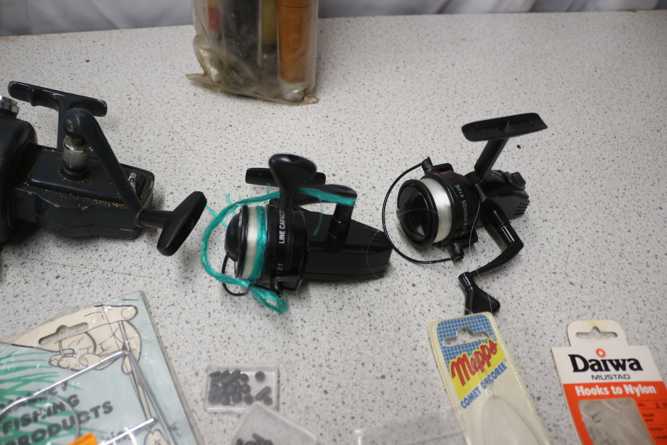 A collection of fishing rods (one Shakespeare 4500 70), three black fishing reels inc Daiwa (one MADE IN JAPAN, two CAPACITY 100YDS 4LBS), and various fishing tackle including Daiwa MUSTAD hooks, Mappo Comet lures, Drennan line, and a Fishing Products Disgorger AF
