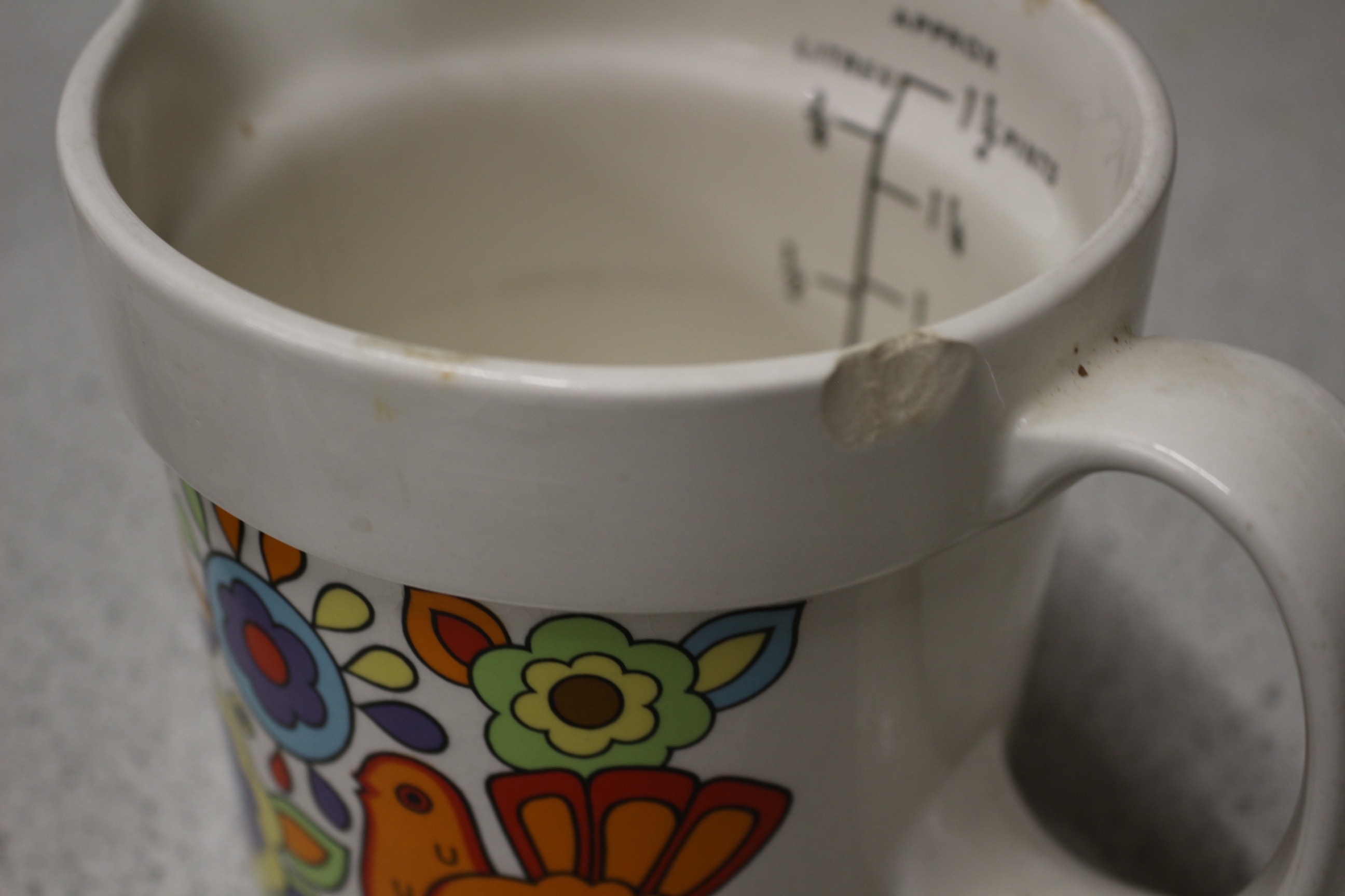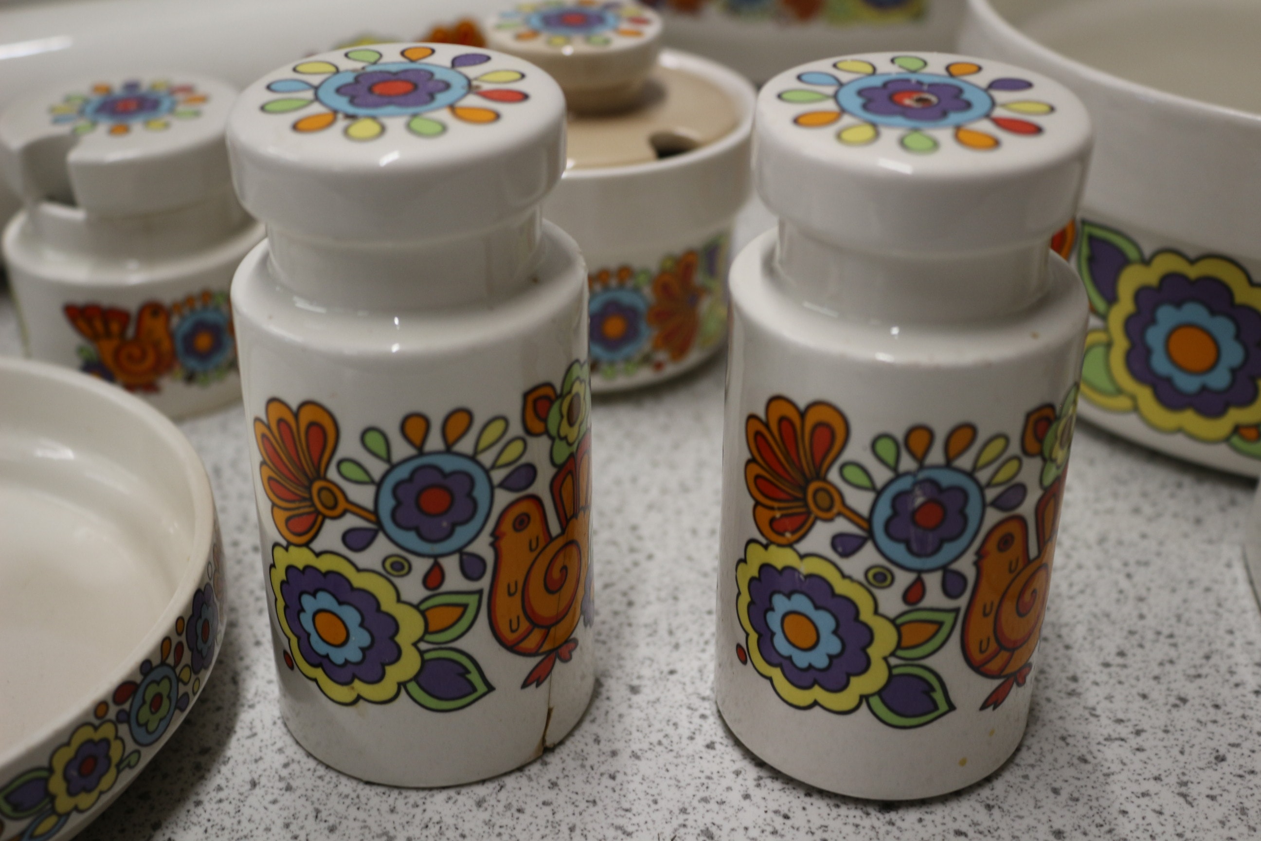 A set of 12 white ceramic kitchenware pieces by Lord Nelson Pottery in the ‘Gaytime’ pattern, including a measuring jug, butter dish, rolling pin, lidded casserole, two bowls, two medium shakers, a lidded condiment jar, two small shakers, and a shallow plate.