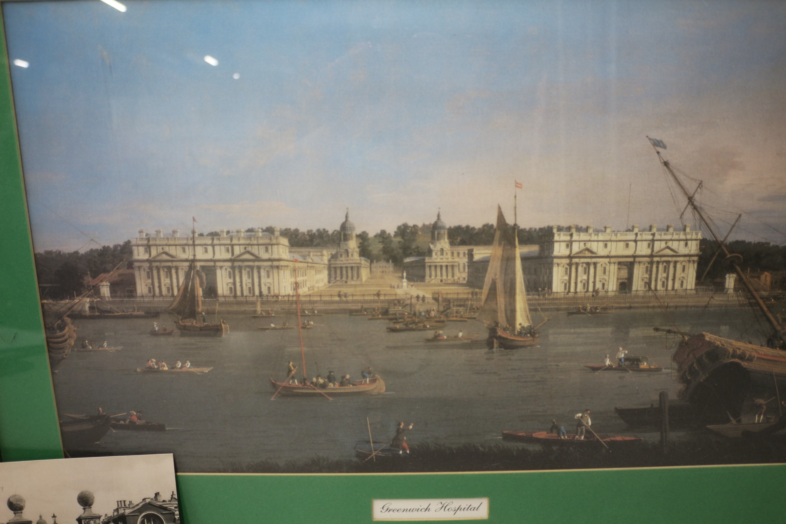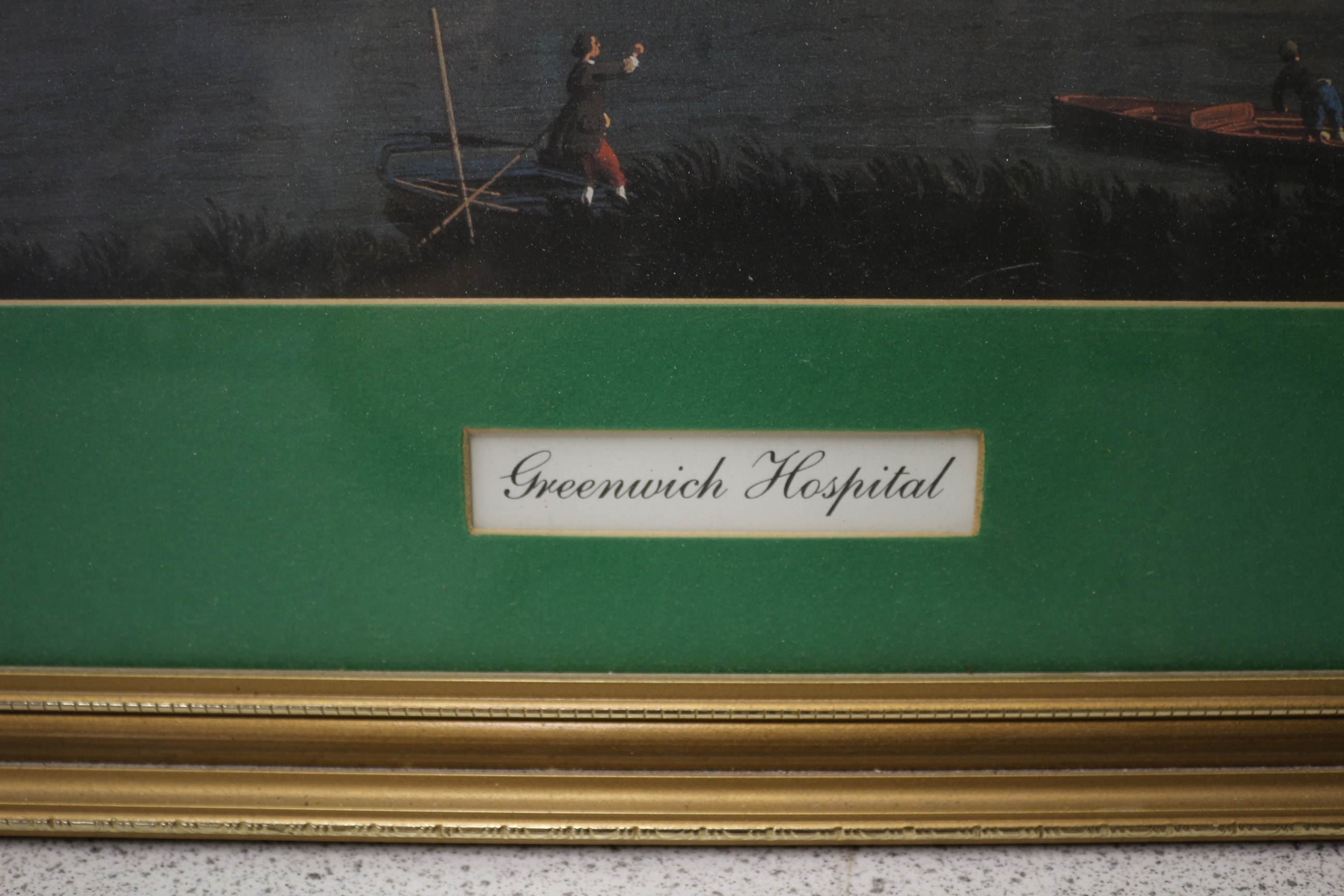 A gold-framed picture with a green mat depicting “Greenwich Hospital” with boats on a river, accompanied by a black-and-white photo labelled “Greenwich — Royal Naval College Gateway.” Picture 72×52.5cm