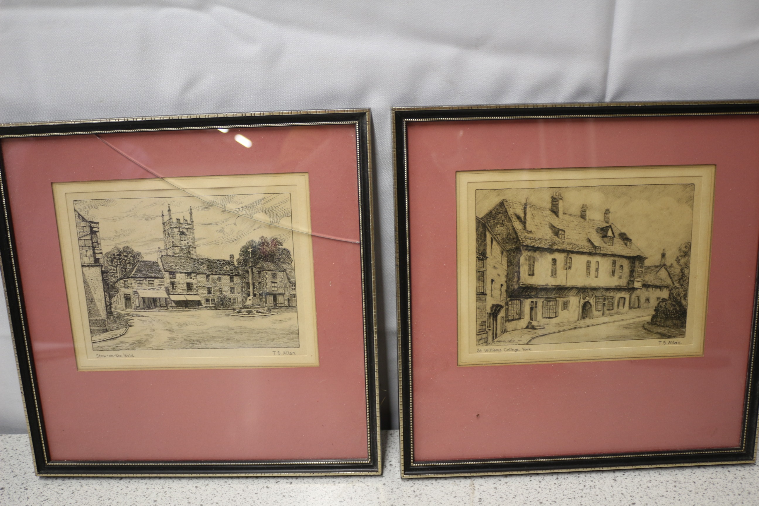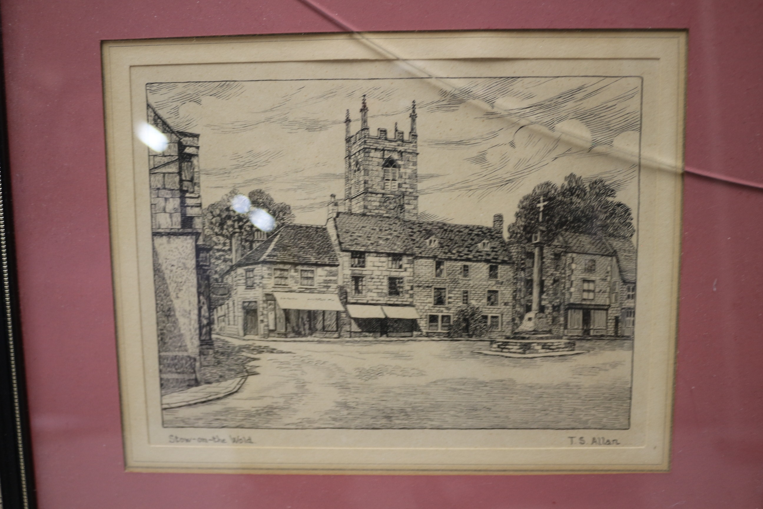 A pair of framed black and white architectural prints by T.S. Allan, titled ‘Stow-on-the-Wold’ and ‘St Williams College, York’, matted in dark pink and framed in dark brown/black. 26.5cmsq
