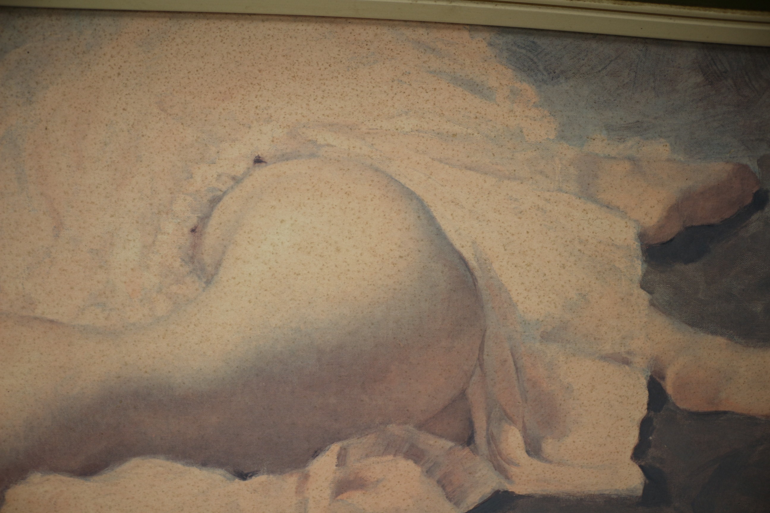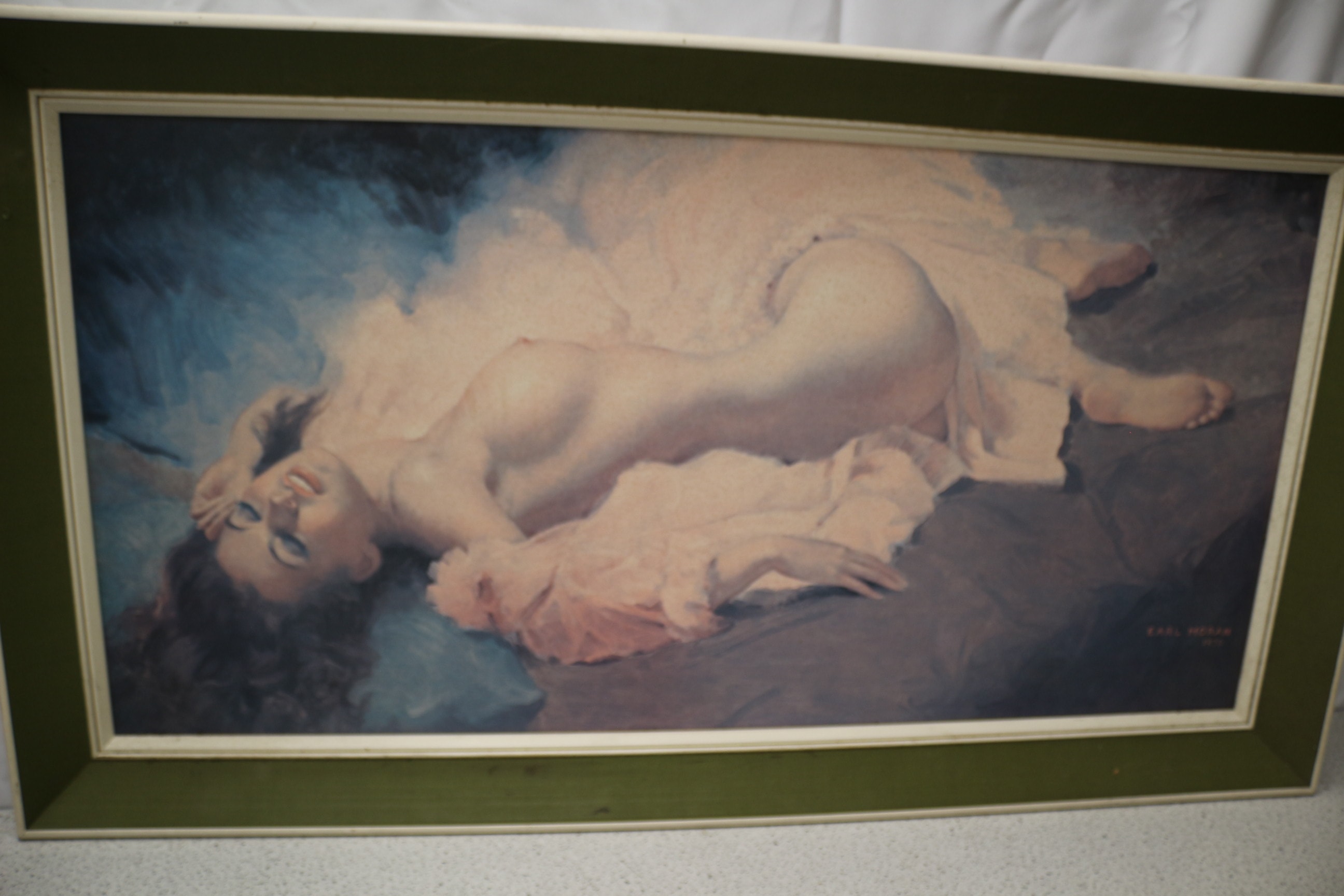 A single framed print depicts a reclining nude woman named Jynnifer draped in light pink and white fabric against a blue and grey background, housed in a green and white frame, and is signed “EARL MORAN 1970”. 102x56cm