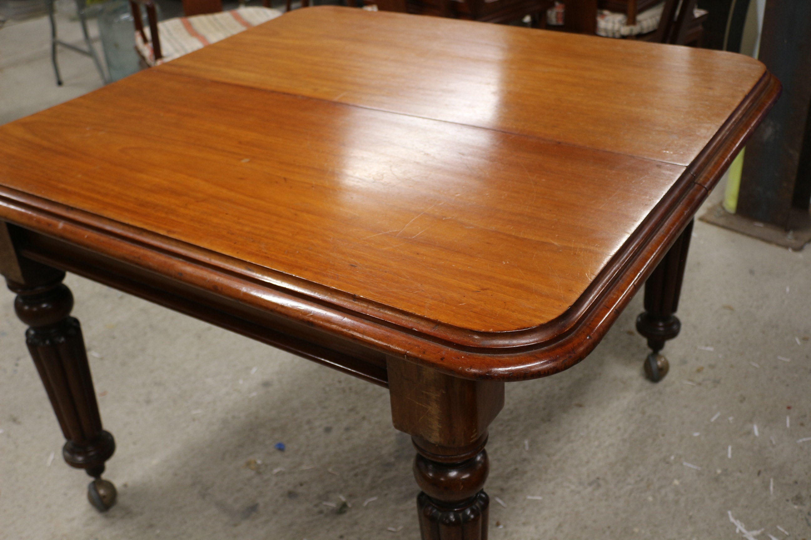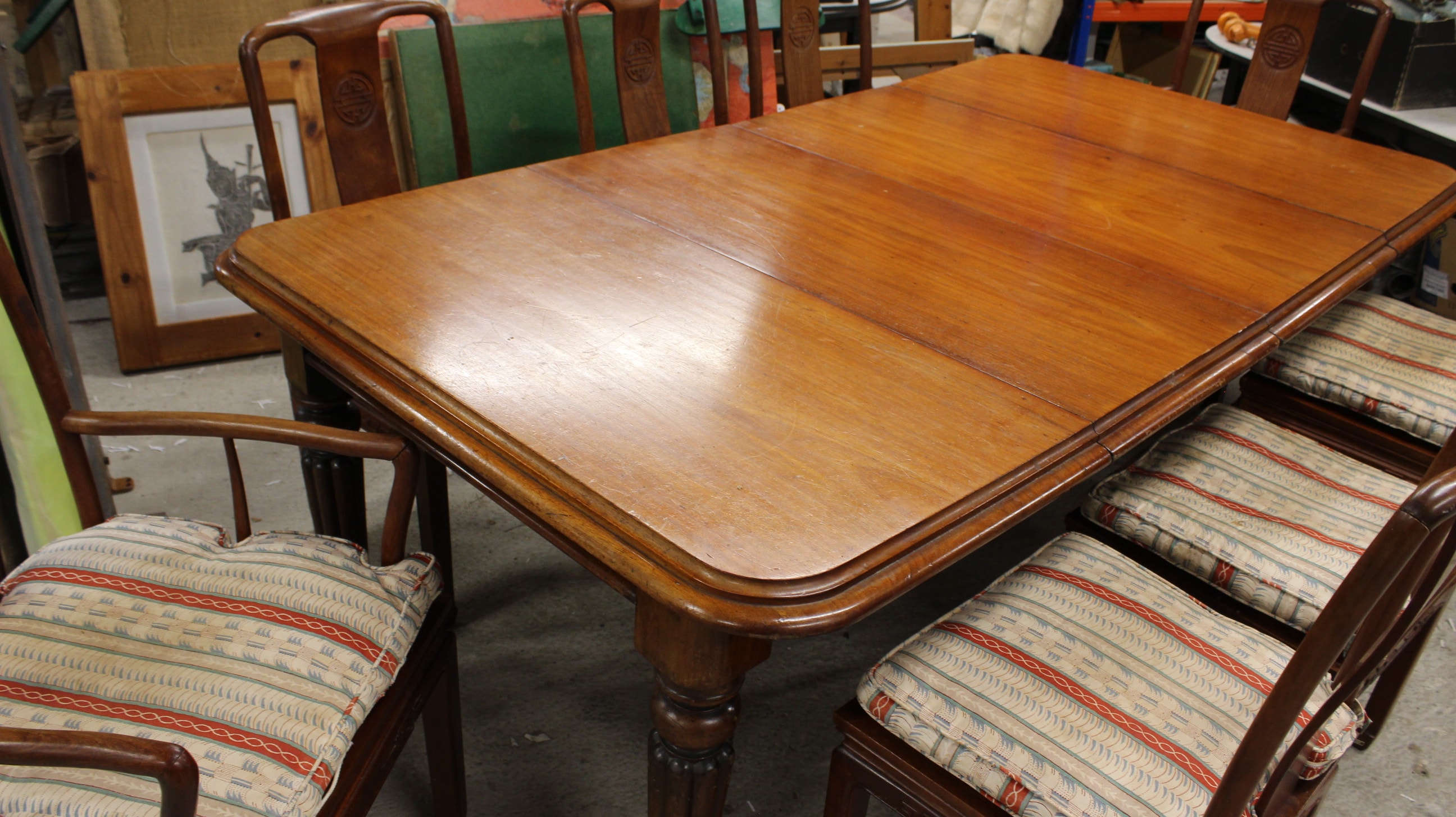 An extendable Early Victorian age wooden dining table with turned legs in a reddish-brown finish with central extension sections, accompanied by eight matching wooden dining chairs in reddish-brown, featuring carved “Shou” character motifs on their backrests and geometric “leiwen” patterns on the aprons, with cream-coloured cushions displaying blue and red striped patterns. Some chairs have had a basic repair. Extended 207x 115cm