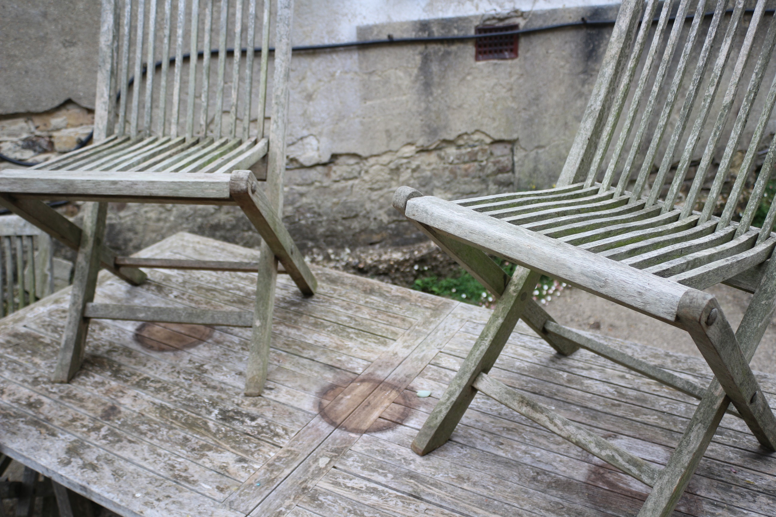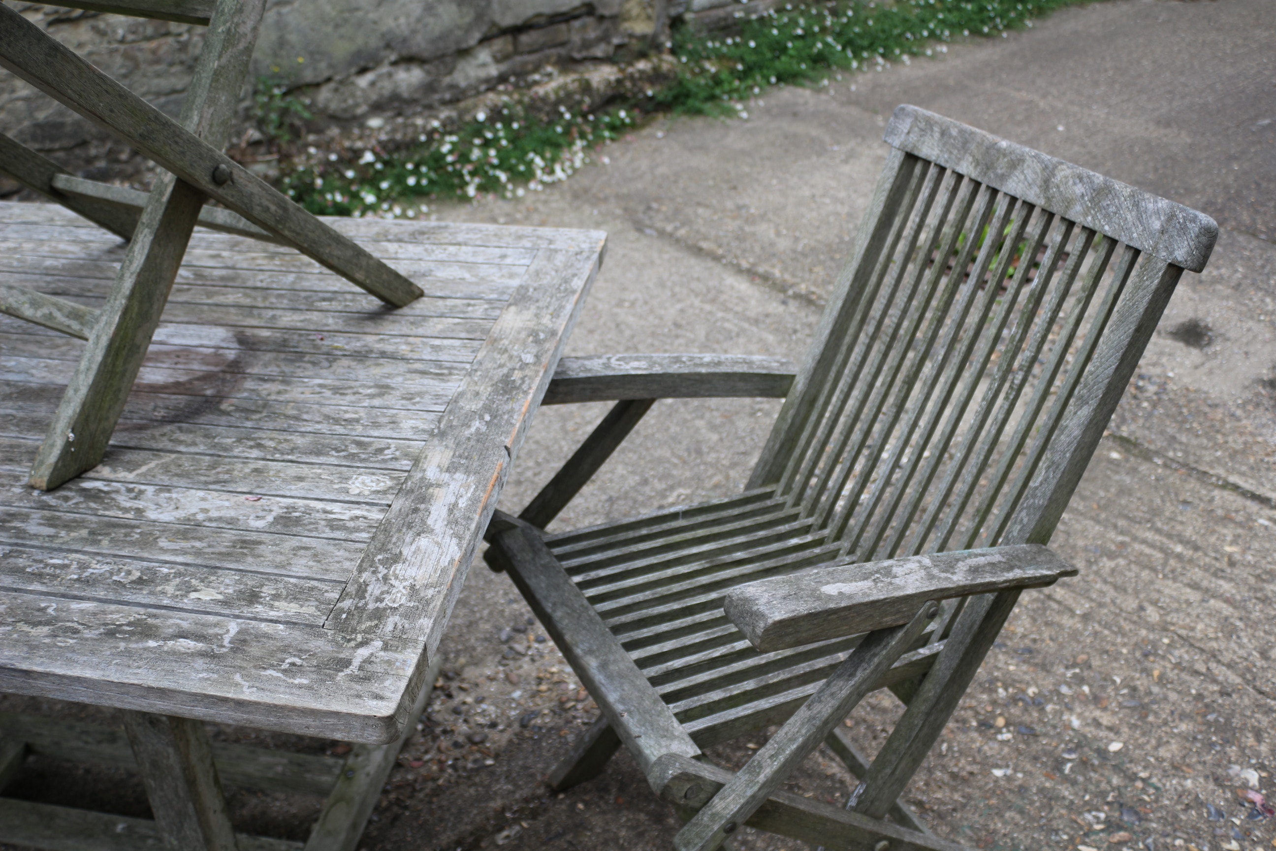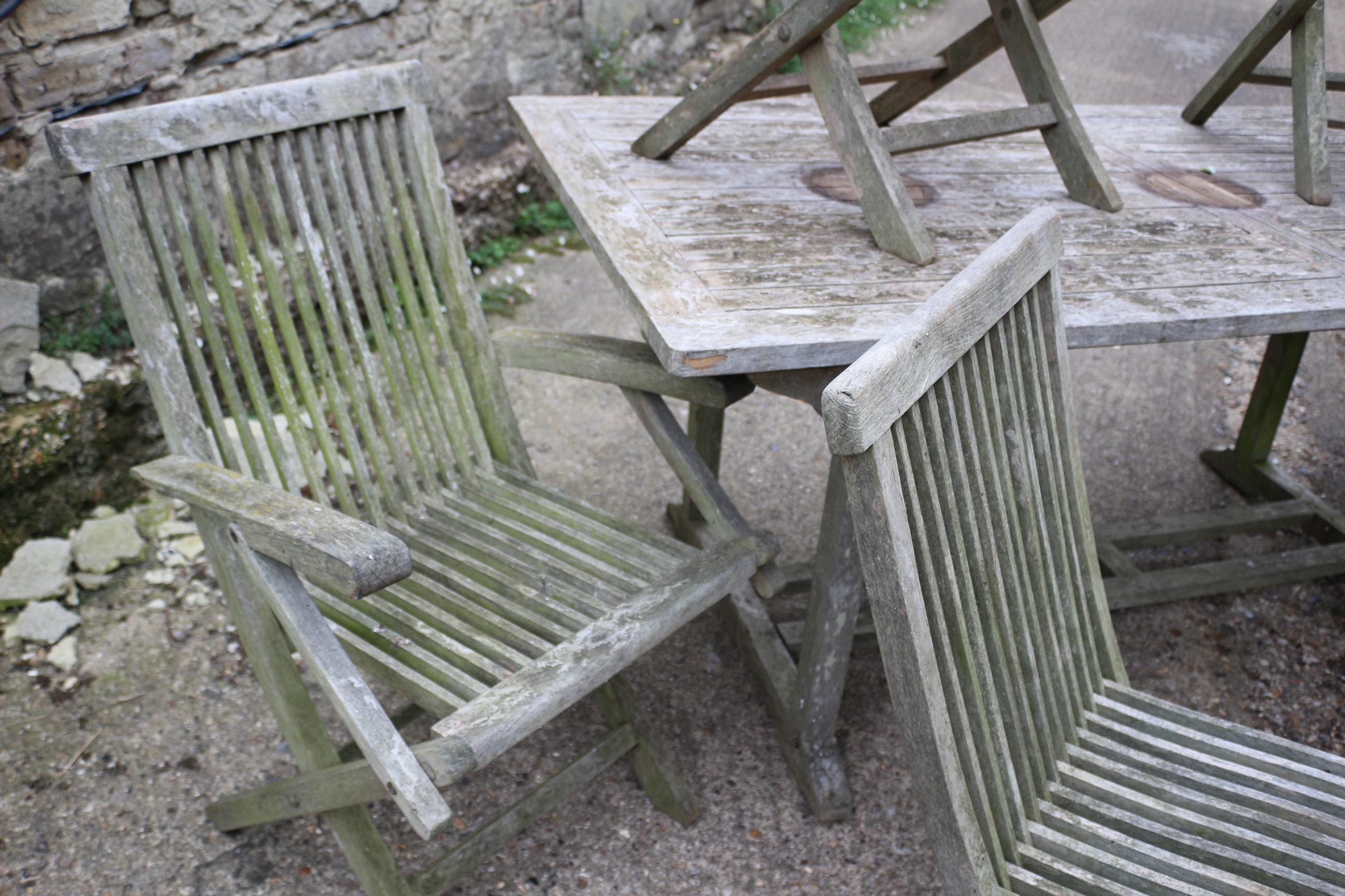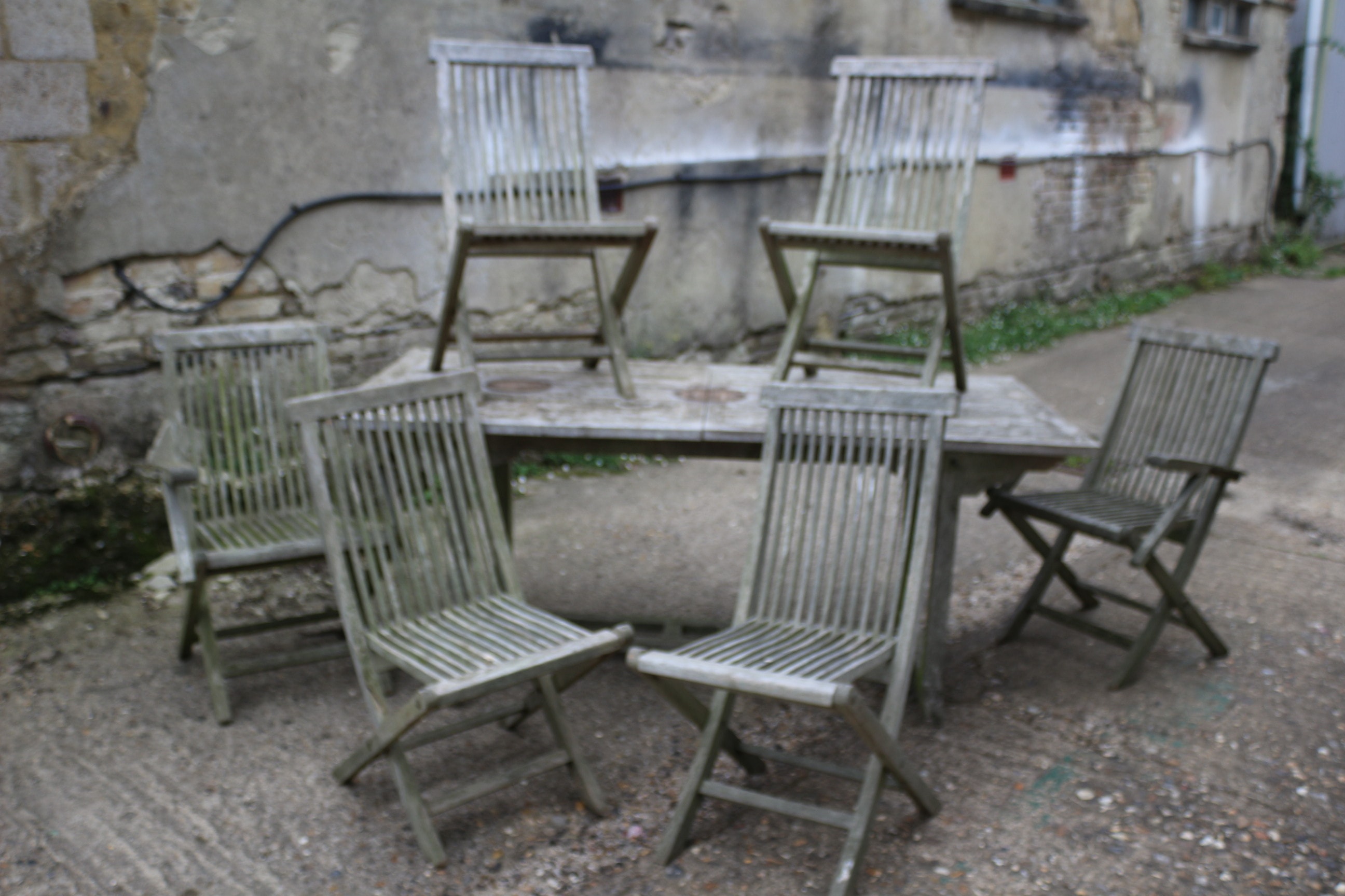 A weathered greyish-brown slatted wooden rectangular dining table and six matching folding chairs. 181x90cm