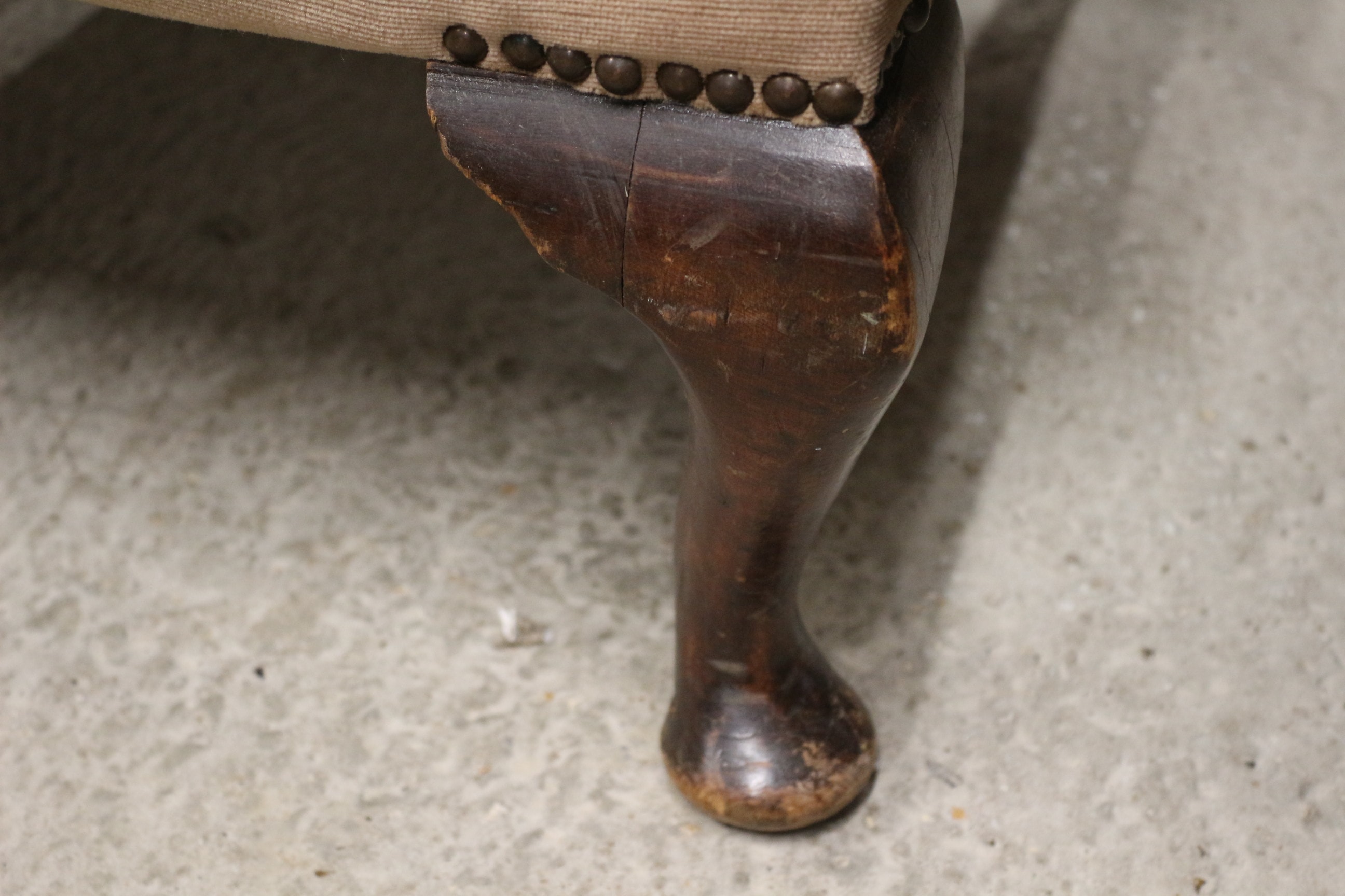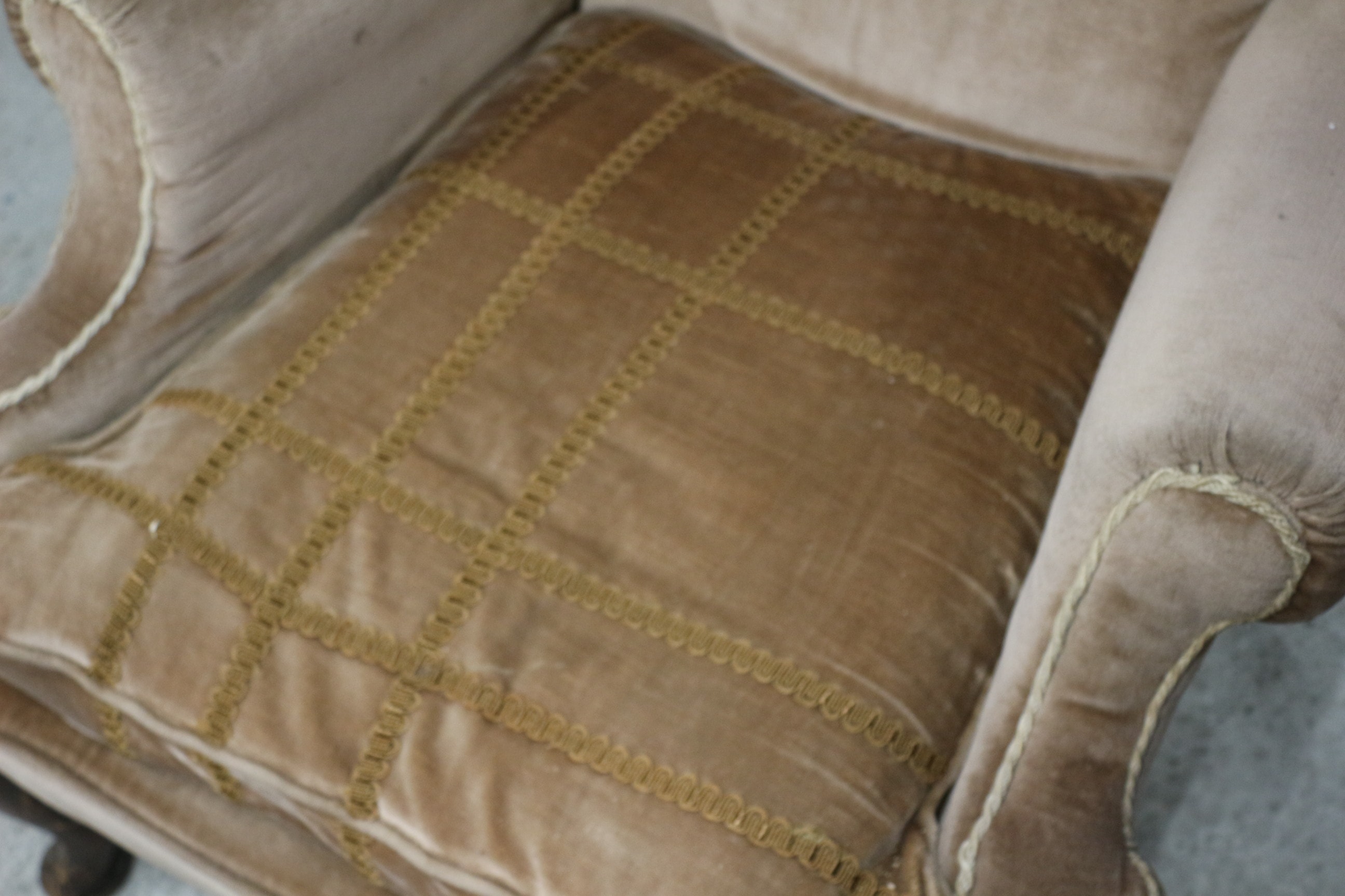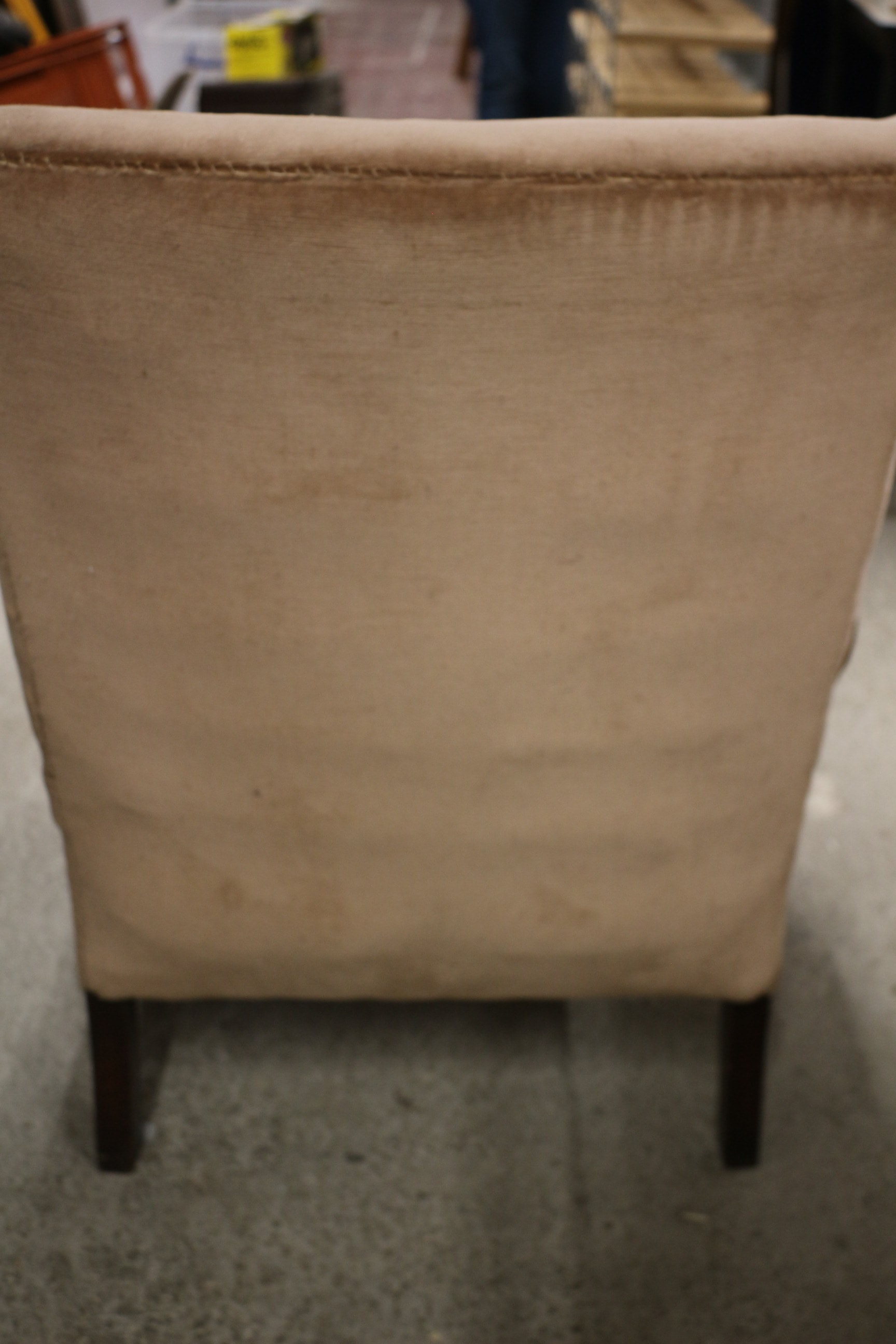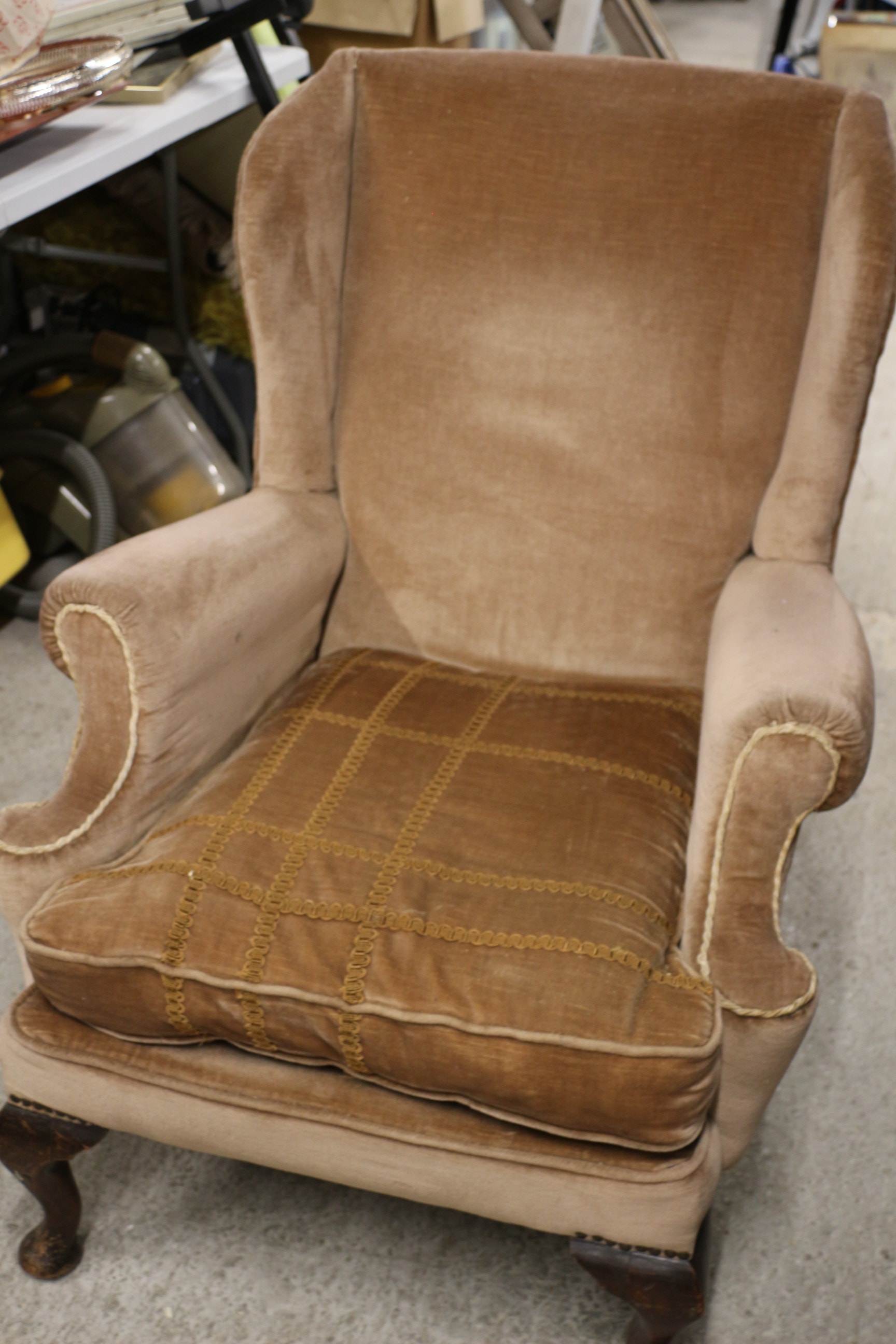 A light brown velvet upholstered wingback armchair with dark wooden legs and a darker brown patterned seat cushion. AF