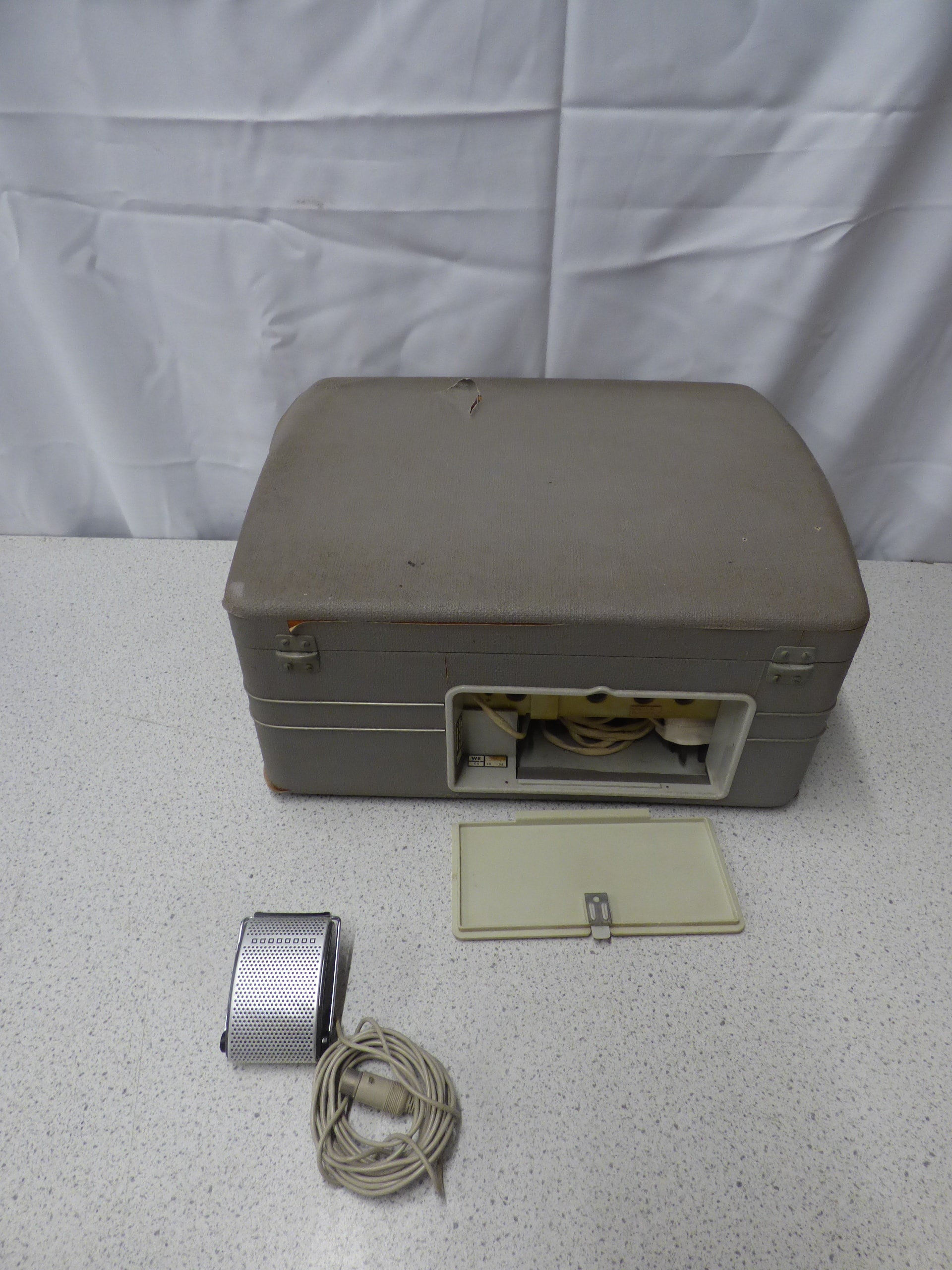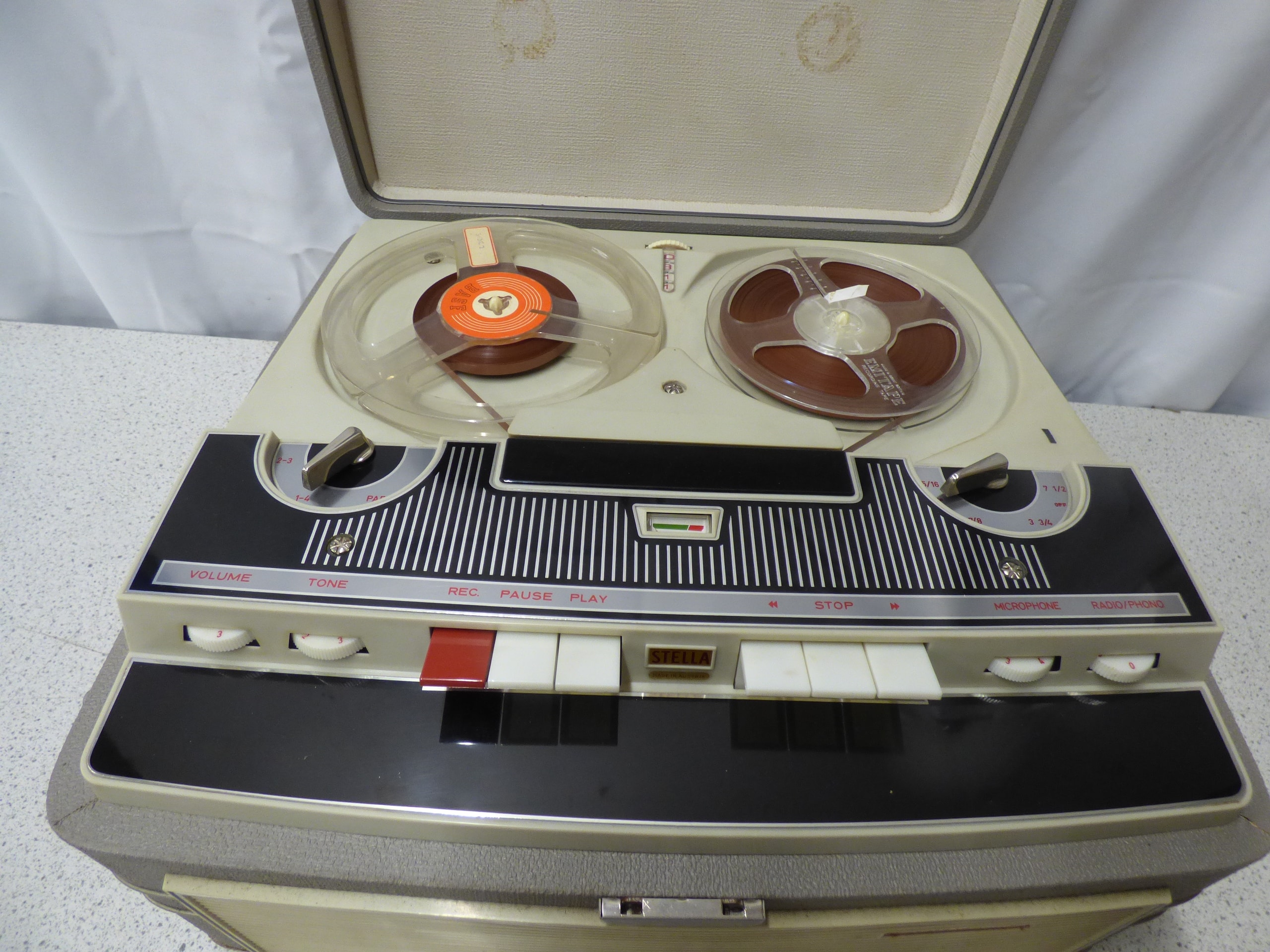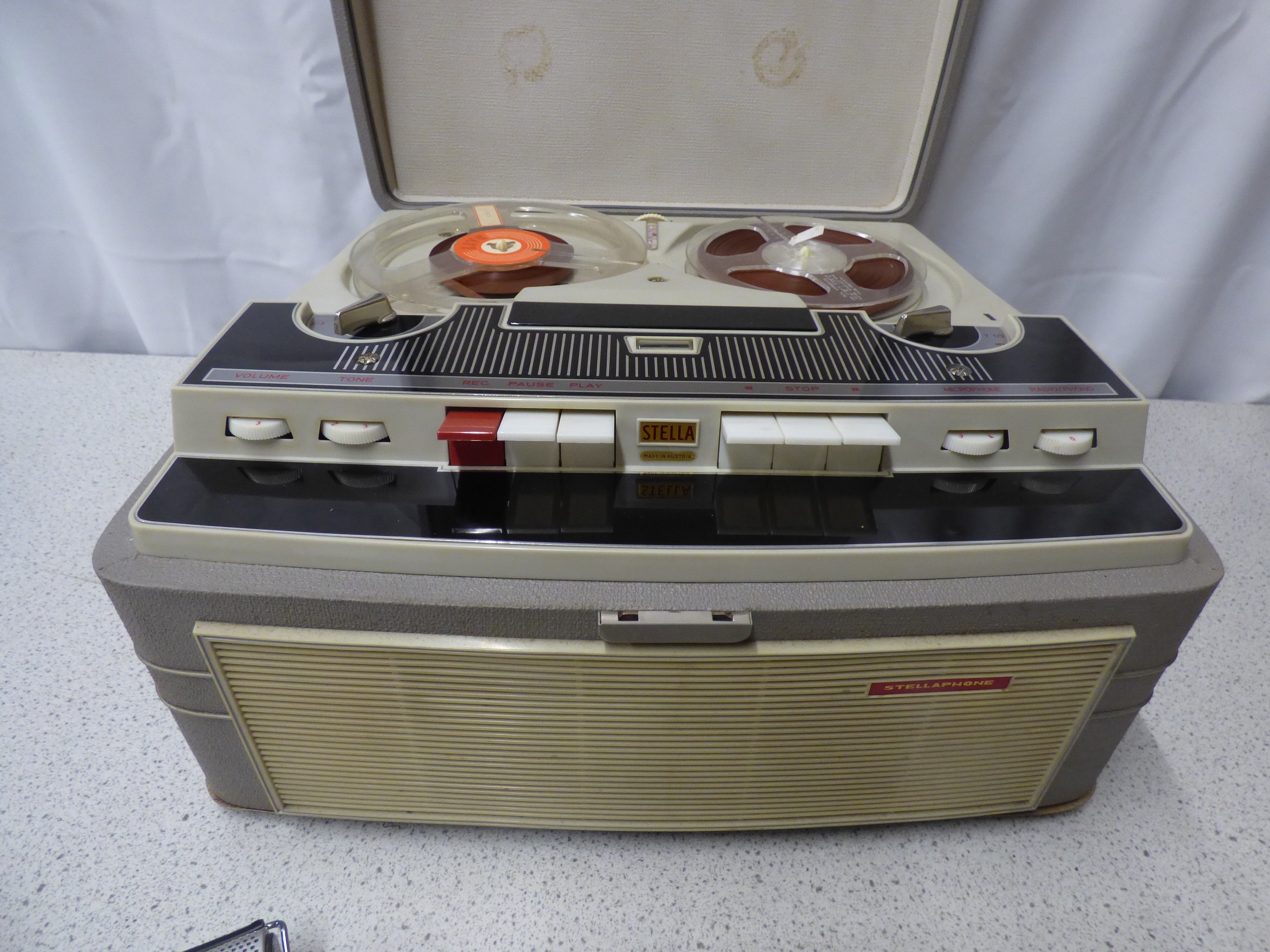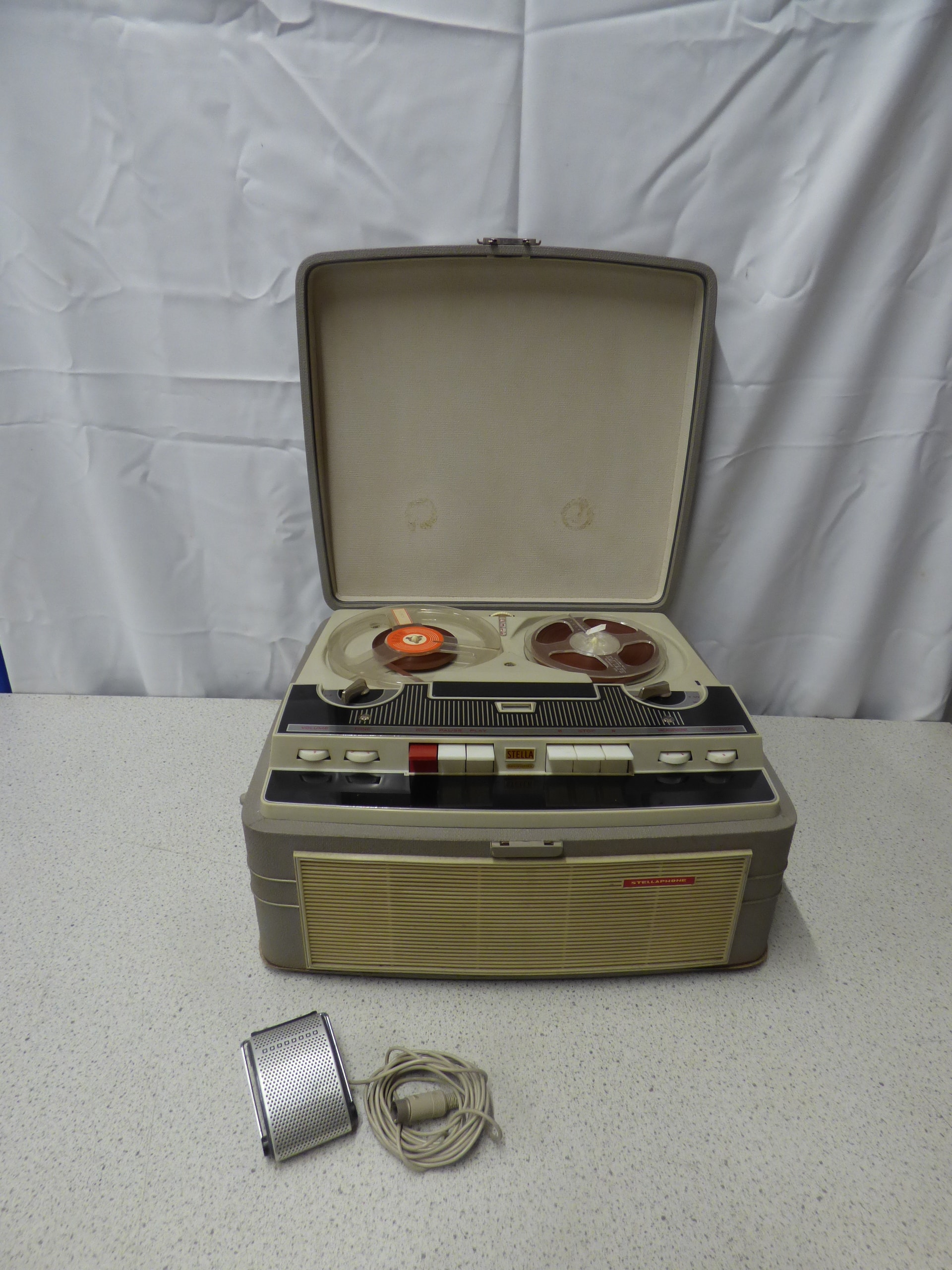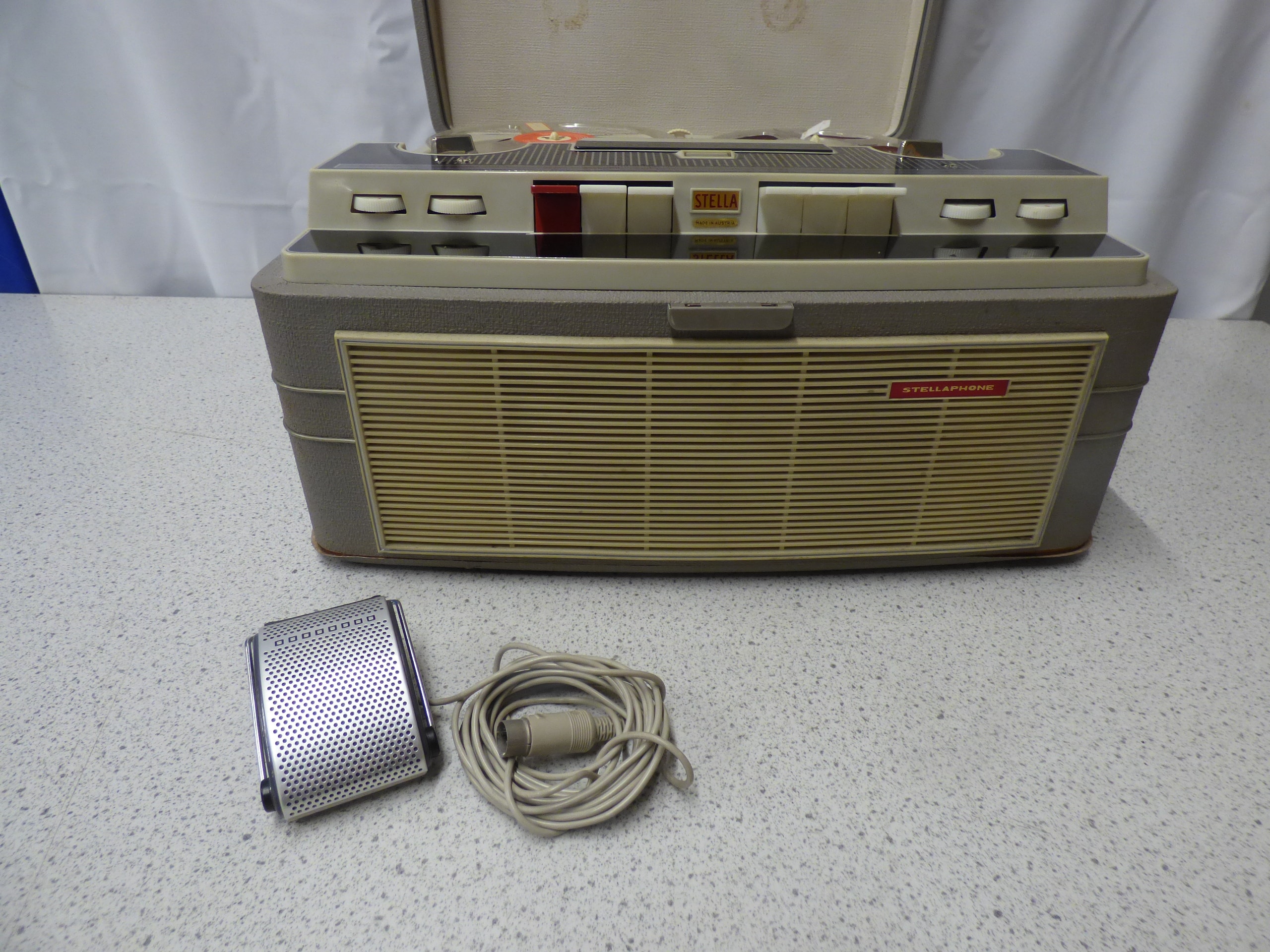 A grey cased Stellaphone Stella Automatic reel-to-reel tape recorder, predominantly cream and black with red accents, accompanied by a silver and beige Stellaphone Dynamic microphone. Untested