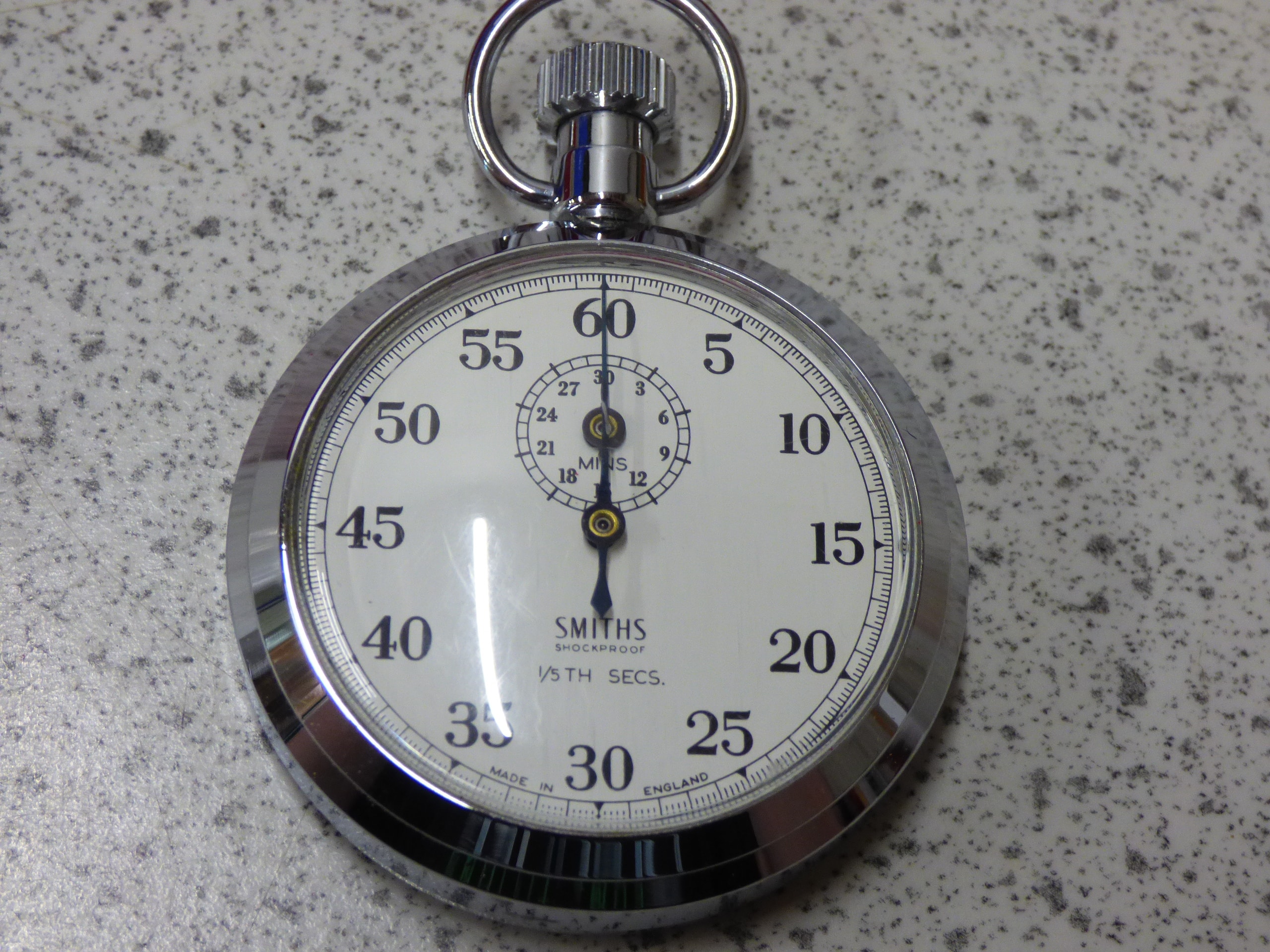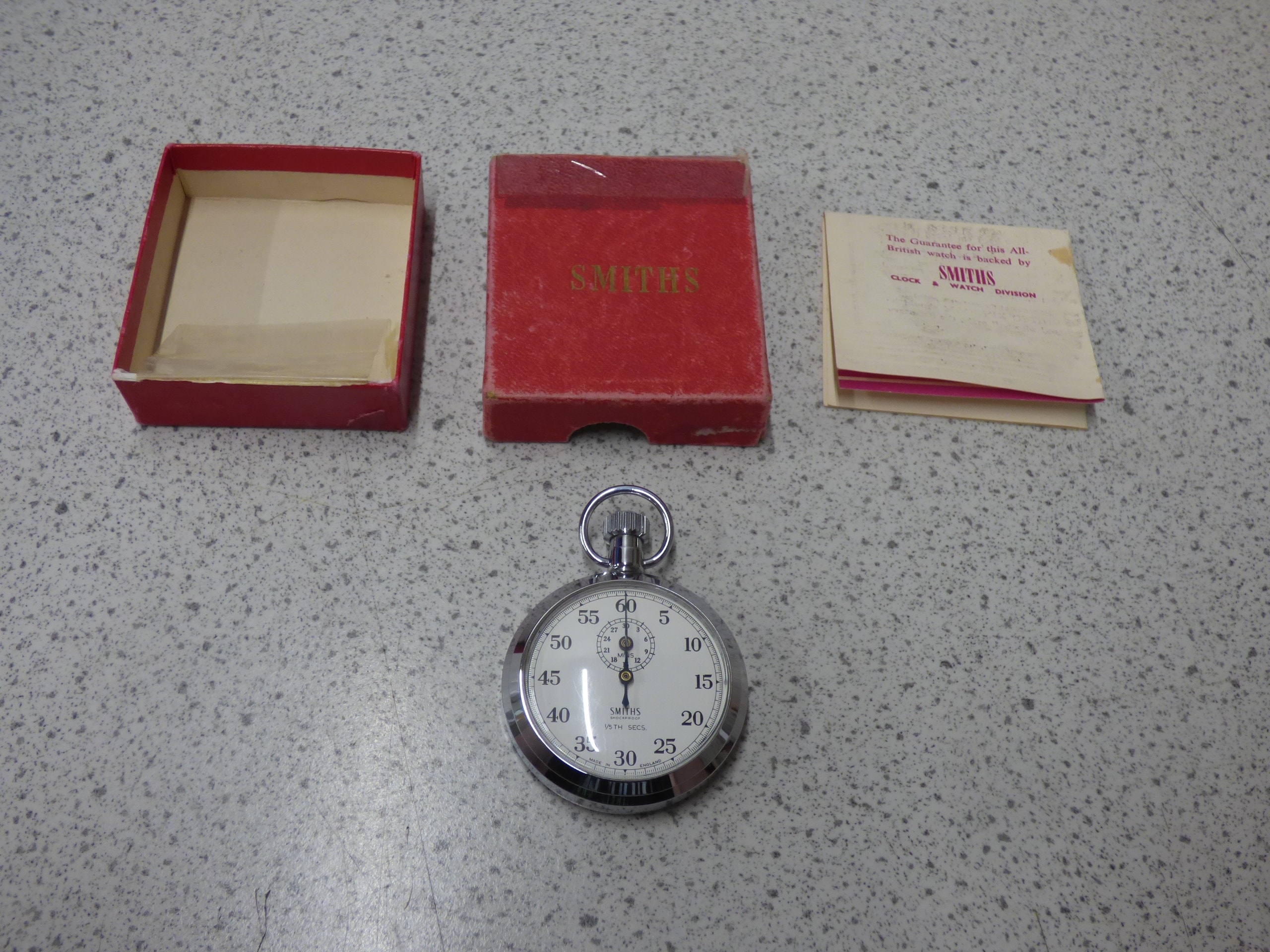 A silver-toned Smiths Shockproof 1/5th Secs. stopwatch features a white dial marked “SMITHS”, “SHOCKPROOF”, and “MADE IN ENGLAND”, accompanied by its red “SMITHS” box and a beige Smiths Clock & Watch Division guarantee leaflet.
