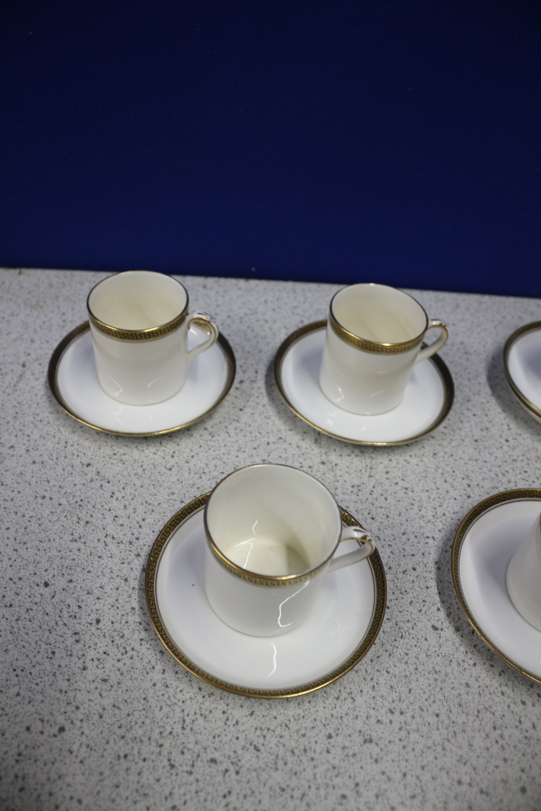 A set of five Foley China white ceramic espresso cups and five matching saucers, all with a gold Greek key pattern band. Plus 1 extra saucer