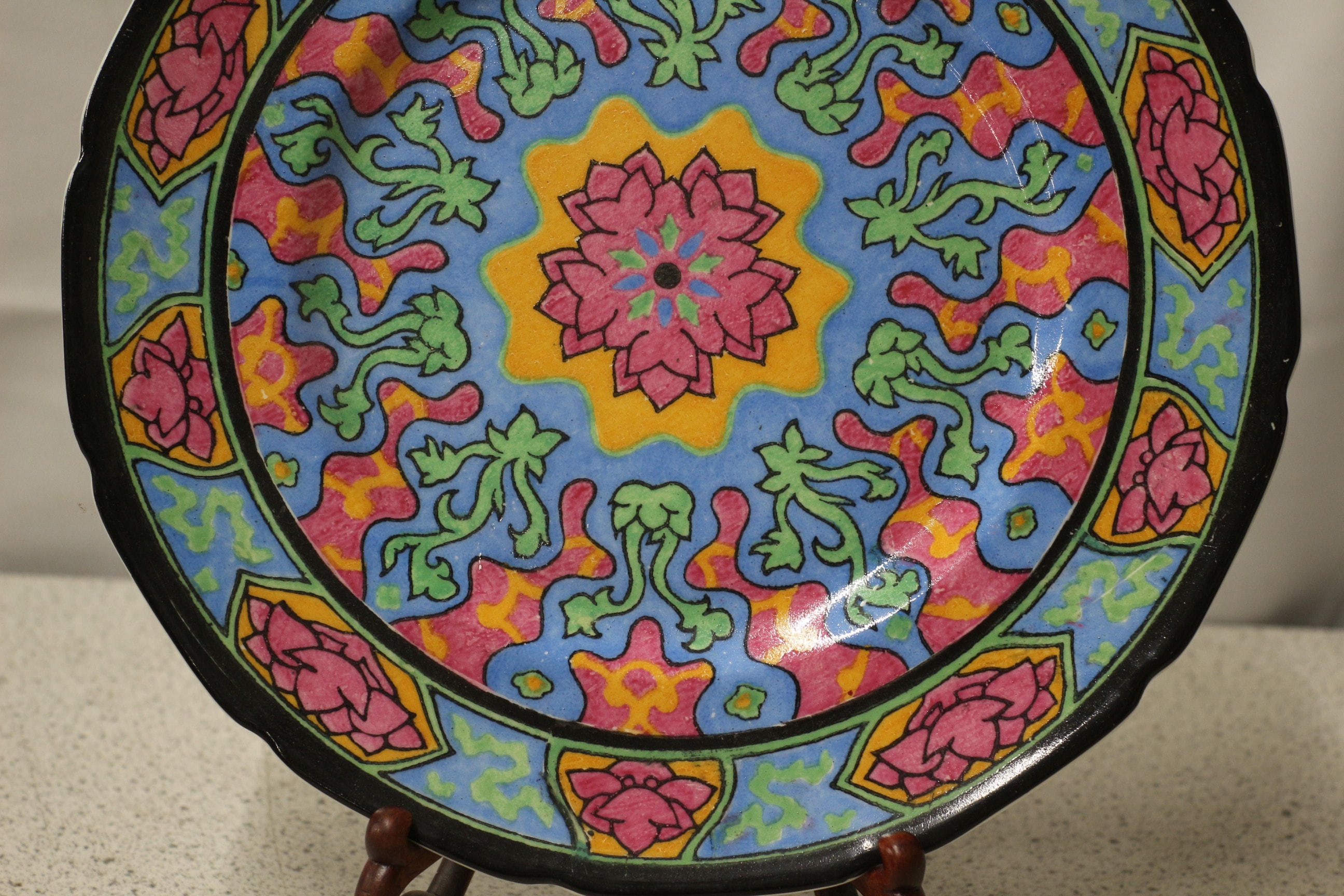 A multi-coloured Rosette decorative plate, primarily blue, pink, yellow, and green with a black rim, bearing a green ‘ROYAL DOULTON ENGLAND’ backstamp with a lion and crown, and the number ’11’ in black below it. 10.5″
