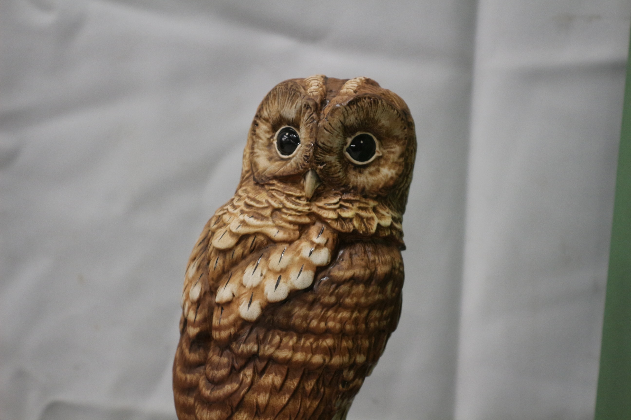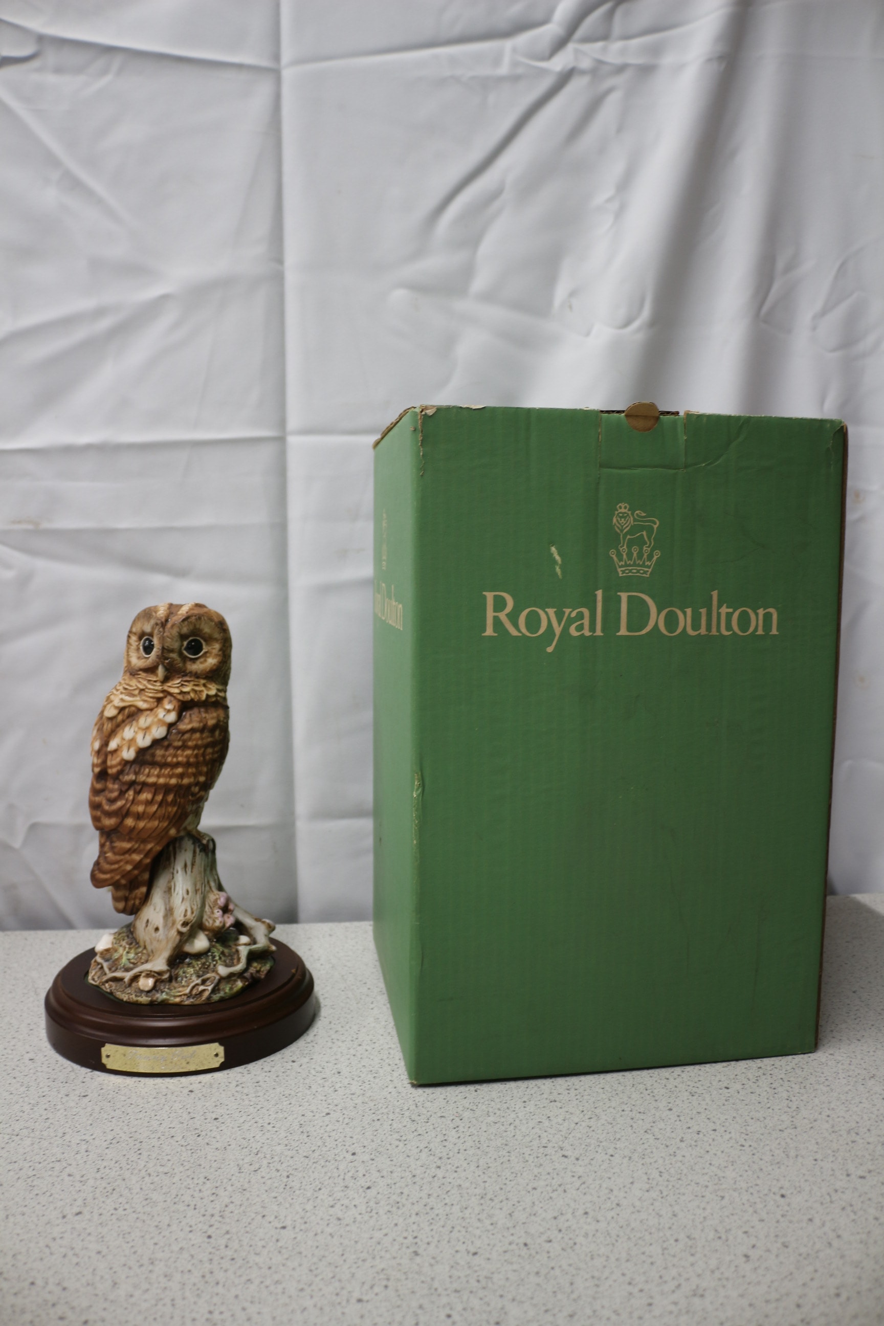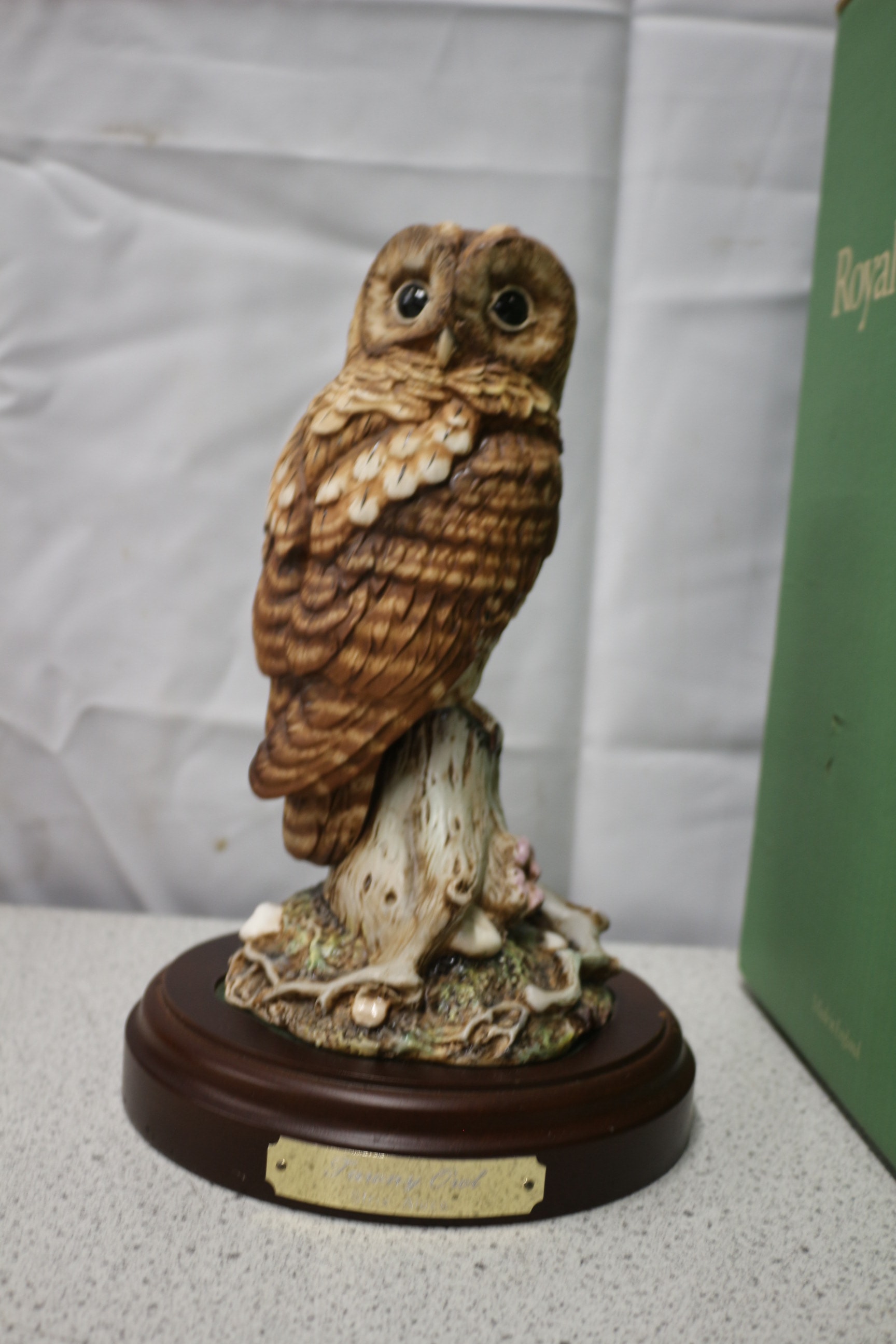 A brown, tan, and cream Tawny Owl (Strix Aluco) figurine on a dark brown wooden base with a brass plaque inscribed ‘Tawny Owl Strix Aluco’, accompanied by its green Royal Doulton branded cardboard box.